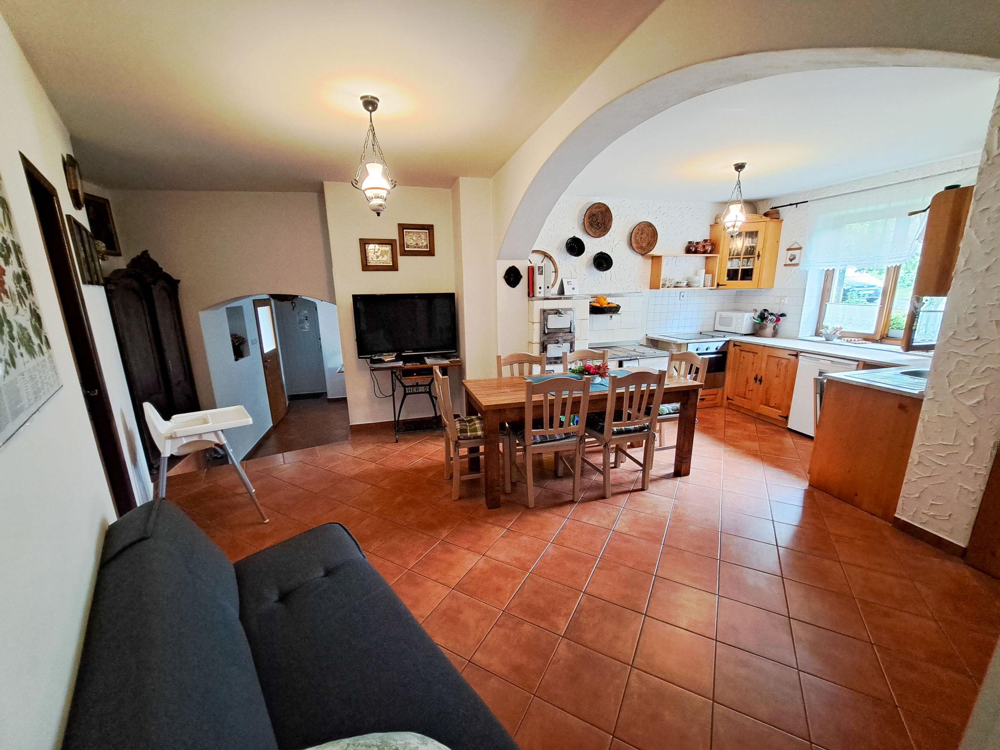 5-room house 170 m2. Object suitable for 7 adults + 1 child. Very beautiful and rustic furnishings: 1 room with 1 bed, 1 double bed, satellite TV and radio. 1 room with 1 bed and 1 pull-out bed (2 pers.). 1 room with 1 double bed. Kitchen-/living room (oven, dishwasher, 4 ceramic glass hob hotplates, microwave, electric coffee machine) with dining table, tiled stove. Bathroom, sep. WC with corner bath. Floor heating. Facilities: washing machine, children's high chair. Internet (WiFi, extra). Please note: suitable for families. Non-smoking house. Communal room, 18 m2, open fire, vaulted ceilings. Sauna on request (extra). Swimming pool located in the renovated part of the farm buildings with vaulted ceilings and is directly accessible from the house, equipped with shower/bidet/WC. 10% discount for 2 week stays.