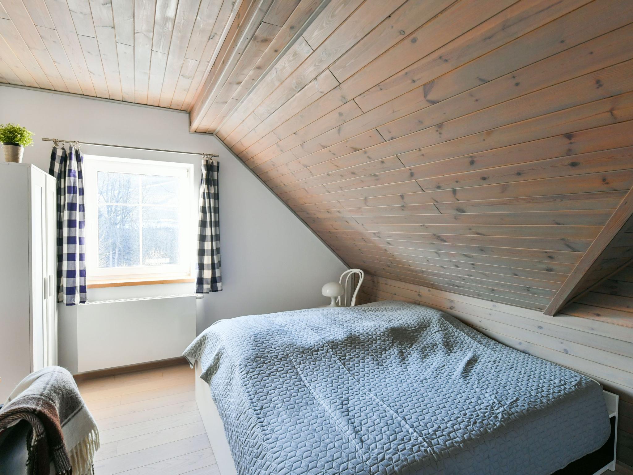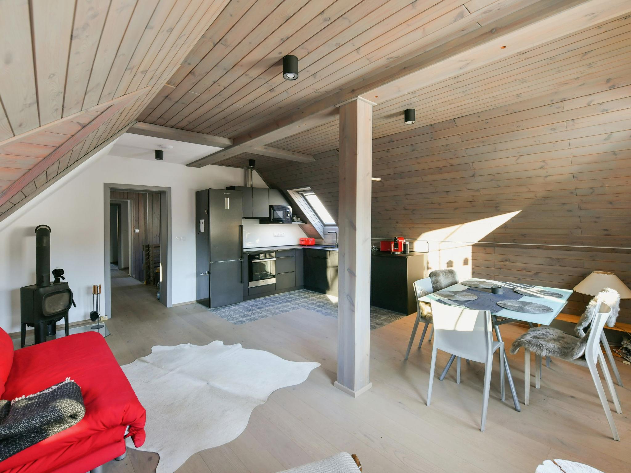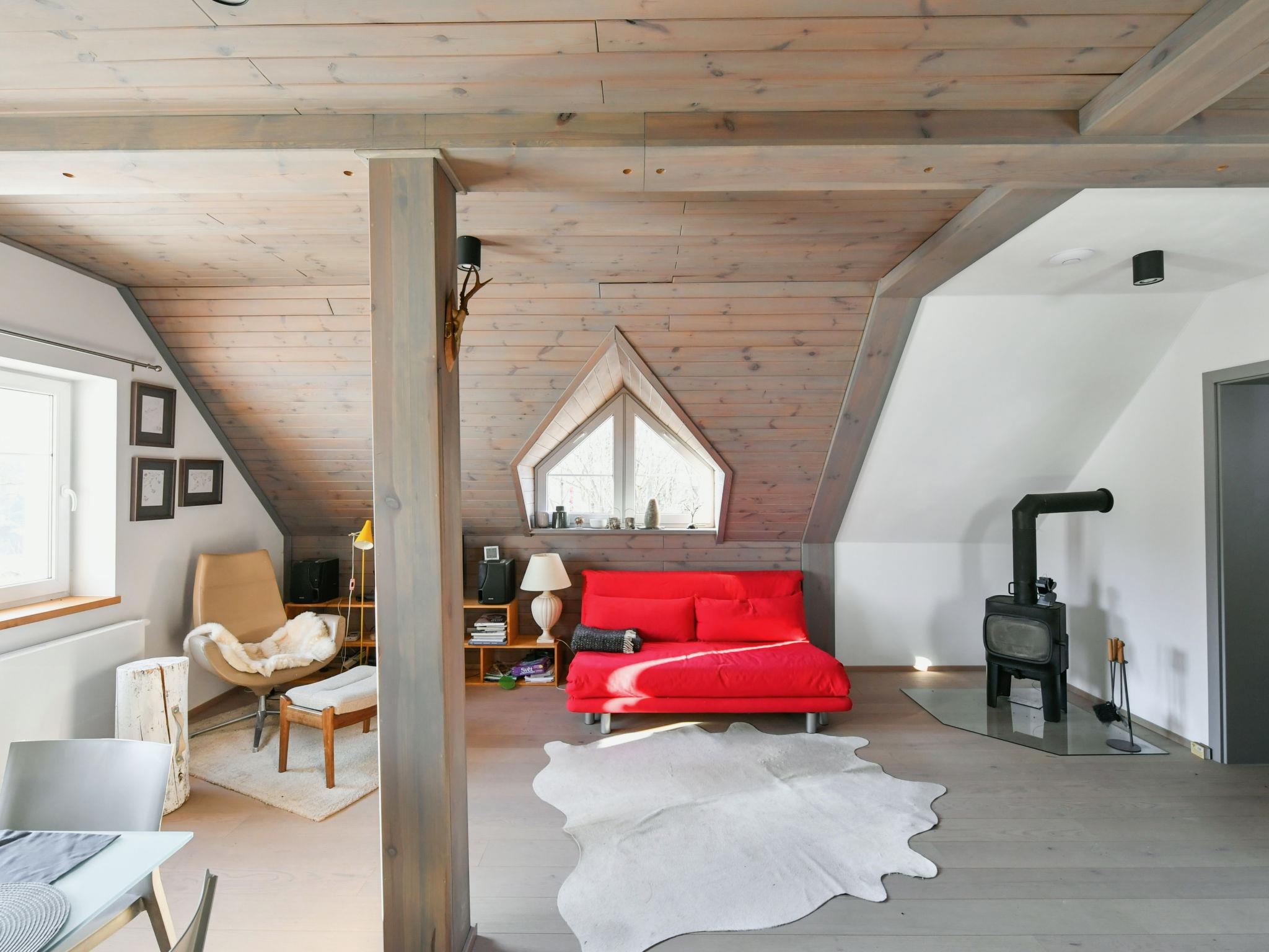 4-room apartment 100 m2, on the top floor. Very beautiful and tasteful furnishings: living/dining room with sloping ceilings with rooflight with dining table, digital TV and wood-burning stove. 2 rooms, each room with 2 beds. 1 room with 1 double bed. Kitchenette (oven, dishwasher, 4 induction hot plates, toaster, microwave, electric coffee machine). Shower/bidet/WC, sep. WC. Beautiful view of the countryside and the forest. Facilities: sauna. Internet (WiFi, free). Parking (2 cars) at the house. Please note: suitable for families. Non-smokers only. Smoke alarm, fire extinguisher.