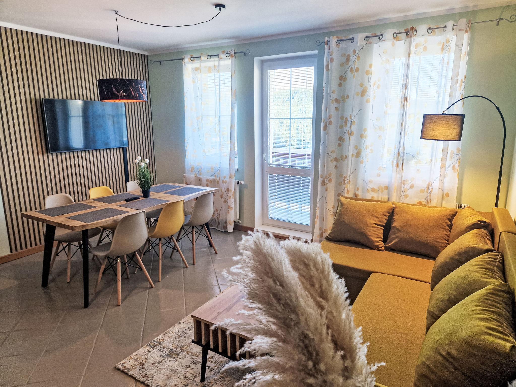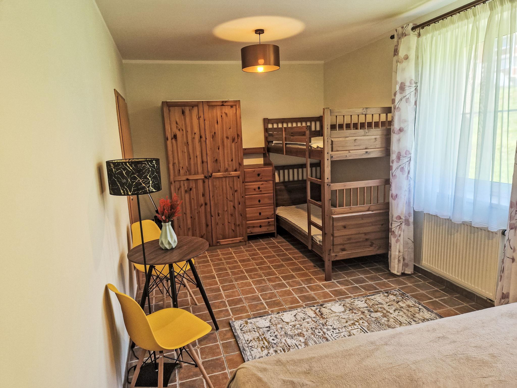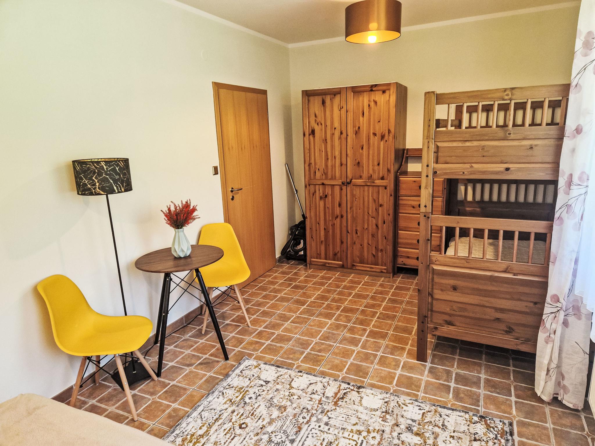 2-room apartment on 1st floor. Renovated in 2024: entrance hall. Living room with 1 double sofabed and TV. 1 room with 1 x 2 bunk beds, 1 double bed. Kitchenette (dishwasher, 4 ceramic glass hob hotplates, kettle, freezer, electric coffee machine, Capsules for coffee machine (Nespresso)). Shower/WC. Electric heating, floor heating. Covered balcony. View of the countryside. Facilities: Internet (WiFi, free). Please note: suitable for families. Non-smokers only. 1 small pet/ dog allowed.