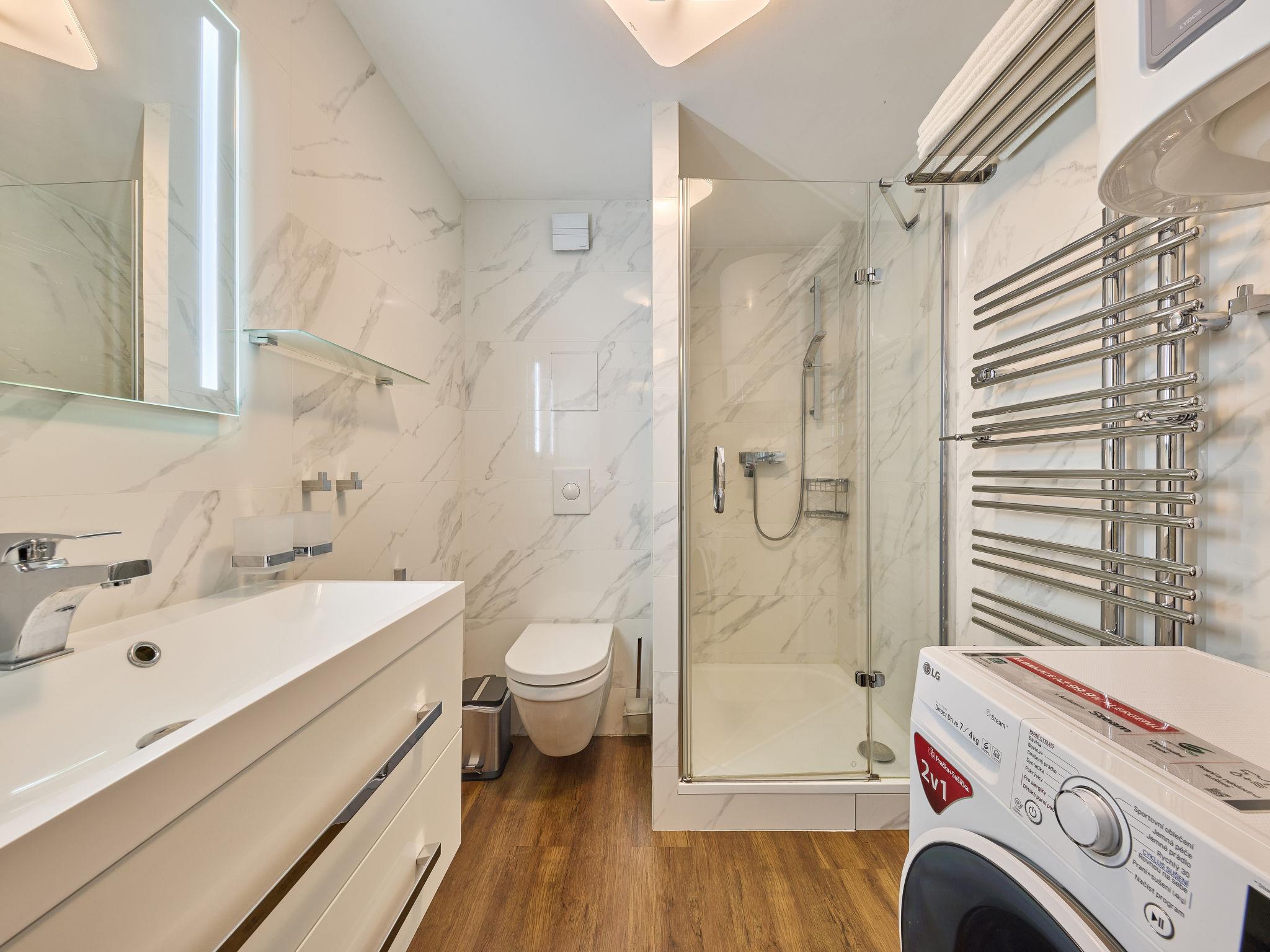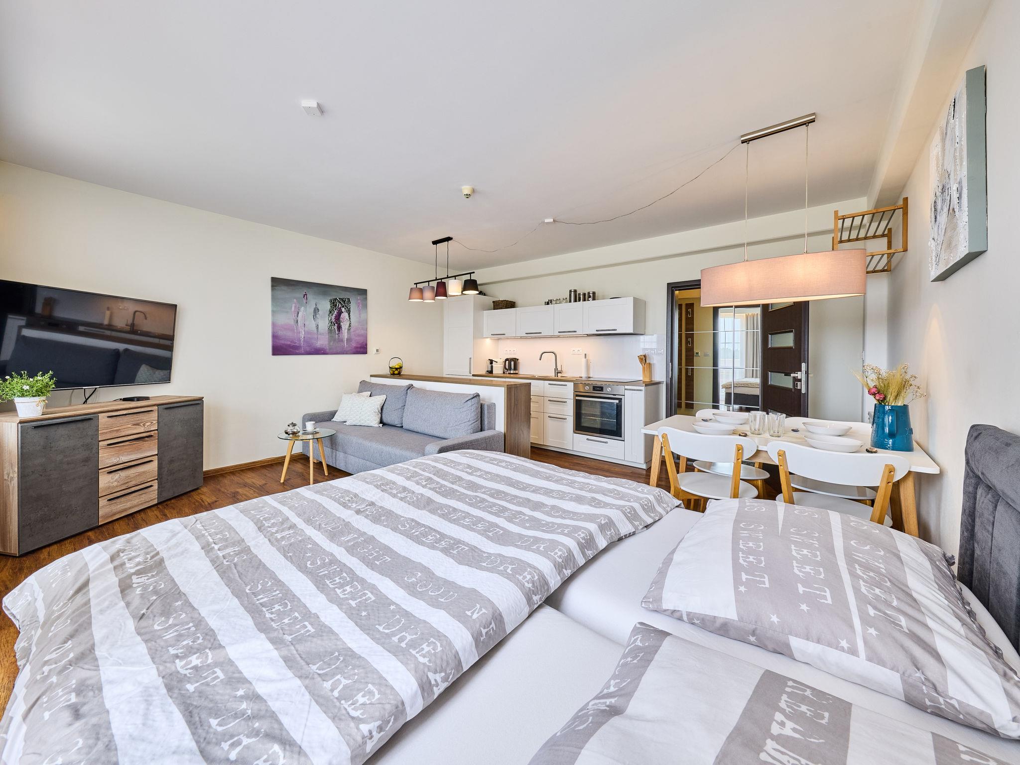 "Horní Mísecky", 1-room apartment 35 m2, on the ground floor. Renovated in 2018, modern and stylish furnishings: living/sleeping room with 1 double sofabed (1 x 140 cm), 1 double bed, dining table and satellite TV. Kitchenette (oven, dishwasher, 4 ceramic glass hob hotplates, toaster, kettle, microwave, freezer, electric coffee machine). Shower/WC. Electric heating. Balcony. Balcony furniture. Facilities: washing machine. Internet (WiFi, free). Parking (roofed). Please note: suitable for families. Non-smokers only.