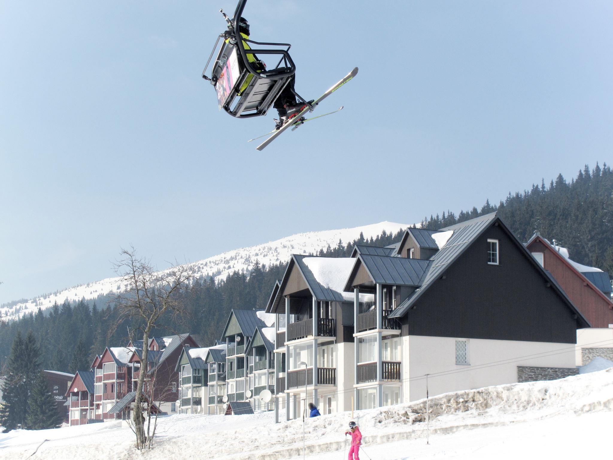 Modern, beautiful apartment house 1'000 m a.s.l.. 10 m from the centre of Horní Mísecky, 9 km from the centre of Vitkovice, 20 km from the centre of Jilemnice, in a sunny position on a slope, 50 m from the skiing area. For shared use: property, communal covered parking. Shop 9 km, supermarket 20 km, bus stop "Vítkovice, Horní Mísecky" 130 m. Slopes 50 m. Please note: no lift.