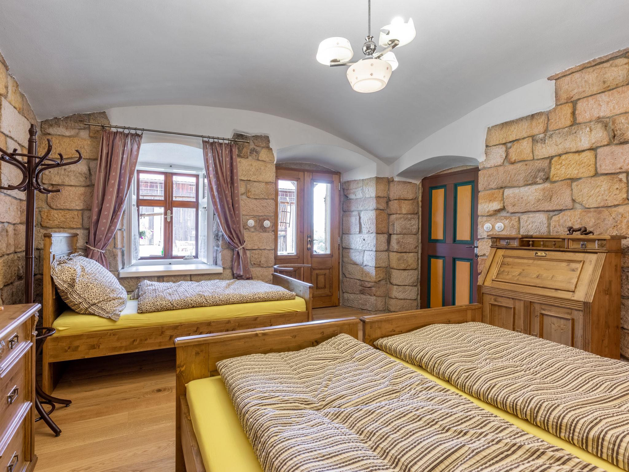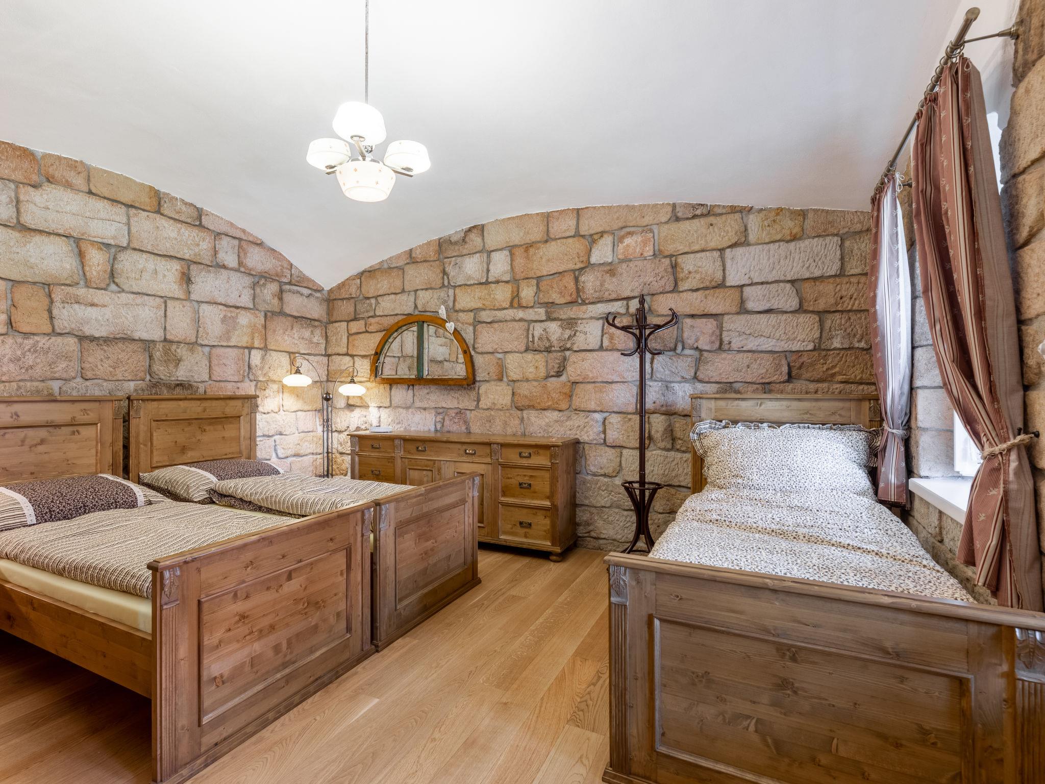 "Dolní Olešnice", 5-room farmhouse. Comfortable and stylish furnishings: living room with dining table, satellite TV and tiled stove. 1 room with 1 double bed. 1 room with 3 beds. 1 room with 2 beds. 1 room with 2 double sofabeds and satellite TV. Kitchenette (oven, dishwasher, 4 ceramic glass hob hotplates, toaster, electric coffee machine) with dining nook. Bath/shower, sep. WC, bath/shower/WC. Terrace. Terrace furniture. Facilities: washing machine, children's high chair, baby cot. Internet (WiFi, free). Please note: suitable for families. Non-smoking house.