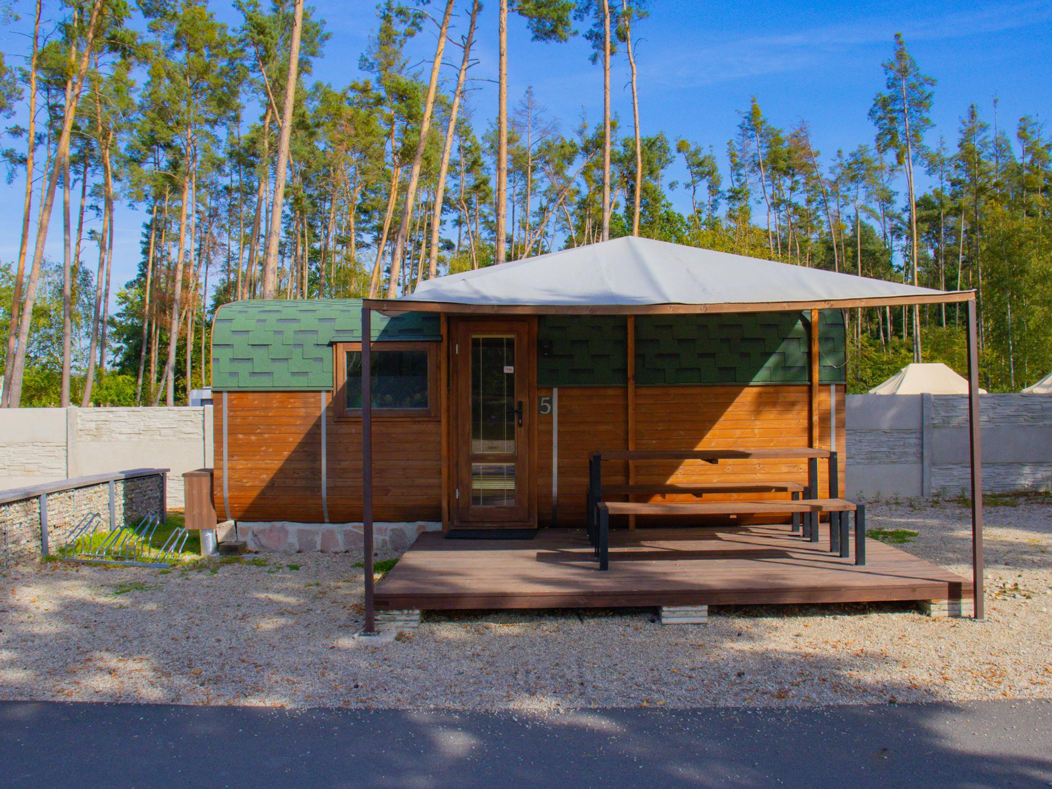 Child friendly holiday village "Kemp Stríbrný rybník". 25 houses in the resort. In the district of Malšova Lhota, 5 km from the centre of Hradec Králové, along the wooded area, on the lake. For shared use: property. Table tennis, boccia (extra), beach volleyball, arbour, barbecue, fireplace, children's playground, bathing jetty. In the complex: reception, restaurant, bar, bistro, playroom, washing machine (for shared use, extra), bicycle rental. Parking (extra) on the premises. Bus stop "Stríbrný rybník" 700 m, railway station "Blešno" 5 km, sandy beach 50 m, bathing lake "50". Sports harbour, minigolf, sports centre, walking paths from the house, cycle lane, fishing possibilities 50 m. Nearby attractions: Adventure park Firmsport, letní kino, tutistický vlácek do lesa, Stezka siluet, Rytírské hradište 3 km, Park Na Vetvi 3 km, Obory se zverí 4.2 km, Obrí akvárium, Botanická zahrada 4.7 km. Hiking paths: Pohádková, Vodnická stezka 6 km, Planetárium, planetární stezka 8.4 km, Zoopark Stežery, Rozhledna Milír 15 km. Please note: entertainment in the season. Suitable for families. Fishing [permit required]. The photograph shows a typical example.