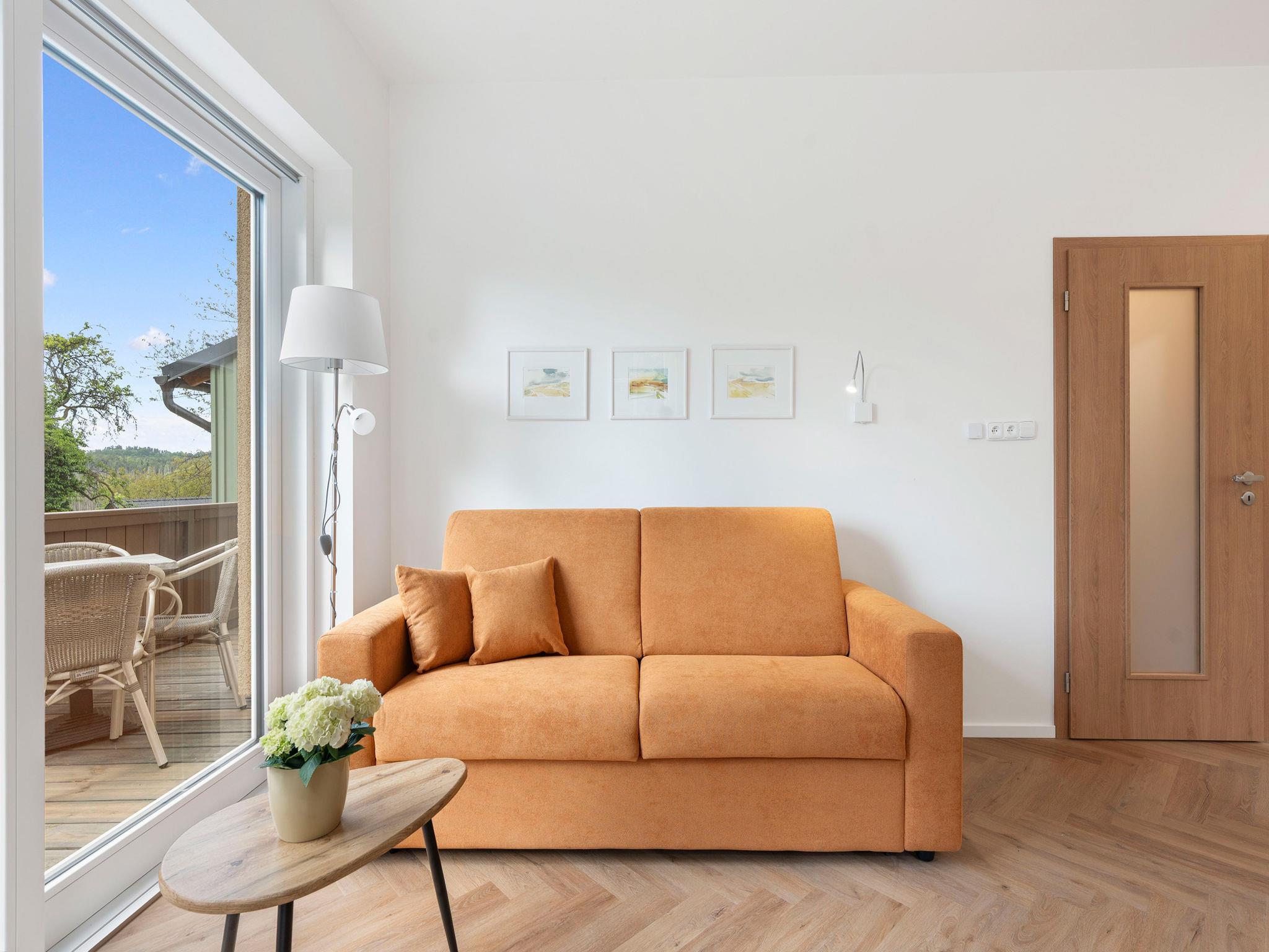 2-room apartment on the ground floor. Very beautiful furnishings: living/sleeping room with 1 double sofabed (140 cm), TV. Exit to the balcony. 1 room with 1 double bed. Kitchenette (oven, dishwasher, 2 ceramic glass hob hotplates, kettle, microwave, electric coffee machine) with dining nook. Shower/WC. Balcony. Balcony furniture. Beautiful view of the garden and the forest. Facilities: hair dryer. Internet (WiFi, free). Parking. Suitable for families. Maximum 2 pets/ dogs allowed.