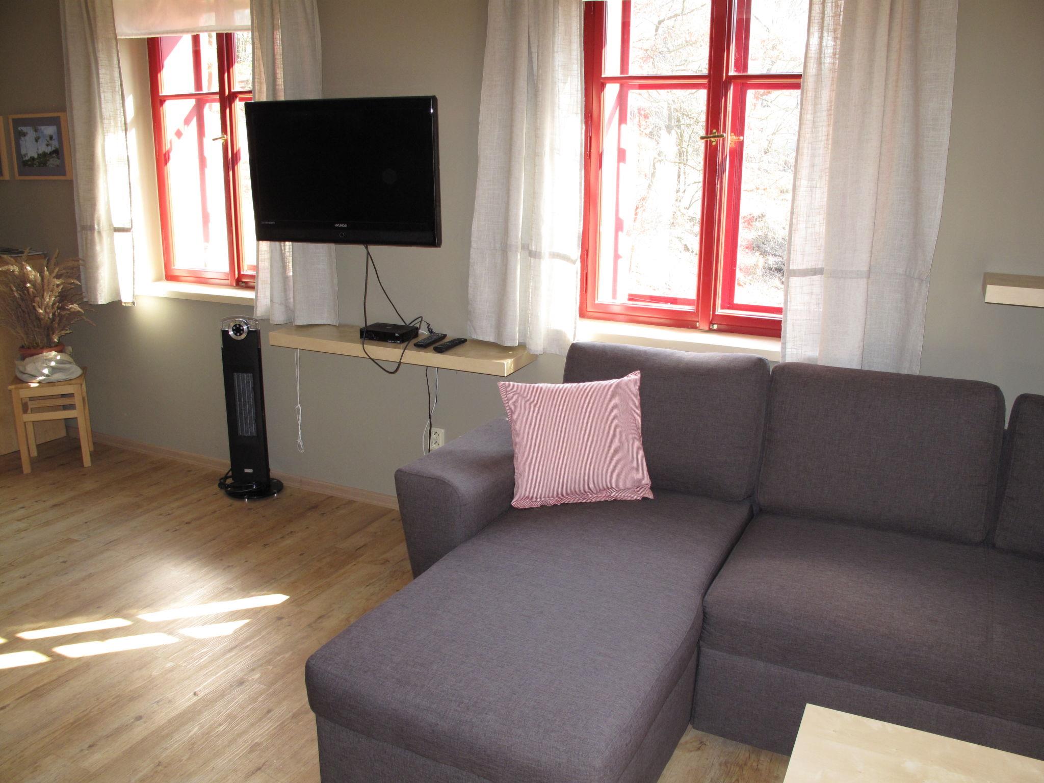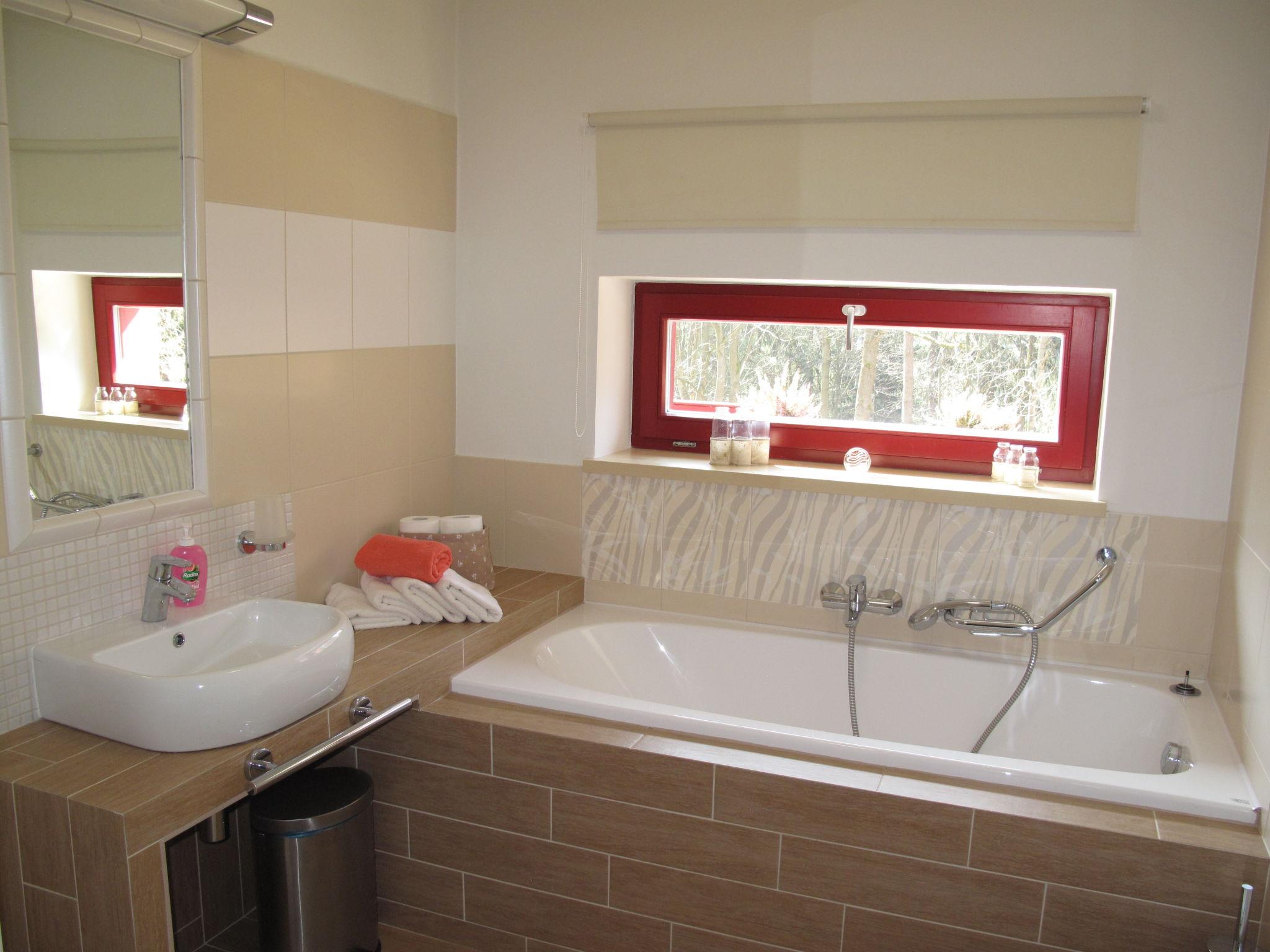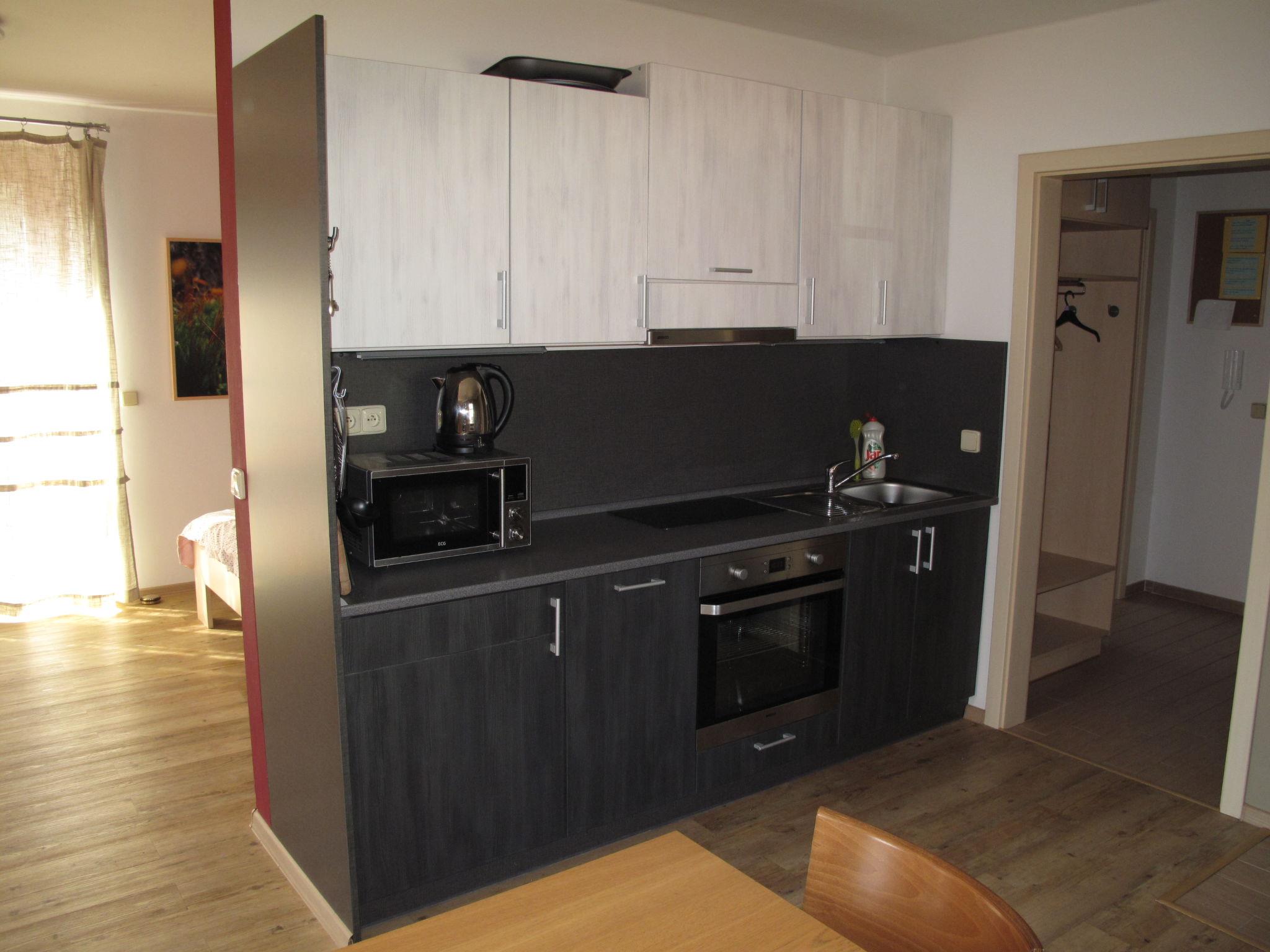 1-room studio on the ground floor. Spacious and bright, modern and cosy furnishings: open living/sleeping room with panoramic window with 1 double sofabed, 1 double bed and satellite TV (flat screen), electric heating. Exit to the terrace. Open kitchen (oven, 2 ceramic glass hob hotplates, kettle, microwave, freezer) with dining nook. Bath/shower/WC. Electric heating, floor heating. Large terrace. Terrace furniture. Beautiful view of the forest. Facilities: children's high chair, hair dryer. Internet (WiFi, free). Please note: suitable for families. Non-smoking house. Maximum 2 pets/ dogs allowed. Smoke alarm, fire extinguisher.