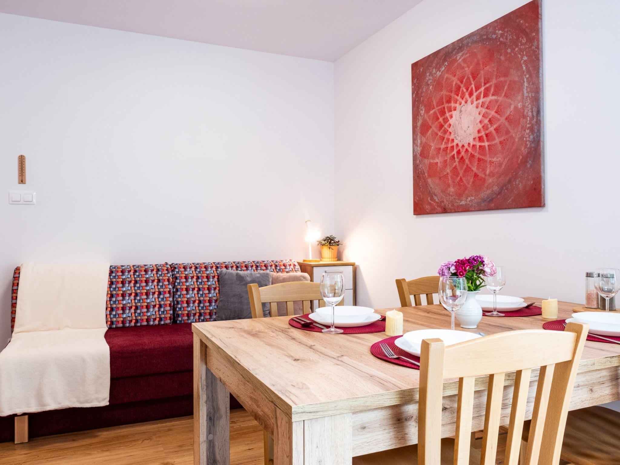 "Large Mandala & Sauna", 2-room apartment 48 m2. Very beautiful furnishings: living/dining room with 1 double sofabed, Scandinavian wood stove, dining table and TV (flat screen). 1 room with 1 double bed. Kitchenette (oven, dishwasher, 4 ceramic glass hob hotplates, toaster, kettle, microwave, electric coffee machine). Bath/bidet/WC. Heating. Balcony. Balcony furniture. View of the mountains, the forest and the town. Facilities: sauna, hair dryer. Internet (WiFi, free). Parking (roofed, 1 car). Please note: suitable for families. Non-smokers only.