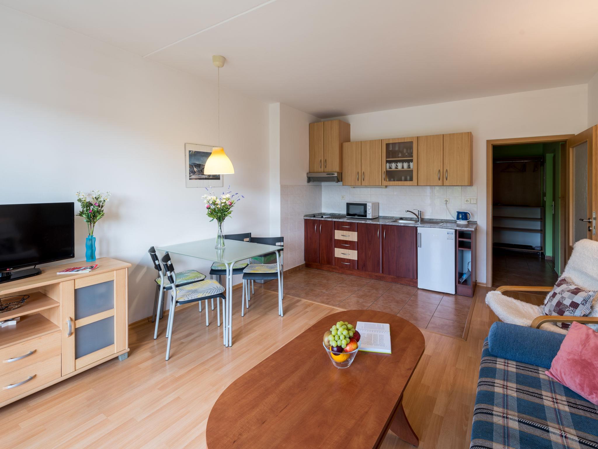 "Slunecní strán III", 2-room apartment 46 m2 on 1st floor. Spacious and bright, comfortable furnishings: living/sleeping room with 1 double sofabed and satellite TV. 1 room with 1 double bed. Kitchenette (2 ceramic glass hob hotplates, toaster, kettle, microwave) with dining table. Shower/WC. Balcony. Balcony furniture. Facilities: Internet (WiFi, free). Parking space n 317/6. Please note: suitable for families. Non-smokers only. Maximum 1 pet/ dog allowed.