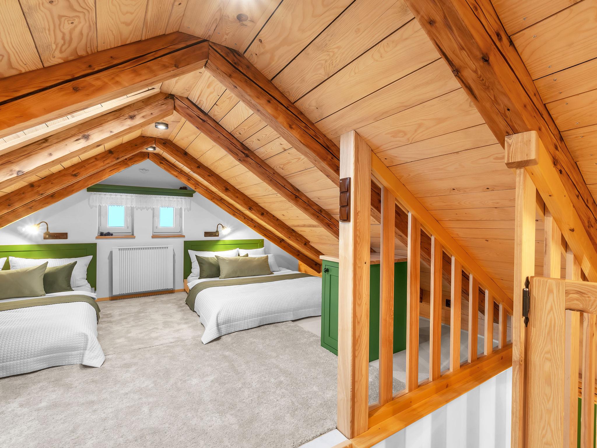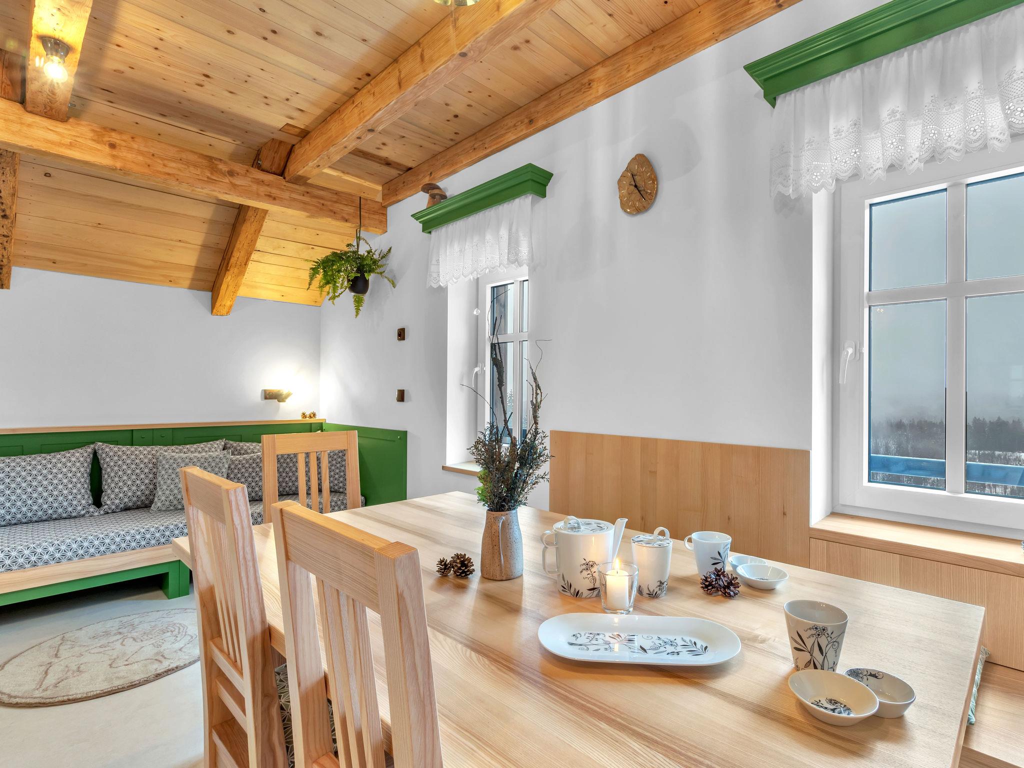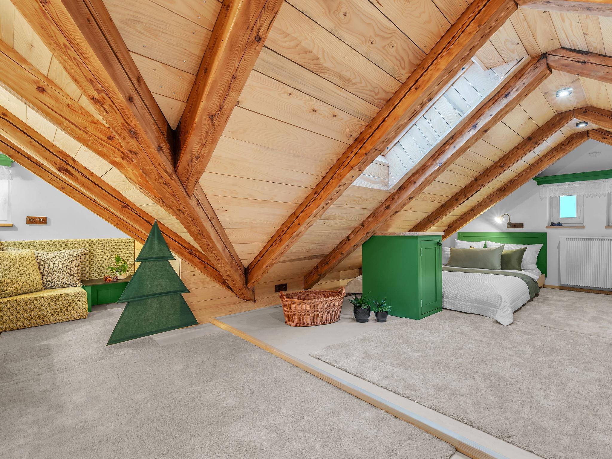 "V Mechu", 3-room apartment 47 m2 on 2 levels, on the top floor. Object suitable for 4 adults + 2 children. Luxurious and stylish furnishings: large living/dining room with dining nook and TV (flat screen). 1 room with 1 x 2 bunk beds, 1 double bed. Kitchenette (oven, dishwasher, 2 ceramic glass hob hotplates, toaster, kettle, microwave, electric coffee machine). Bath/WC. Floor heating. Upper floor: (steep stair), 1 open room with sloping ceilings with 2 beds (140 cm). Open small living room. Beautiful panoramic view of the valley. Facilities: washing machine. Internet (WiFi, free). Please note: suitable for families. No lift.