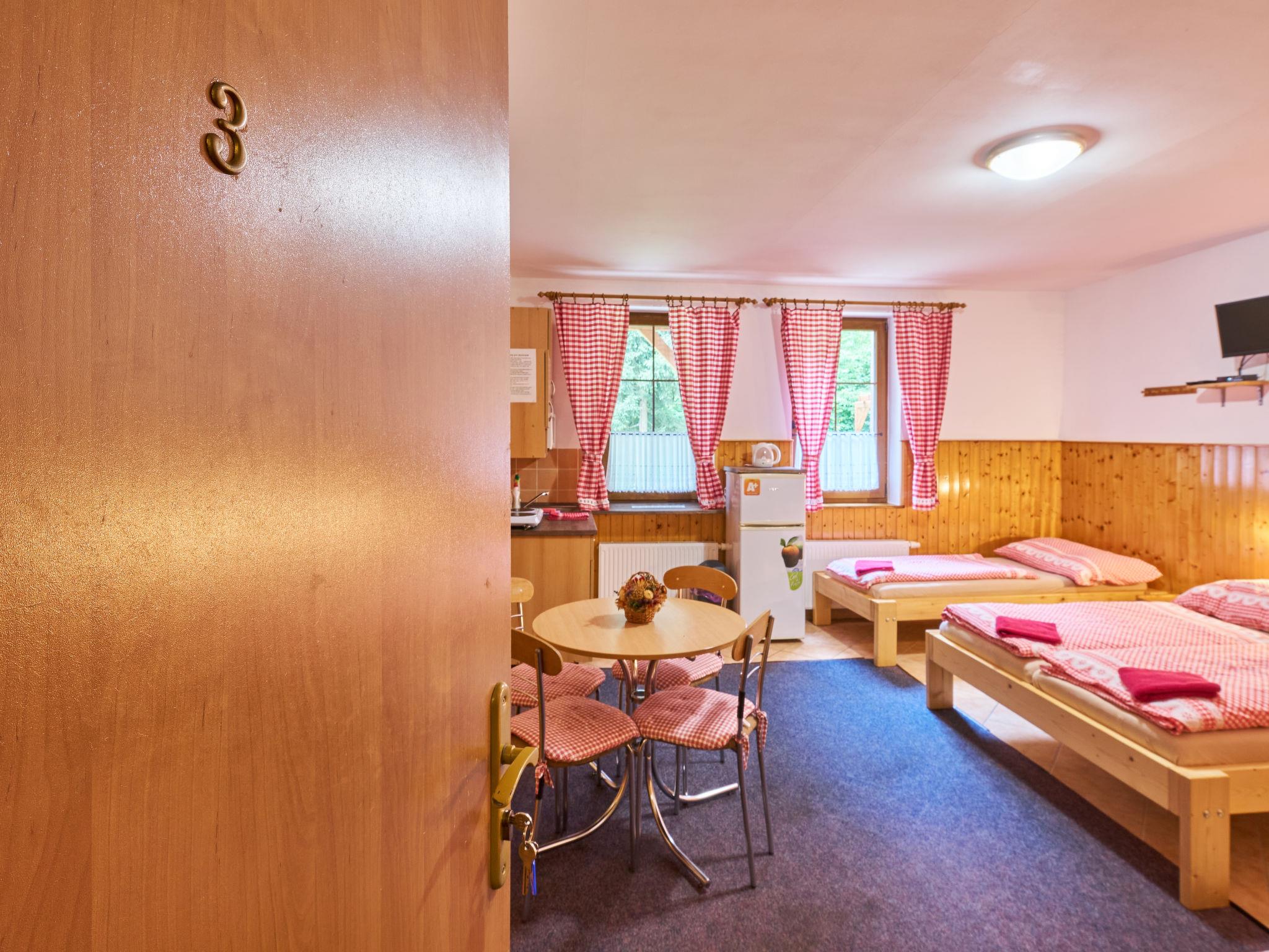 "U Švýcarského dvora III", 1-room apartment 27 m2, on the ground floor. Practical and cosy furnishings: 1 room with 2 beds, 1 double bed, dining table and satellite TV. Kitchenette (2 hot plates, kettle, microwave). Shower/WC. Heating. View of the garden. Facilities: Internet (WiFi, free). Please note: non-smokers only. Smoke alarm, fire extinguisher.