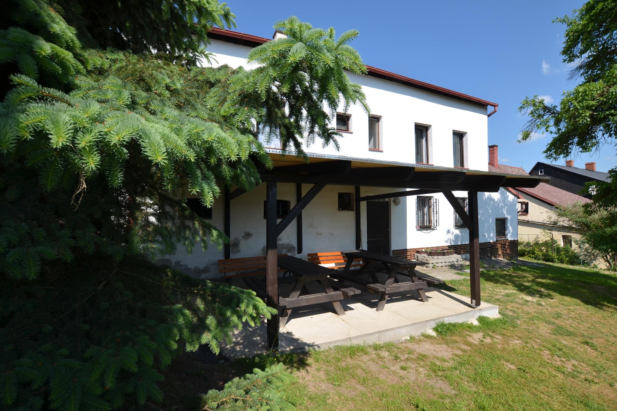 Rummeligt familieretræte Beliggende i Jiretín pod Jedlovou, kan dette ekspansive feriehus rumme op til 21 gæster fordelt på 8 soveværelser, hvilket gør det ideelt til store familiesammenkomster eller grupperejser. Kæledyr er velkomne, og den smukt anlagte have byder på masser af plads til at lege, mens gæsterne kan slappe af på den overdækkede terrasse eller slappe af på liggestolene. En privat sauna og flere siddeområder sikrer afslapning efter en dag med udforskning. Eventyr og spisning i nærheden Supermarkeder ligger kun 200 m væk, og den nærmeste swimmingpool ligger kun 500 m fra boligen. Skientusiaster kan nå pisterne ved en skilift, der ligger 1 km derfra. Området byder også på naturskønne vandrestier og cykelstier, der egner sig til gæster og deres kæledyr. Restauranter og caféer i gåafstand giver en smag af det lokale køkken, perfekt til et afslappet måltid efter udendørs eventyr. Underholdning derhjemme Huset har et veludstyret køkken med moderne apparater, herunder ovn, mikroovn og opvaskemaskine til familiens måltider. Gæsterne kan spille billard, bordtennis eller dart i legeområderne, mens kæledyr udforsker den rummelige 800 m² store have. Parkering på stedet sikrer bekvemmelighed for grupper, der ankommer i bil, og offentlig transport er kun 40 m væk. Kombinationen af ??komfort, rekreation og en kæledyrsvenlig atmosfære gør dette hjem til en ideel base for at udforske det nordlige Bøhmen.