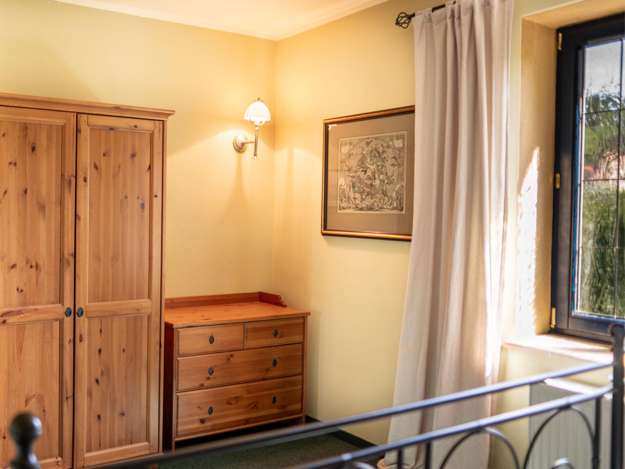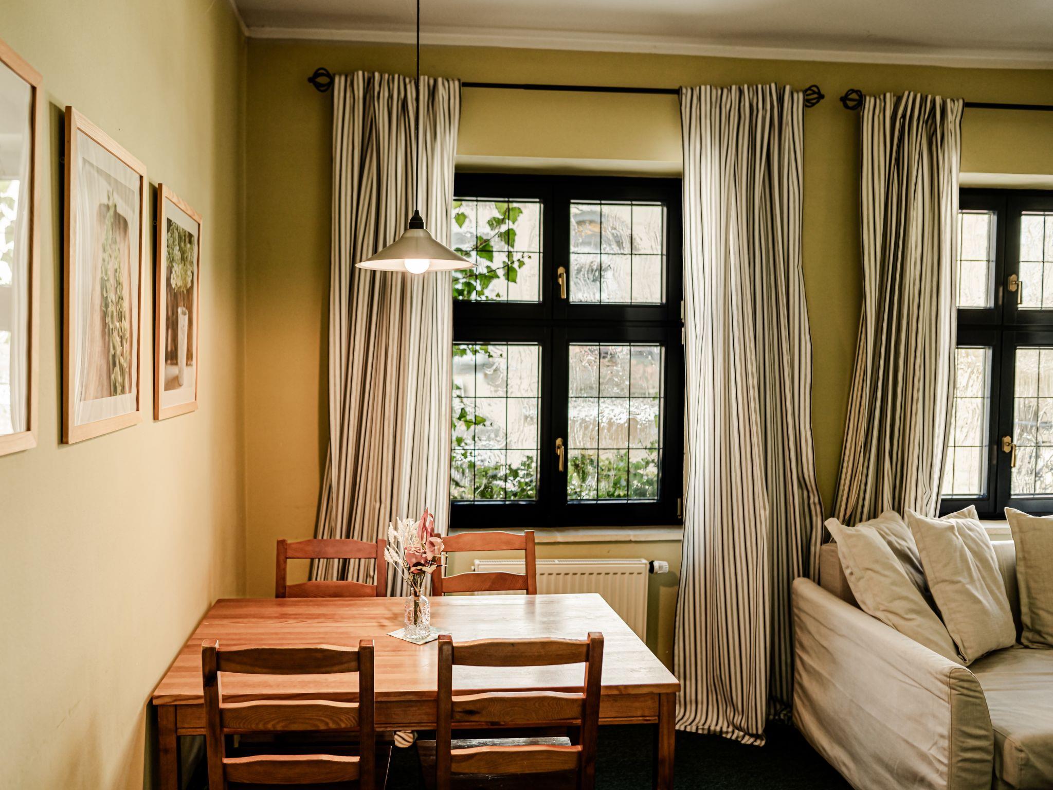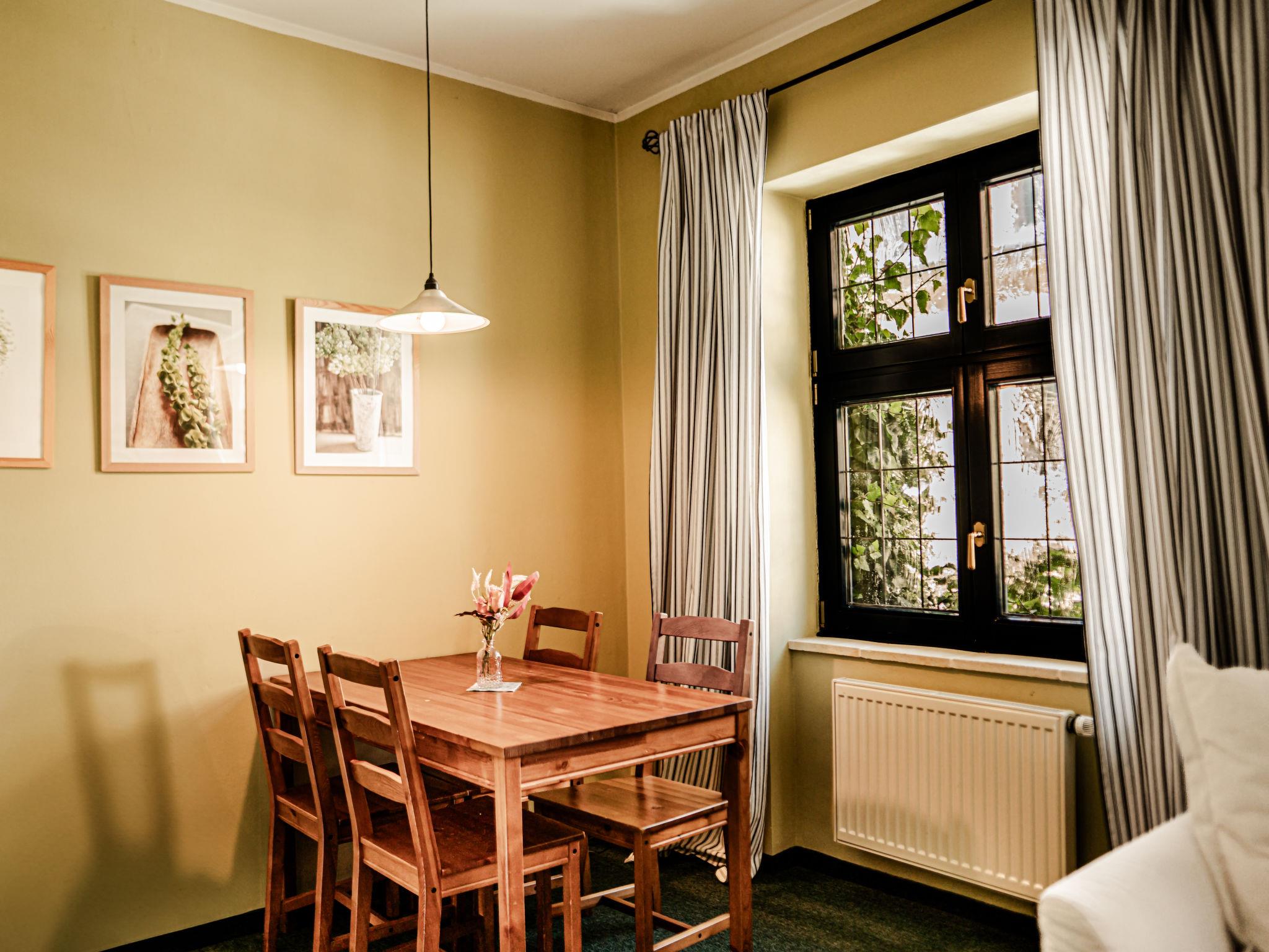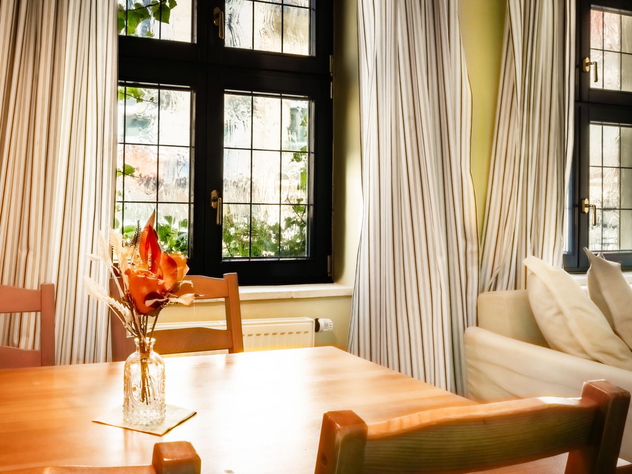 "Goethe", 3-room apartment 47 m2 on 1st floor. Very beautiful and cosy furnishings: living/sleeping room with 1 pull-out bed (2 pers.), dining table and satellite TV. 2 rooms, each room with 1 double bed. Kitchenette (2 hot plates, kettle, microwave, freezer). Shower/WC. Very beautiful view of the garden. Facilities: Internet (WiFi, free). Parking (fenced) at the house. Please note: suitable for families. Non-smokers only. Maximum 1 pet/ dog allowed. Fire extinguisher.