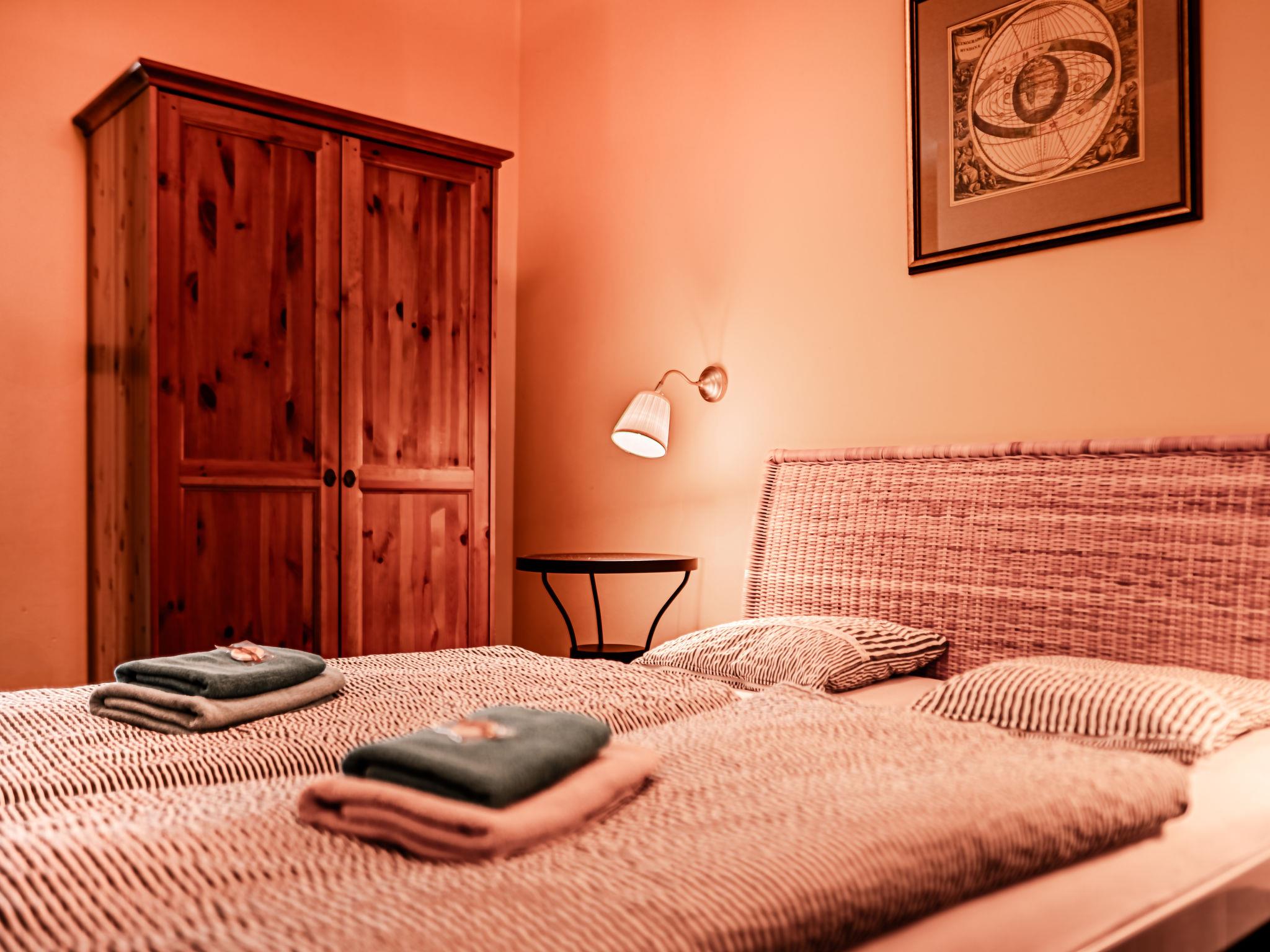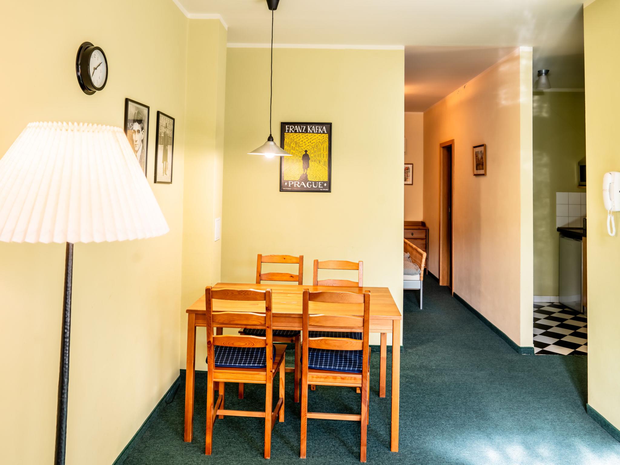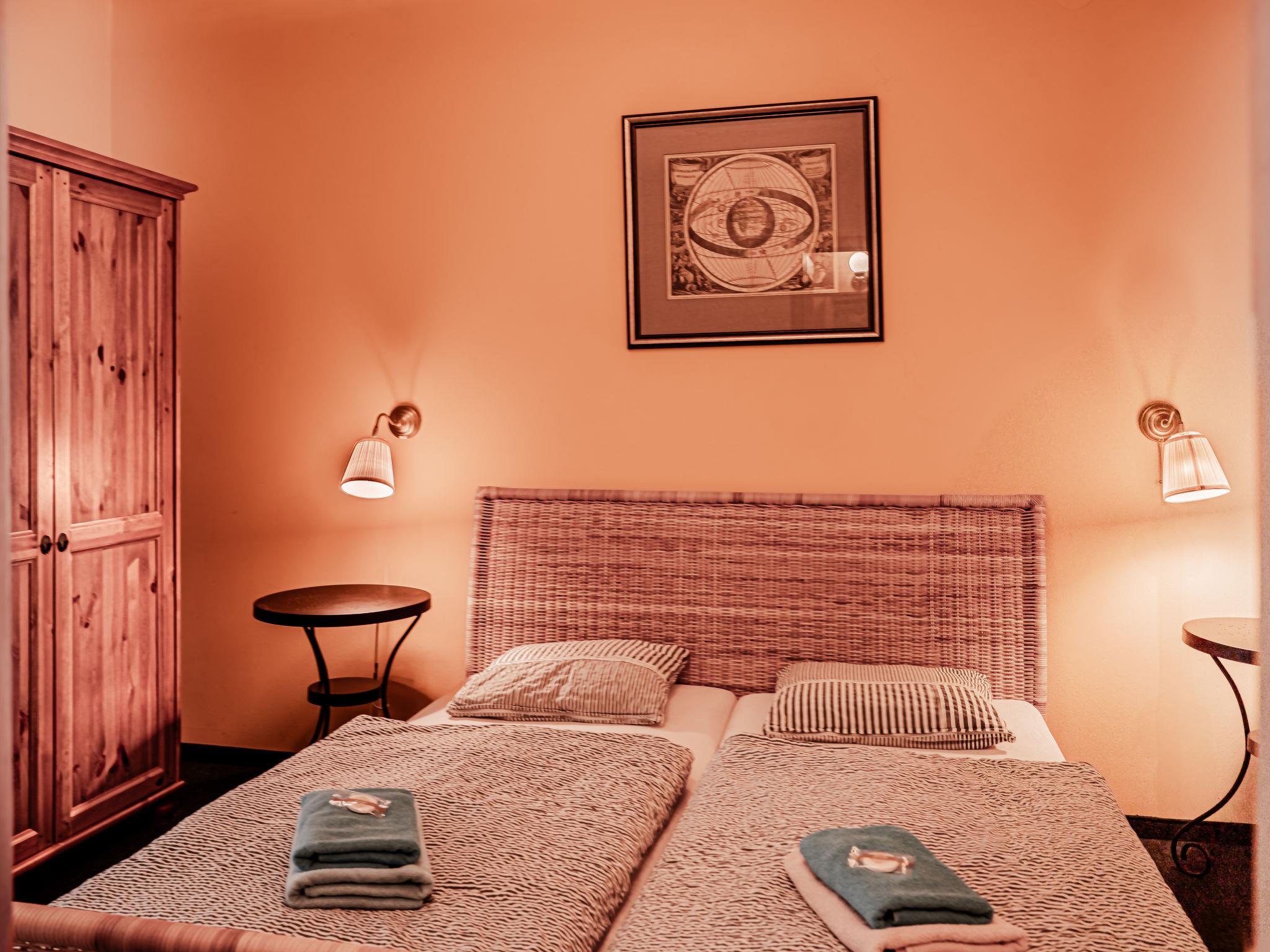 "Kafka", 2-room apartment 40 m2, on the lower ground floor. Beautiful and cosy furnishings: living room with dining table and satellite TV. 1 room with 1 double bed. Kitchenette (2 hot plates, kettle, microwave, freezer). Shower/WC. Very beautiful view of the garden. Facilities: Internet (WiFi, free). Parking (fenced) at the house. Please note: suitable for families. Non-smokers only. Maximum 1 pet/ dog allowed. Fire extinguisher. The living room is partially separated from the double bedroom by a glass wall.