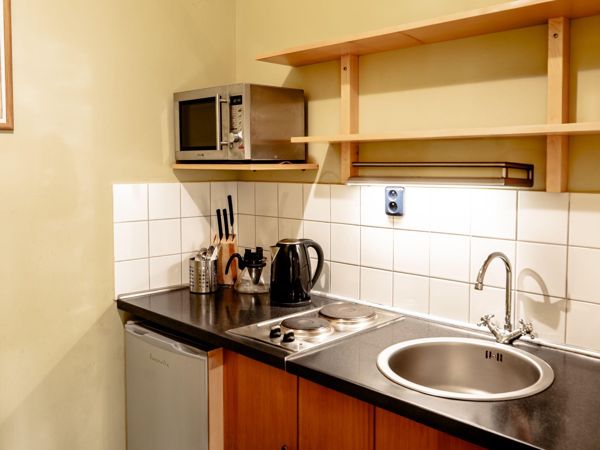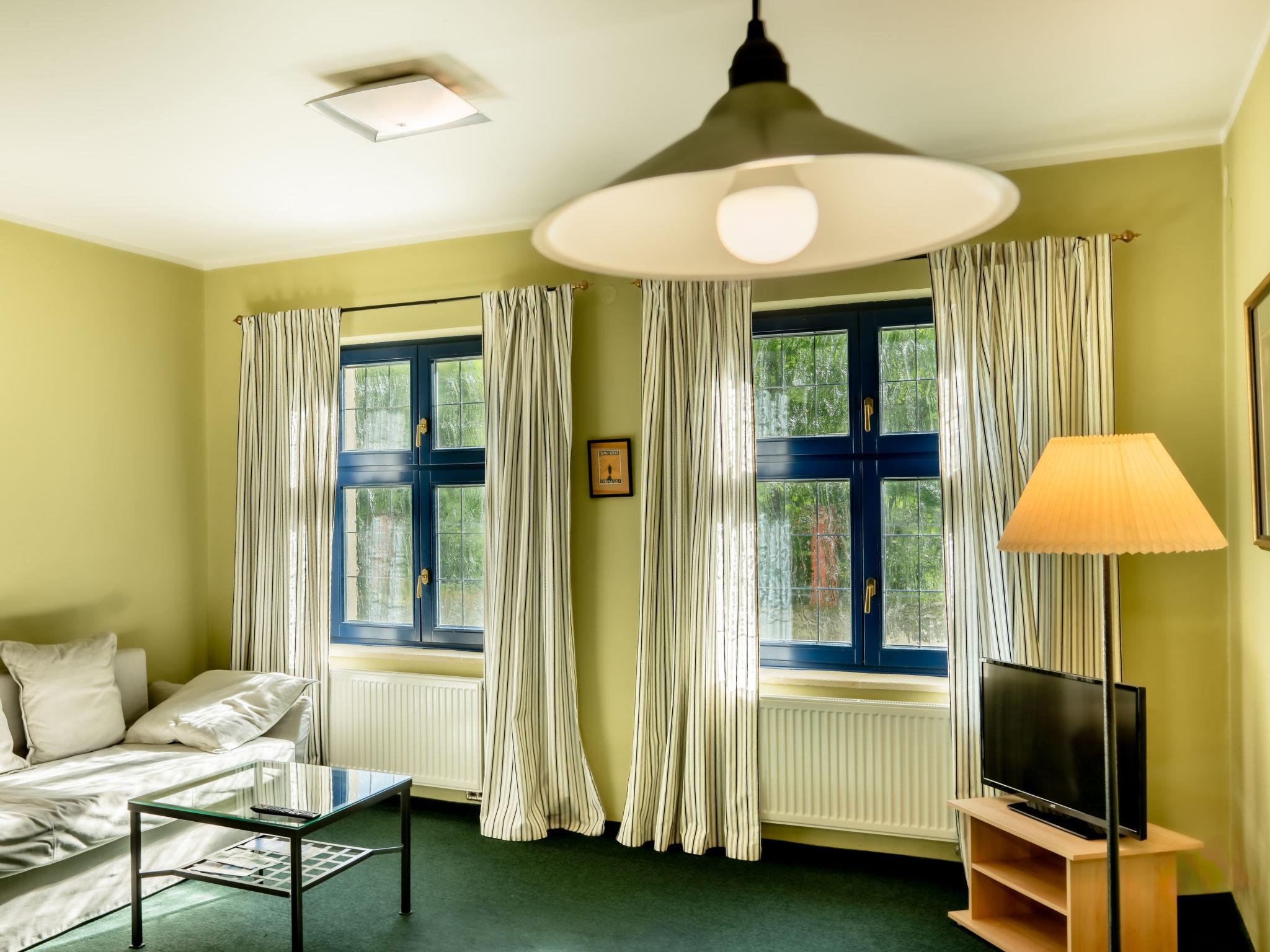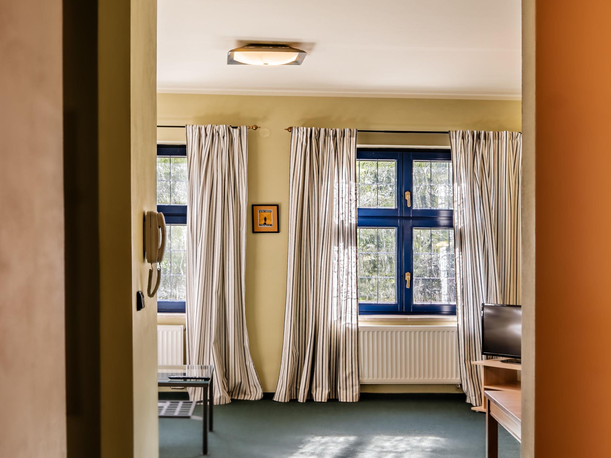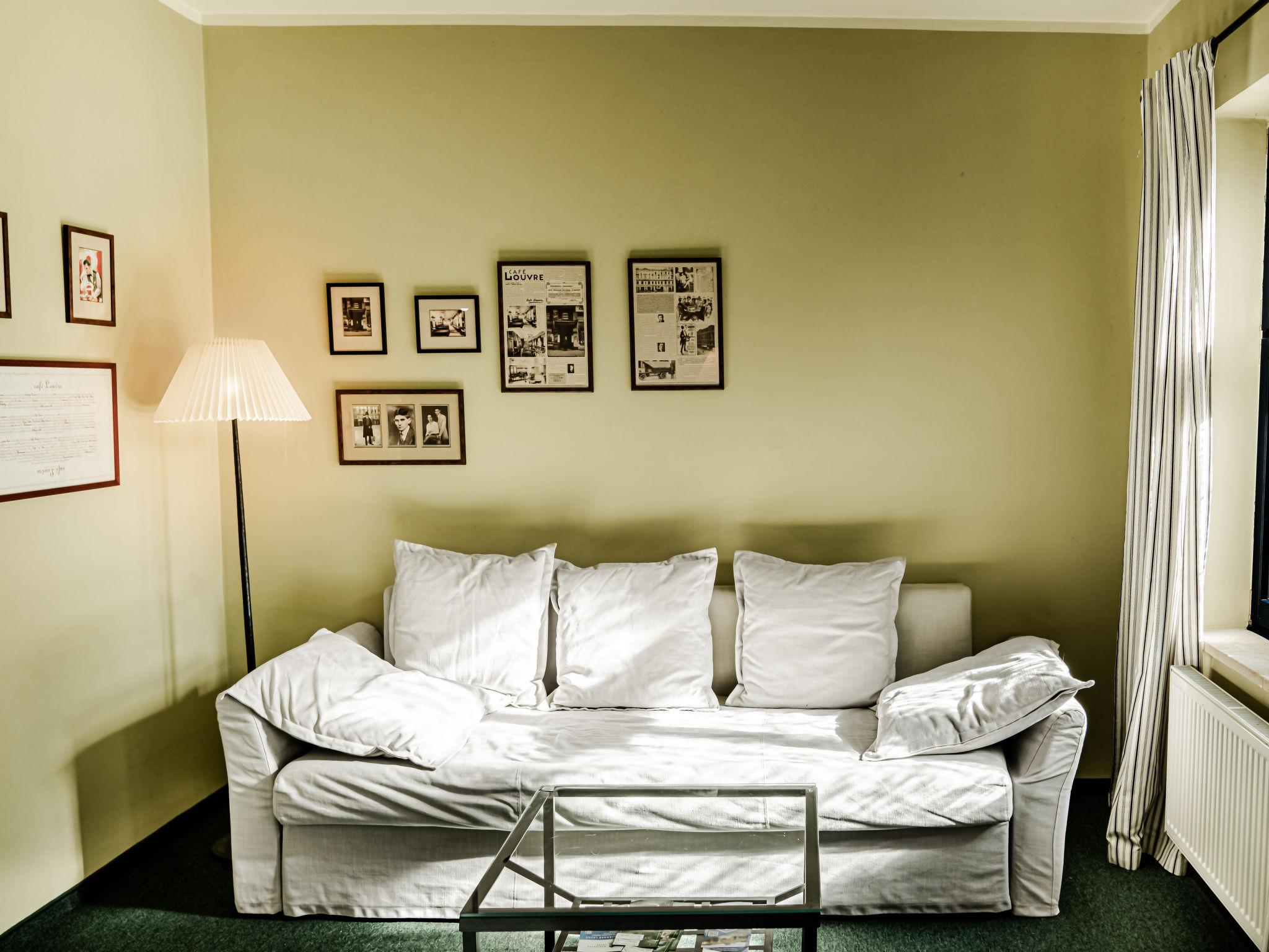 "Kafka", 2-room apartment 40 m2, on the lower ground floor. Beautiful and cosy furnishings: living room with dining table and satellite TV. 1 room with 1 double bed. Kitchenette (2 hot plates, kettle, microwave, freezer). Shower/WC. Very beautiful view of the garden. Facilities: Internet (WiFi, free). Parking (fenced) at the house. Please note: suitable for families. Non-smokers only. Maximum 1 pet/ dog allowed. Fire extinguisher. The living room is partially separated from the double bedroom by a glass wall.