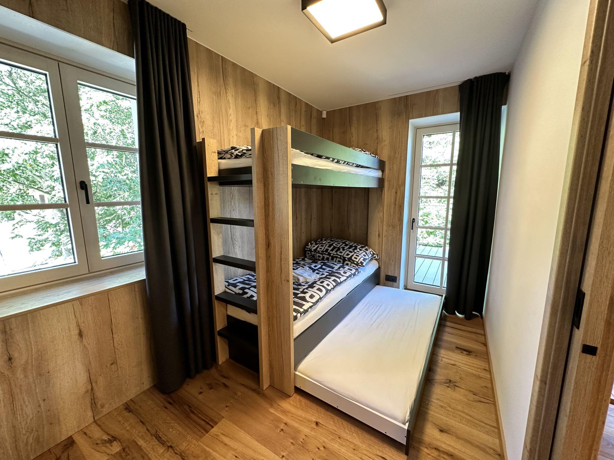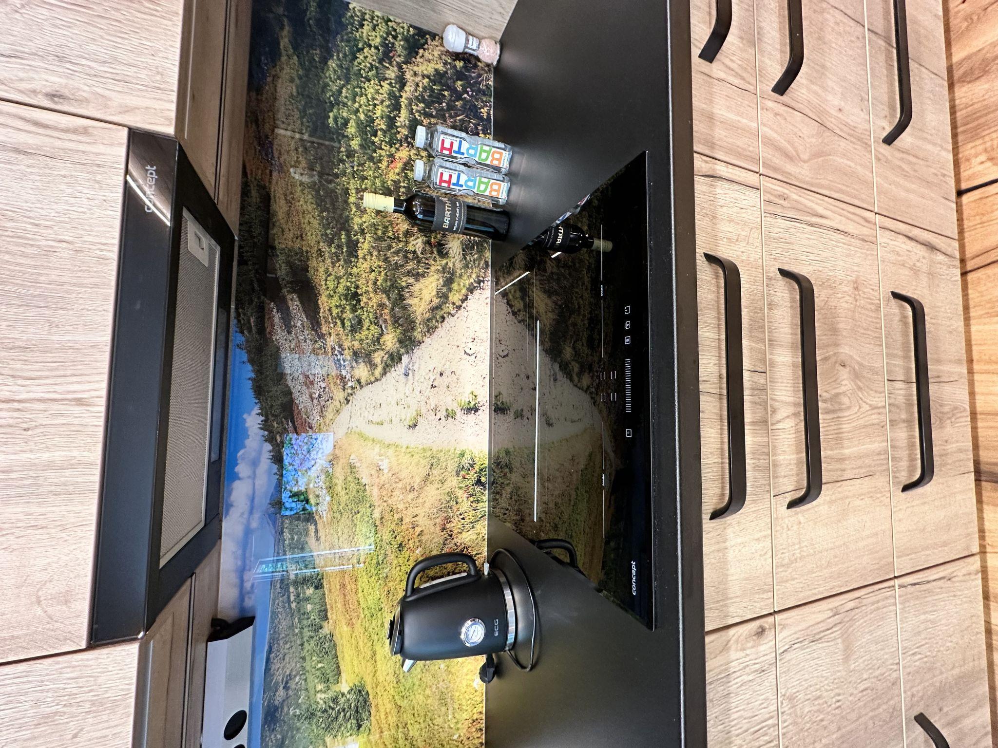 3-room apartment on 1st floor. Spacious, luxurious furnishings: living room with dining table and TV. Exit to the terrace. 1 room with 1 double bed. 1 room with 1 x 2 bunk beds, 1 pull-out bed. Exit to the terrace. Kitchenette (oven, dishwasher, 4 ceramic glass hob hotplates, microwave, freezer, electric coffee machine). Shower/WC. Large terrace. Terrace furniture. Beautiful view of the countryside. Facilities: Internet (WiFi, free). Parking. Please note: suitable for families. Non-smokers only.