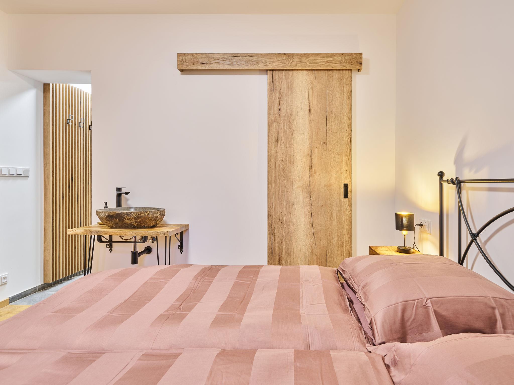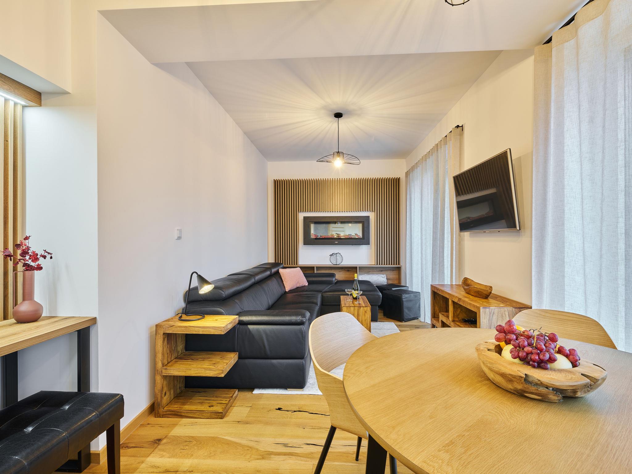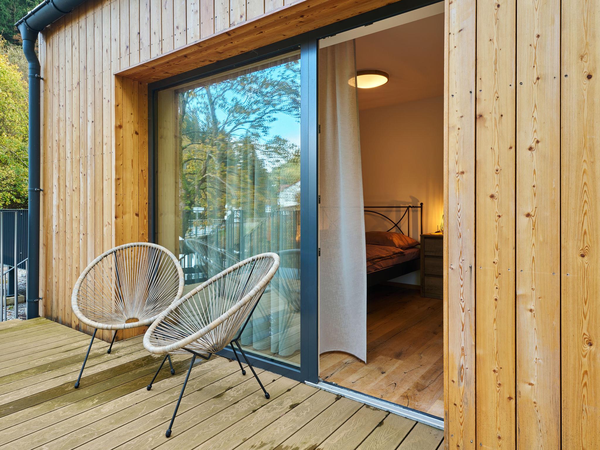 "Vogue Ridge Retreat & Terrace", 3-room apartment 74 m2, on the ground floor. Spacious and bright, very beautiful and modern furnishings: living/dining room with open-hearth fireplace, dining table and TV. Exit to the terrace. 1 room with 1 double bed, shower/WC and TV. Exit to the terrace. 1 room with 1 double bed and shower/WC. Kitchenette (oven, dishwasher, 4 induction hot plates, toaster, kettle, freezer, electric coffee machine). Heating. Large terrace 30 m2. Terrace furniture. Beautiful view of the countryside and the river. Facilities: Internet (WiFi, free). Parking (1 car). Please note: suitable for families. Non-smokers only.