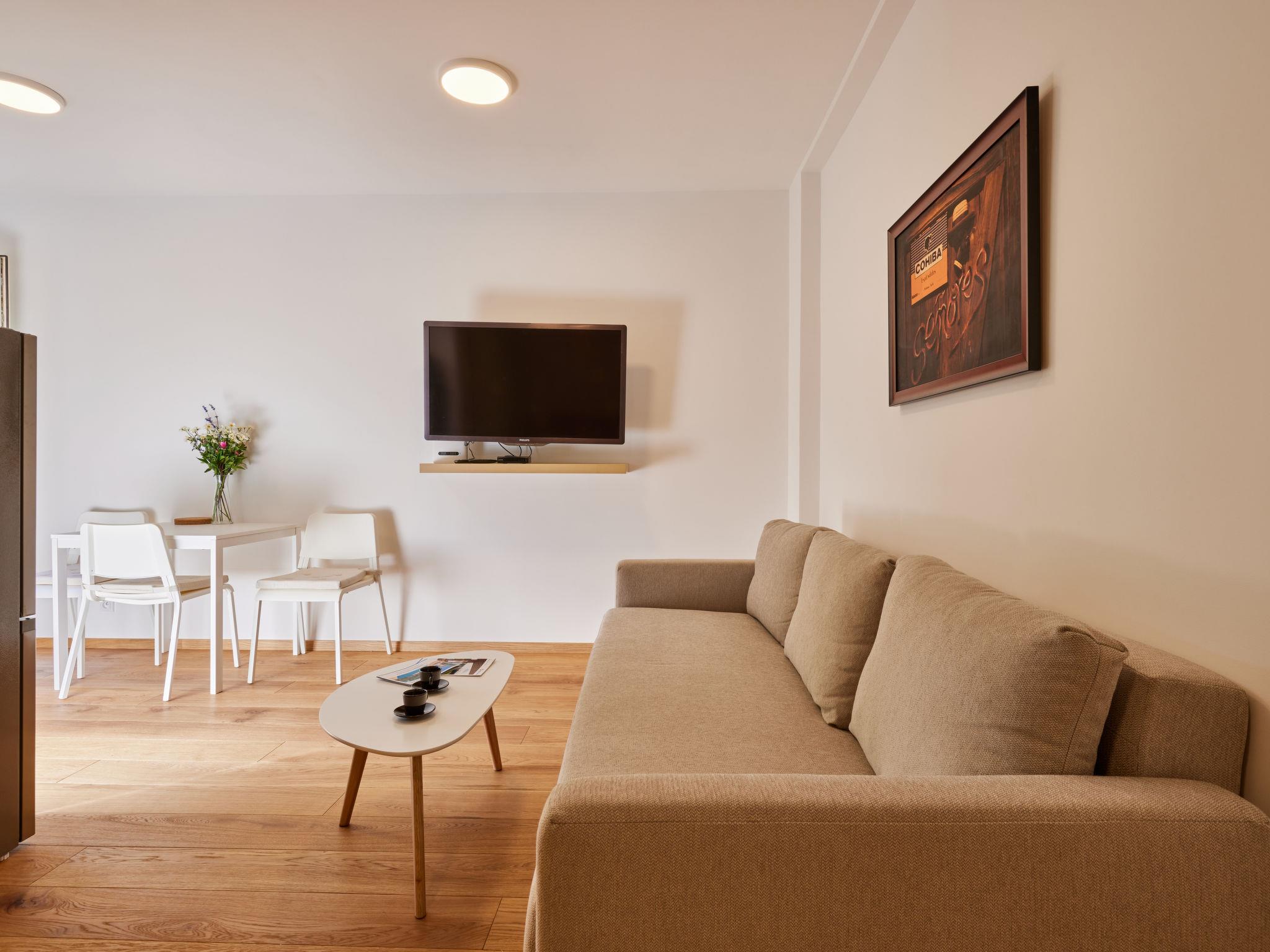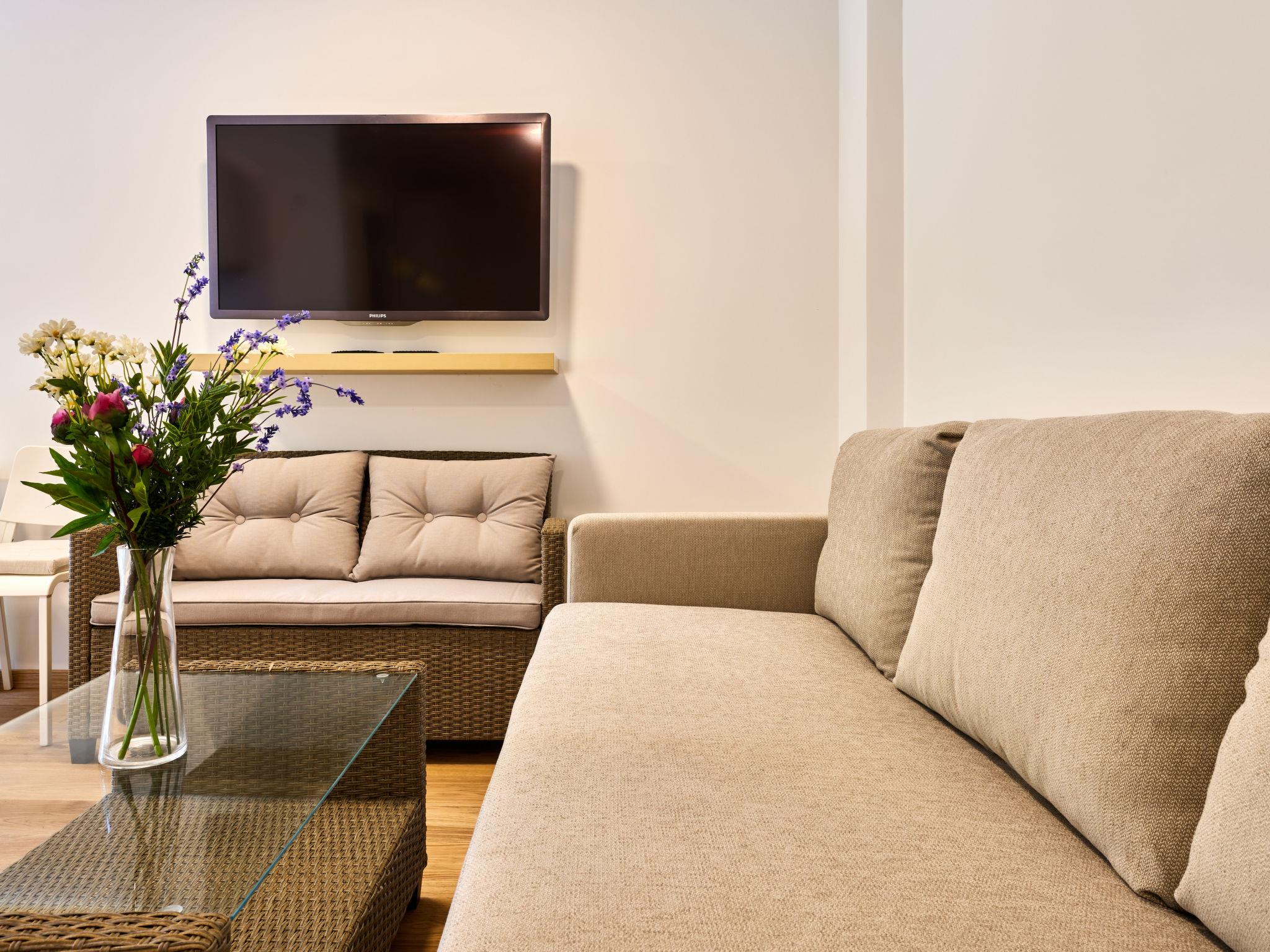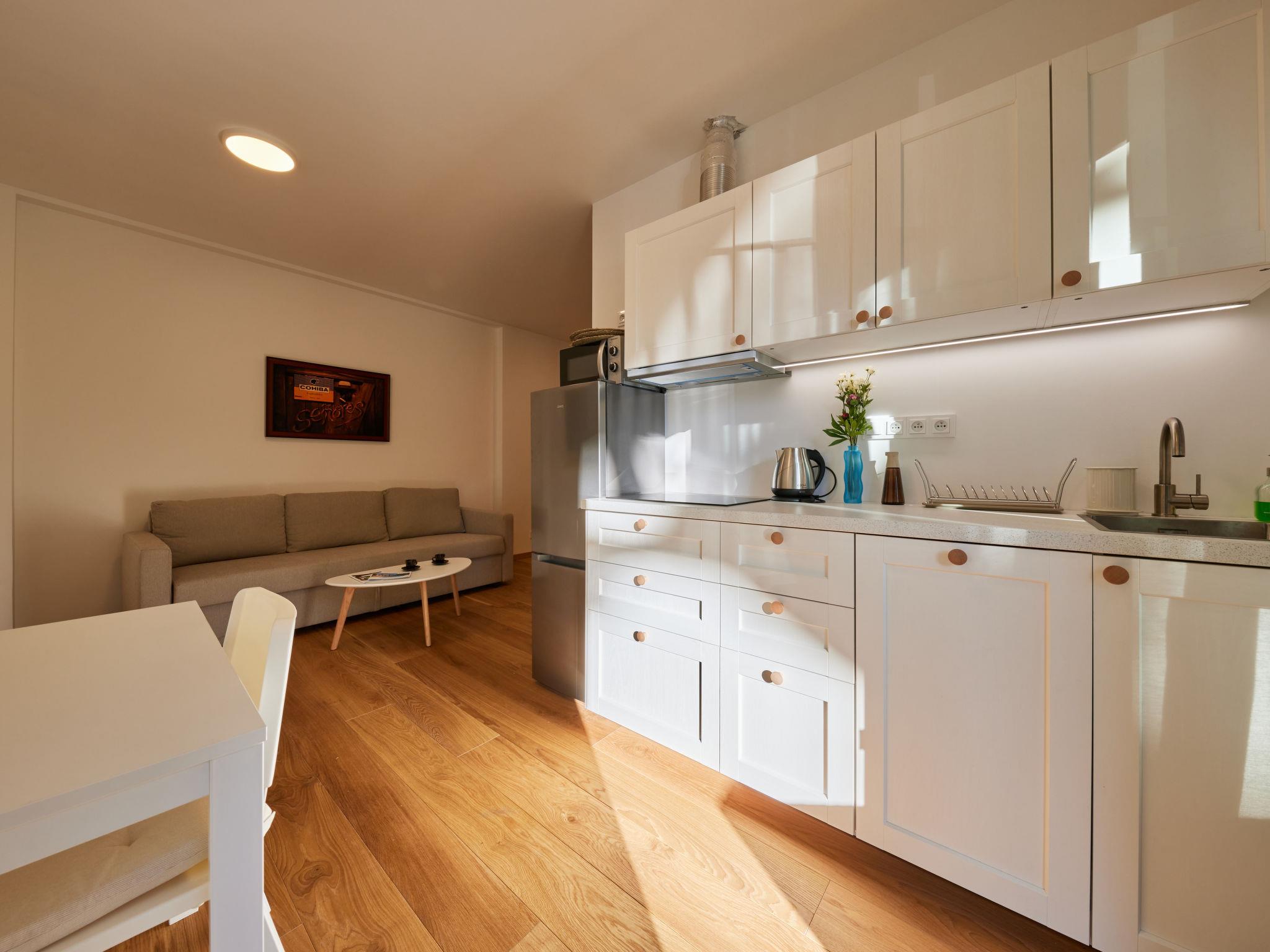 "Serene Glow Nook & Terrace", 1-room studio 36 m2 on 1st floor. Spacious and bright, beautiful and luxurious furnishings: living/sleeping room with 1 double sofabed, 1 double bed, dining table and satellite TV (flat screen). Kitchenette (dishwasher, 2 ceramic glass hob hotplates, toaster, kettle, microwave, freezer, electric coffee machine). Shower/WC. Heating. Terrace 5 m2. Terrace furniture. Facilities: Internet (WiFi, free). Parking. Please note: suitable for families. Non-smoking house.