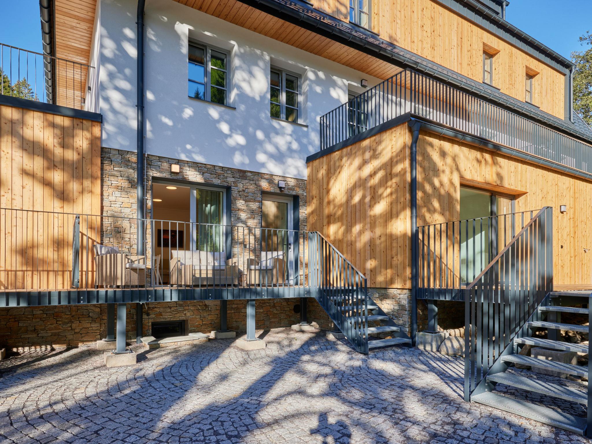 Modern, luxurious residence "Máj", 3 storeys, detached, renovated in 2023. In the centre of Pec pod Snežkou, 100 m from the edge of the forest, 1.3 km from the skiing area, 10 m from the river. In the house: storage room for skis, central heating system. Parking at the house. Shop 60 m, grocery 200 m, restaurant 60 m, bar, café 100 m, bicycle rental 500 m, pub garden 60 m, bus stop "Pec pod Snežkou" 300 m, indoor swimming pool 500 m. Sports centre 500 m, walking paths from the house, cycle lane 20 m, ski lift 1.3 km, chair lift 1.3 km, skisport facilities 1.3 km, ski rental 60 m, ski bus stop 200 m, ski school 1.3 km, children's ski school 1.3 km, cross country ski track 150 m, children's playground 400 m. Nearby attractions: Relaxpark, bobová dráha 400 m, Snežka (lanovka) 1.2 km, Obrí dul, Modrý dul, vodopády 3 km, Malá Úpa 8 km, Janské Lázne 15 km, Vrchlabí, Trutnov 30 km. Well-known ski regions can easily be reached: Pec pod Snežkou – Cerná Hora 1.3 km, Velká Úpa 2.5 km, Janské Lázne 15 km. Well-known lakes can easily be reached: Dolce 25 km. Hiking paths: Krkonošský národní park. Groups of teenagers on request only. The owner does not accept any youth groups.