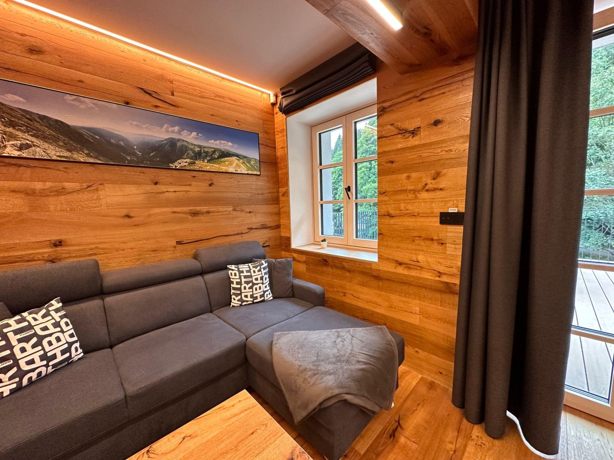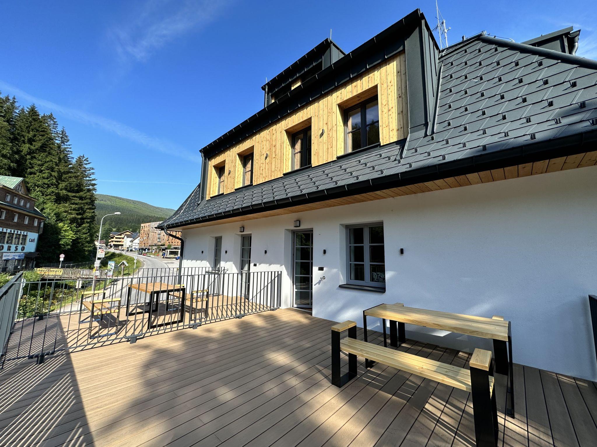 Modern, luxurious residence "Máj", 3 storeys, detached, renovated in 2023. In the centre of Pec pod Snežkou, 100 m from the edge of the forest, 1.3 km from the skiing area, 10 m from the river. In the house: storage room for skis, central heating system. Parking at the house. Shop 60 m, grocery 200 m, restaurant 60 m, bar, café 100 m, bicycle rental 500 m, pub garden 60 m, bus stop "Pec pod Snežkou" 300 m, indoor swimming pool 500 m. Sports centre 500 m, walking paths from the house, cycle lane 20 m, ski lift 1.3 km, chair lift 1.3 km, skisport facilities 1.3 km, ski rental 60 m, ski bus stop 200 m, ski school 1.3 km, children's ski school 1.3 km, cross country ski track 150 m, children's playground 400 m. Nearby attractions: Relaxpark, bobová dráha 400 m, Snežka (lanovka) 1.2 km, Obrí dul, Modrý dul, vodopády 3 km, Malá Úpa 8 km, Janské Lázne 15 km, Vrchlabí, Trutnov 30 km. Well-known ski regions can easily be reached: Pec pod Snežkou – Cerná Hora 1.3 km, Velká Úpa 2.5 km, Janské Lázne 15 km. Well-known lakes can easily be reached: Dolce 25 km. Hiking paths: Krkonošský národní park. Groups of teenagers on request only. The owner does not accept any youth groups.
