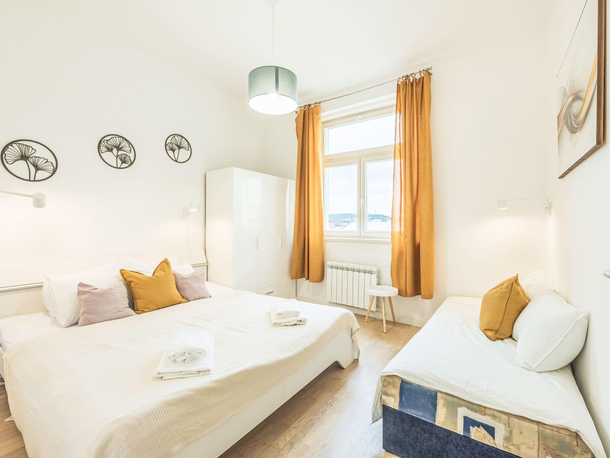 Very beautiful, historical residence "Washington", 6 storeys. In the centre of Praha, in a central, busy position, 1.8 km from the river. In the house: lift, central heating system. Linen change (suppl. charge extra). Towel change (suppl. charge extra). Room cleaning on request (extra). Public parking extra. Shop, grocery, supermarket, shopping centre, restaurant, bar, café 200 m, pedestrian zone 150 m, tram "Muzeum" 300 m, bus stop "Praha, ÚAN Florenc" 1.7 km, railway station "Praha, hlavní nádraží" 350 m, underground station "Muzeum" 150 m, park "Riegerovy sady" 700 m, indoor swimming pool 1 km. Tennis 2.4 km, indoor tennis centre 2.4 km, minigolf 1 km, sports centre 1.5 km, children's playground 600 m. Nearby attractions: Václavské námestí 120 m, Karluv most 2 km, Staromestské námestí, Orloj 1500 km, Pražský hrad, Petrínská rozhledna 3 km, Zoo 7 km, Vyšehrad 3 m, Karlštejn 30 km, Krivoklát 50 km. Well-known lakes can easily be reached: vodní nádrž Džbán 10 km, Hostivarská prehrada 13 km, Velká Amerika 33 km. Hiking paths: Stromovka 4 km, Prokopské údolí 9 km, Divoká Šárka 11 km.