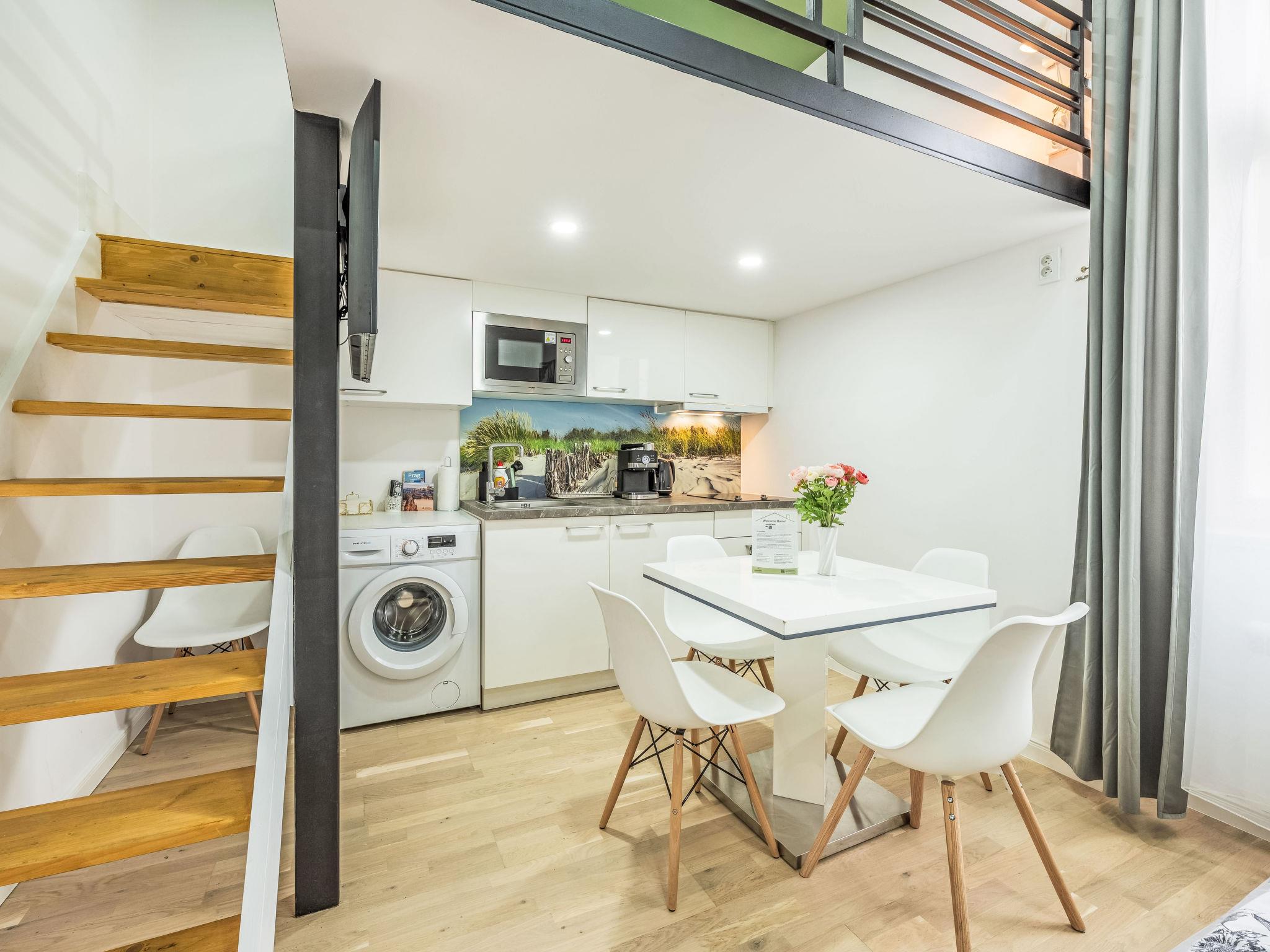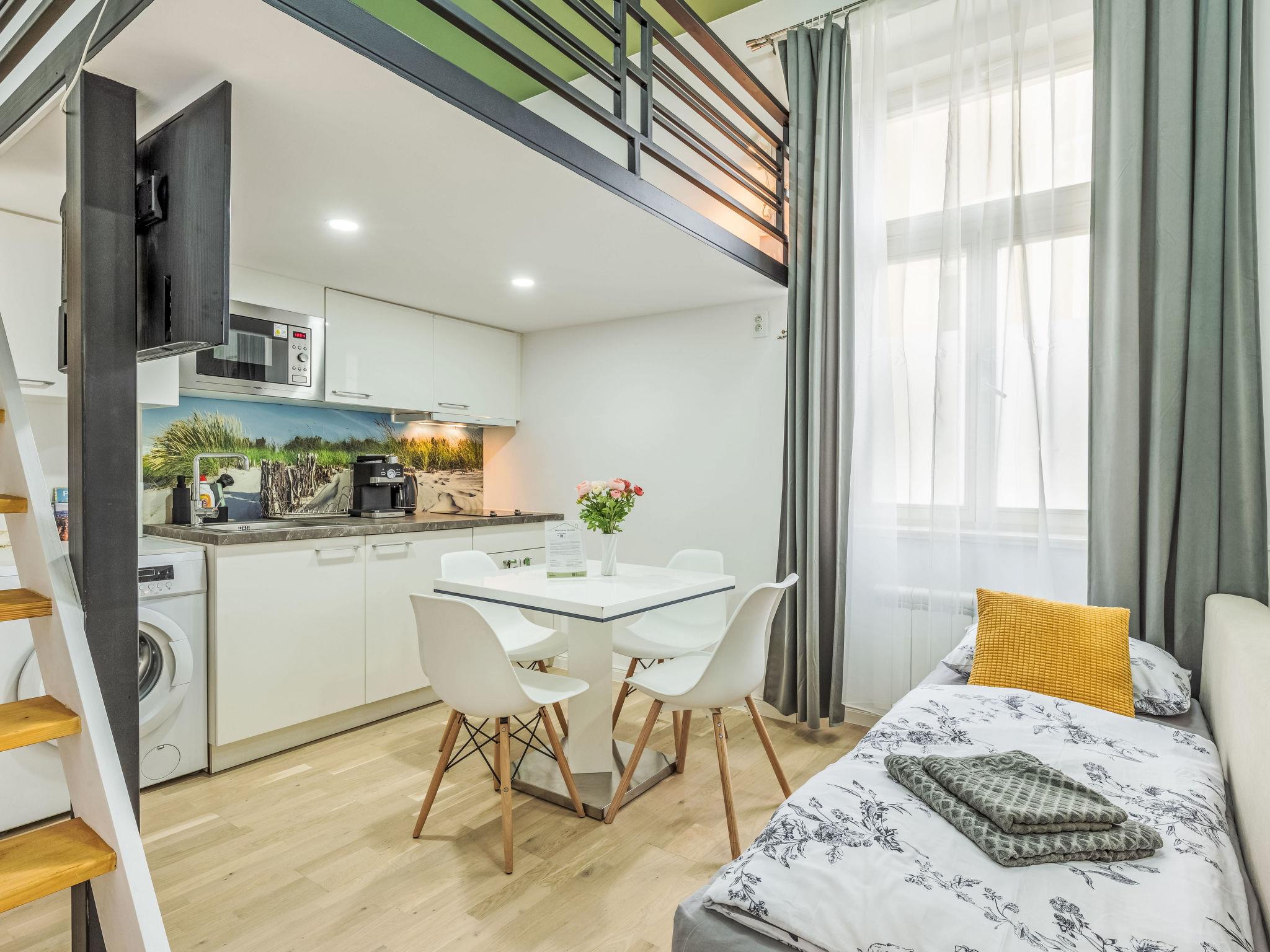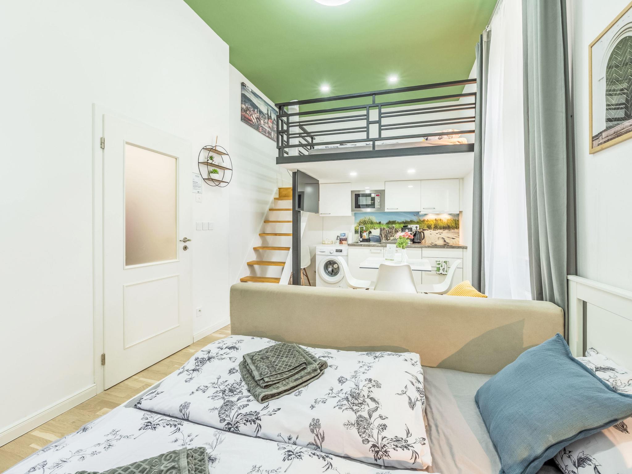 2-room apartment 32 m2 on 2nd floor. Bright, fully renovated, very beautiful and modern furnishings: entrance hall. Living/dining room with 1 sofabed, 1 double bed, dining table and TV. Open small gallery with 2 sleeping facilities. Kitchenette (2 induction hot plates, toaster, kettle, microwave, freezer, electric coffee machine). Shower/WC. Facilities: washing machine, baby cot, hair dryer. Internet (WiFi, free). Please note: suitable for families apartment courtyard side. Non-smokers only. Maximum 1 pet/ dog allowed. Smoke alarm. Instead of an enclosed bedroom, some sleeping areas are located in an open-plan area (gallery, alcove, etc.).