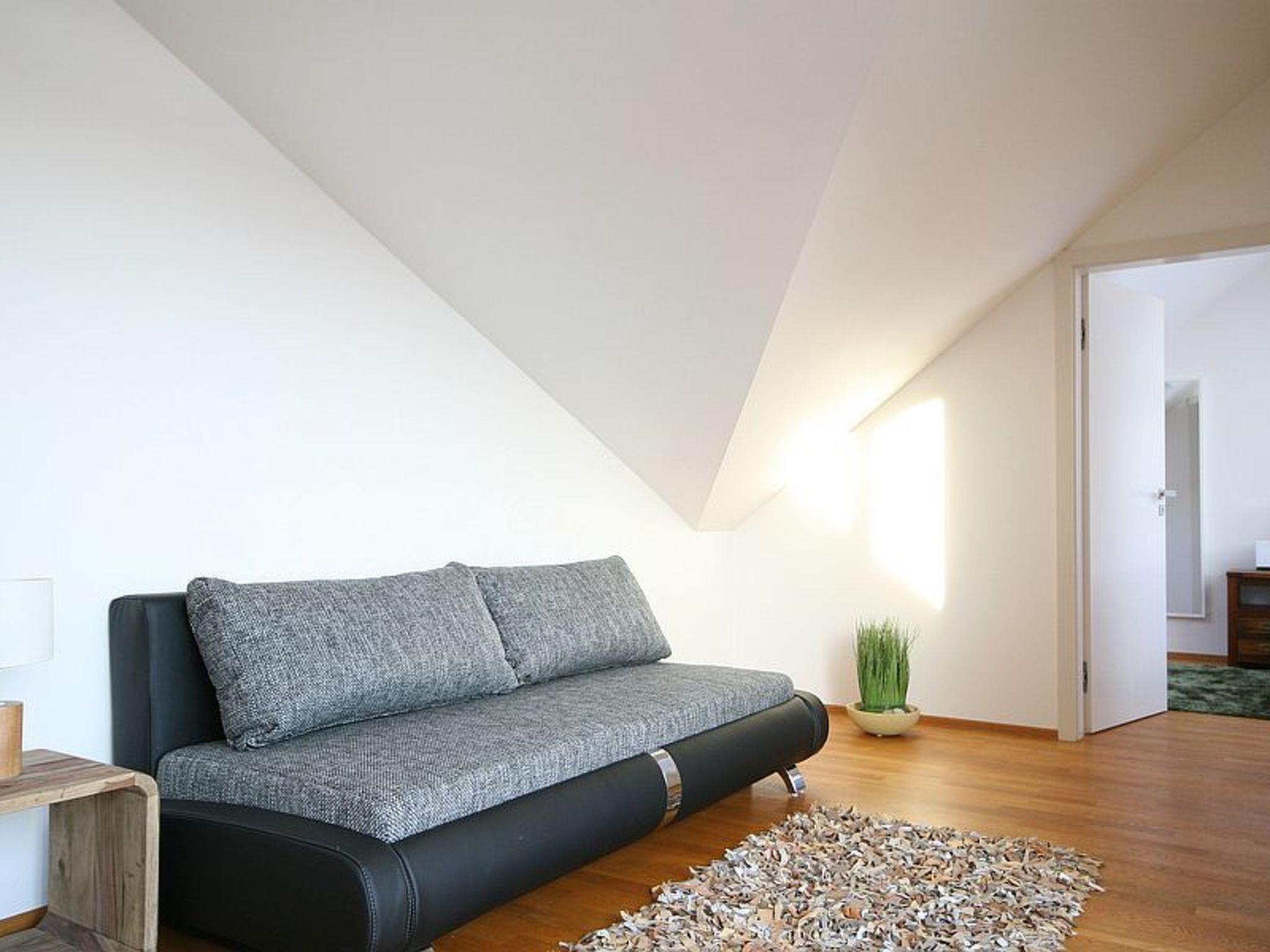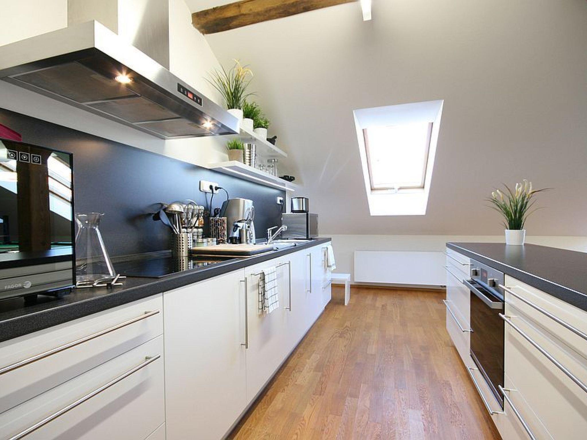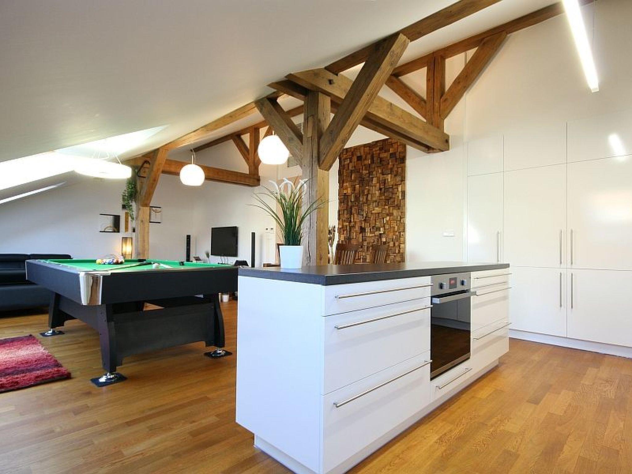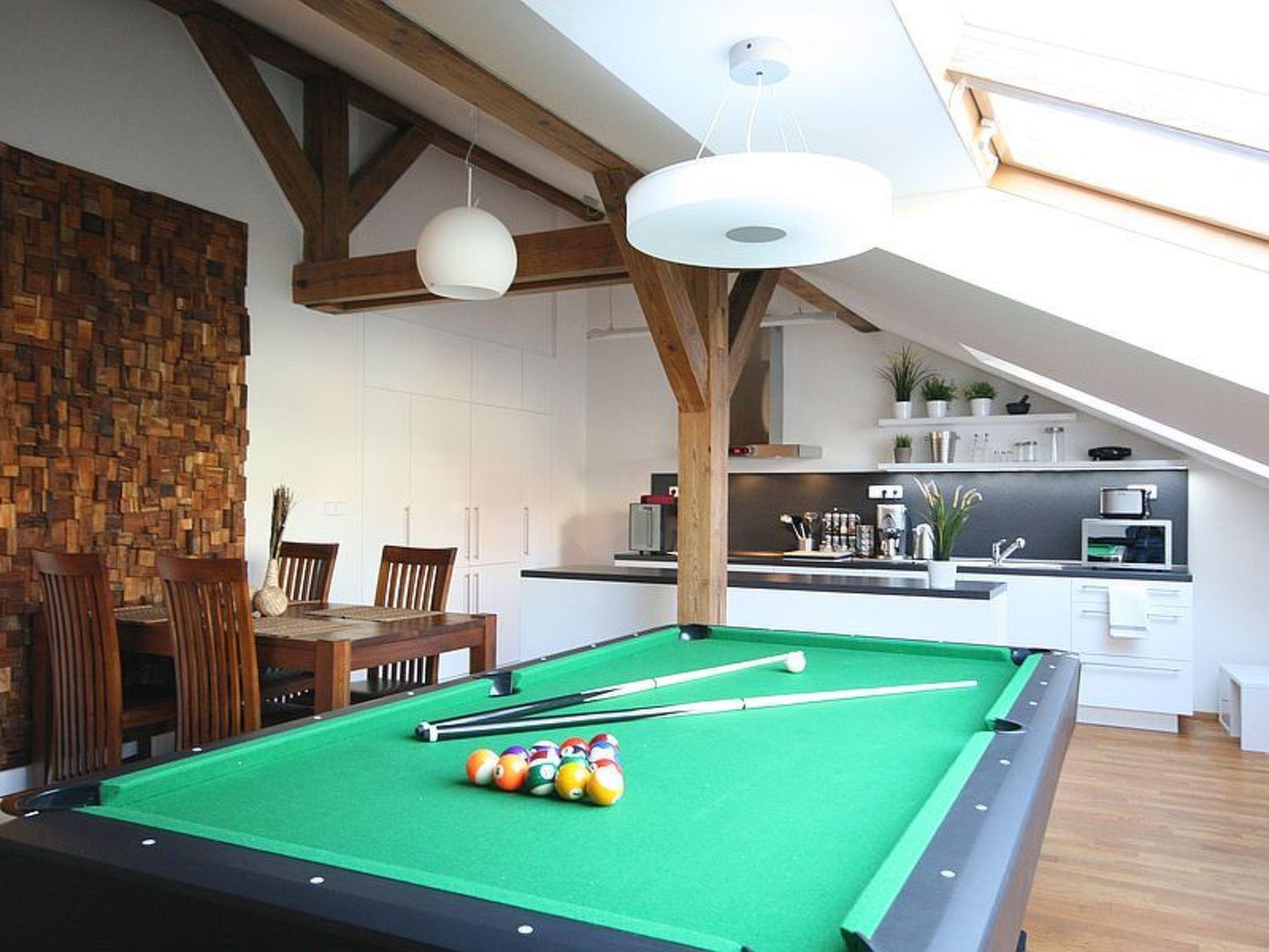The attic apartment carefully and tastefully furnished to a high standard, over the rooftops of Prague, was luxuriously renovated in 2013. Its ca. 147m² can accommodate four people. It has two bedrooms each with a double bed 180cm wide and a bathroom with a bath, shower and WC, as well as a guest WC. The generous living and dining room with a very modern, fully-equipped kitchen is just as impressive, with a preserved beam structure. You can find a leather sofa here for relaxing, and a flatscreen TV, as well as a pool table for more sociable evenings. The whole apartment has air conditioning and every room has heating. Wireless Internet access, a washing machine and dryer are available.