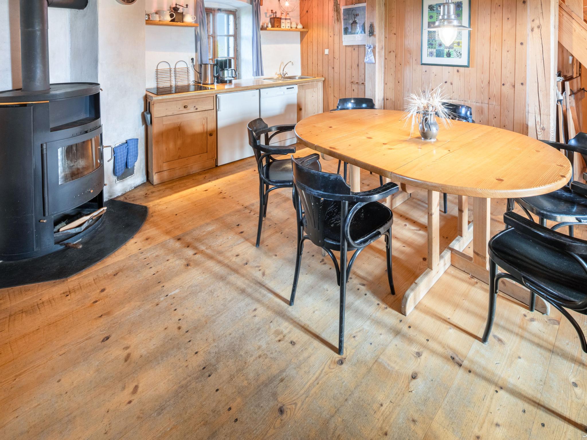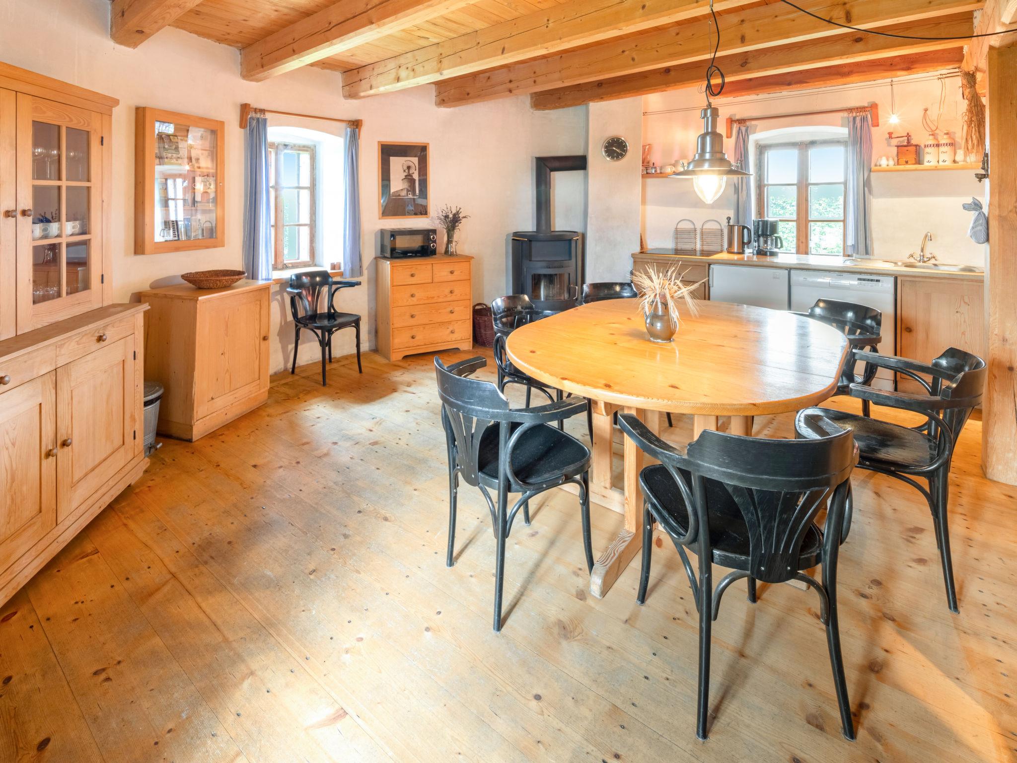 4-room house 104 m2 on 4 levels. Beautiful and stylish furnishings: kitchen-/living room (dishwasher, 4 induction hot plates, kettle, microwave, grill, electric coffee machine) with Scandinavian wood stove. Shower/WC. Upper floor: living room with TV and DVD. 2nd upper floor: open, 1 room with 3 beds (90 cm, length 200 cm). (open staircase) open gallery, - 160 cm with 3 beds (90 cm, length 200 cm). Wood heating. Patio. Barbecue. View of the countryside. Facilities: Internet (WiFi, free). Parking (fenced 3 cars). Please note: suitable for families. Non-smokers only. Maximum 2 pets/ dogs allowed. TV only CZ. Fire extinguisher. All the rooms in the house are without doors.