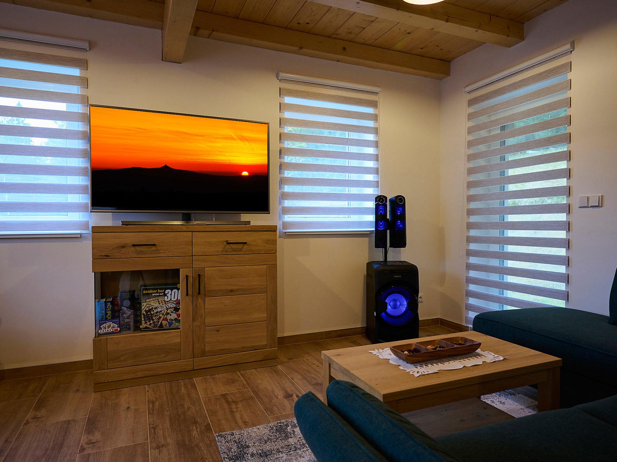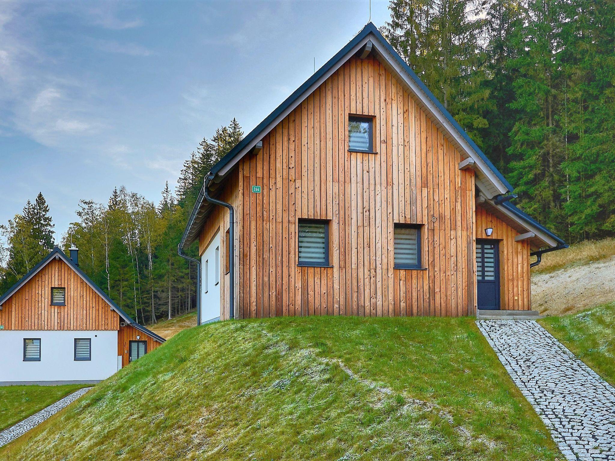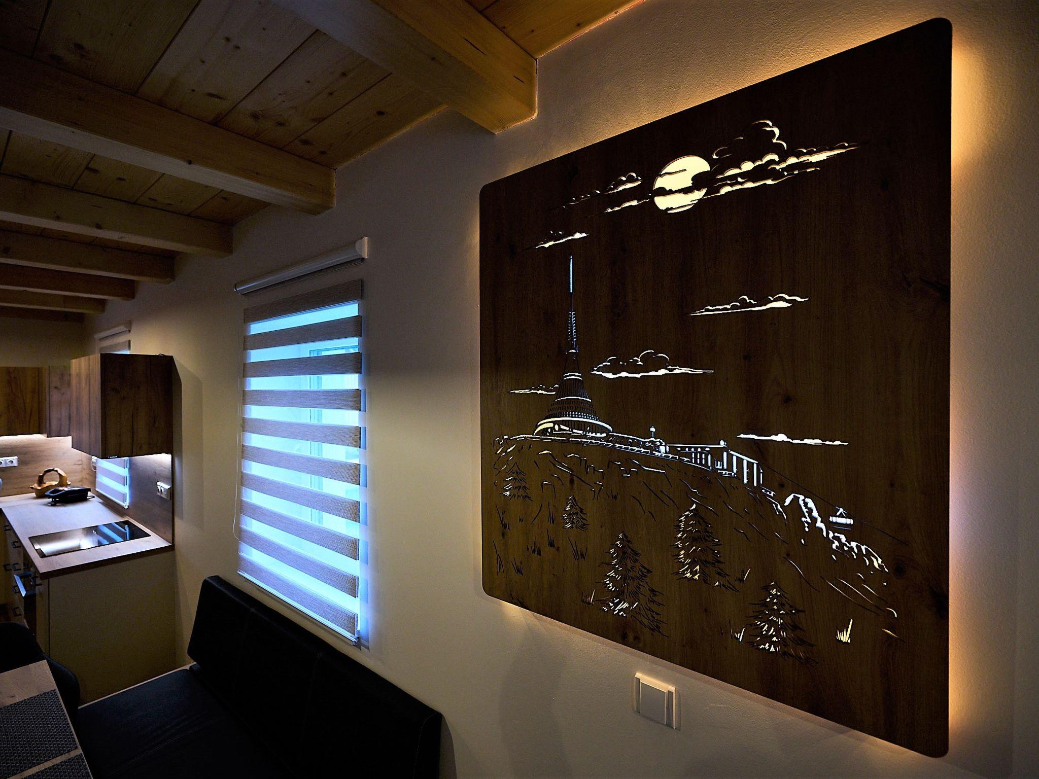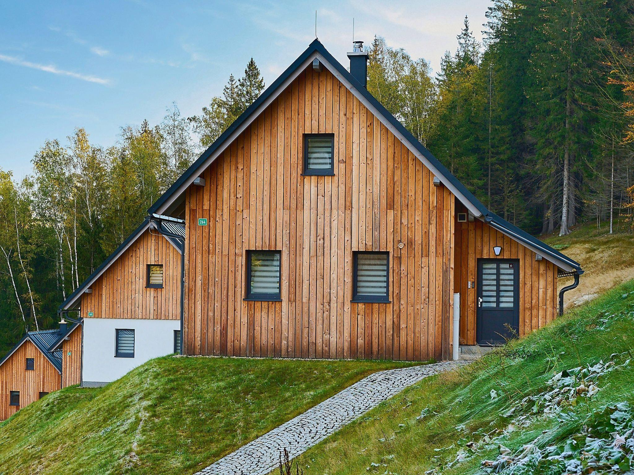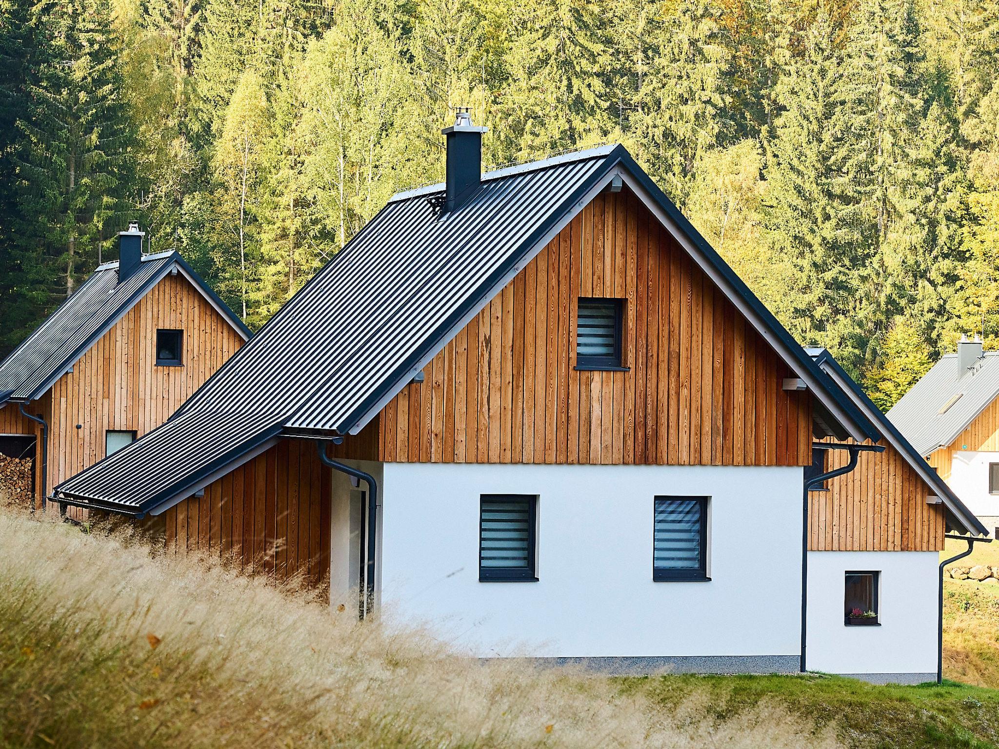 Very beautiful, comfortable chalet "U lesa", 2 storeys, detached, built in 2023. Outside the resort, along the wooded area, 2 km from the skiing area. Private: property. Terrace. In Winter: please take snow chains. Parking (in winter) at 70 m. Central parking spaces. Shop 2 km, grocery 2.5 km, supermarket 6 km, shopping centre 20 km, restaurant 2 km, bus stop "Jiretín pod Bukovou" 1.4 km, railway station "Jiretín pod Bukovou" 1.3 km, outdoor swimming pool 7 km, indoor swimming pool 20 km. Golf course (9 hole) 17 km, walking paths from the house 10 m, cycle lane 100 m, ski lift 2 km, slopes 2 km, ski rental 2 km, ski school 2 km, cross country ski track 100 m, children's playground 3 km. Nearby attractions: Rozhledna Cerná Studnice 6 km, Muzeum obrnené techniky Smržovka 6 km, Vodopády Jedlové 7 km, Kittelovo muzeum v Krásné 12 km, Aquapark Babylon, IQLandia, ZOO Liberec 22 km, Bozkovské jeskyne 22 km. Well-known ski regions can easily be reached: Tanvaldský Špicák 2 km, Filip Smržovka 4 km, Svetlý Vrch Albrechtice 4 km, Josefuv Dul 7 km, Severák, Bedrichov 12 km. Hiking paths: Hrebenovka. Please note: Loading and unloading of baggage is possible at the holiday house.