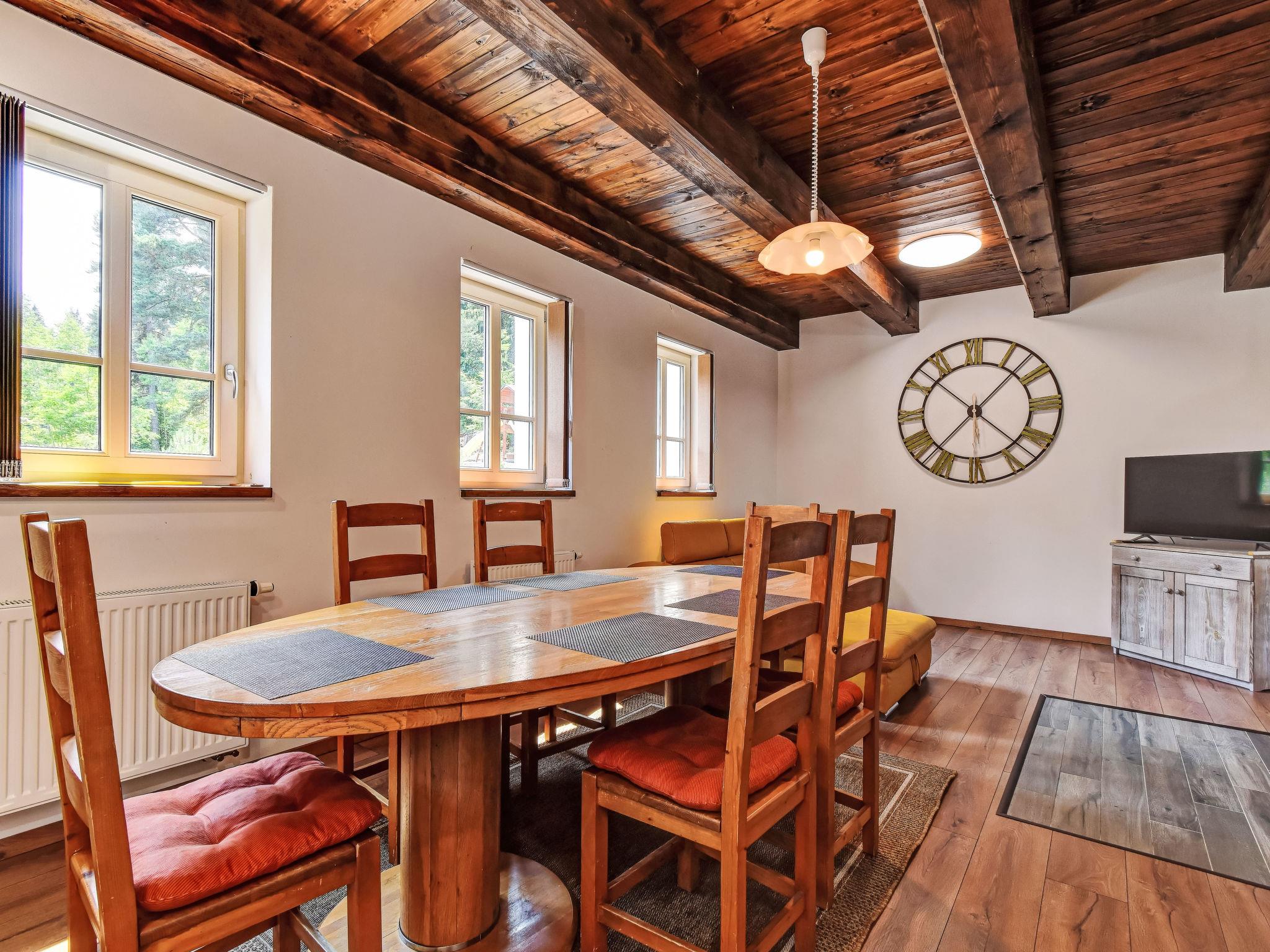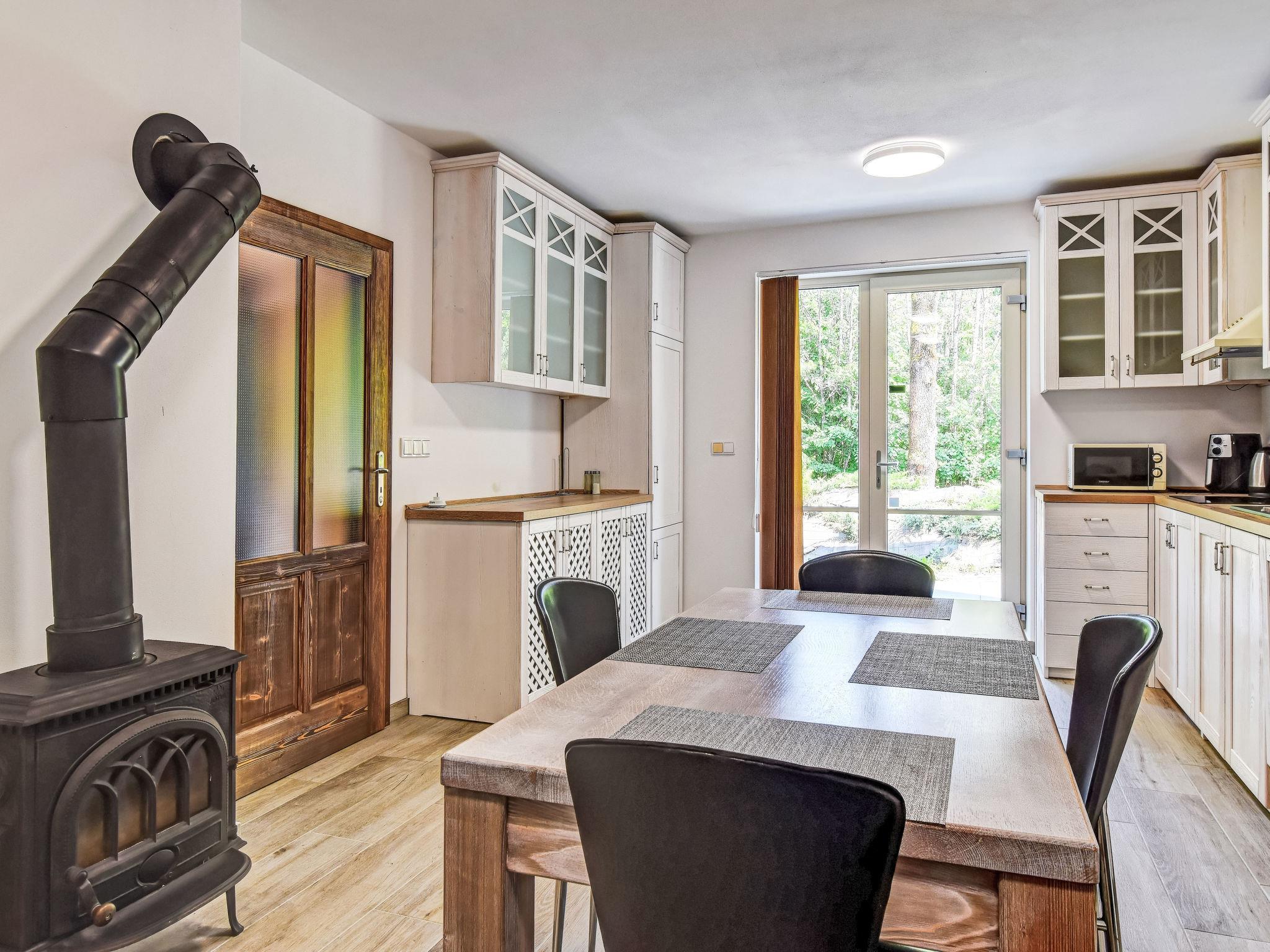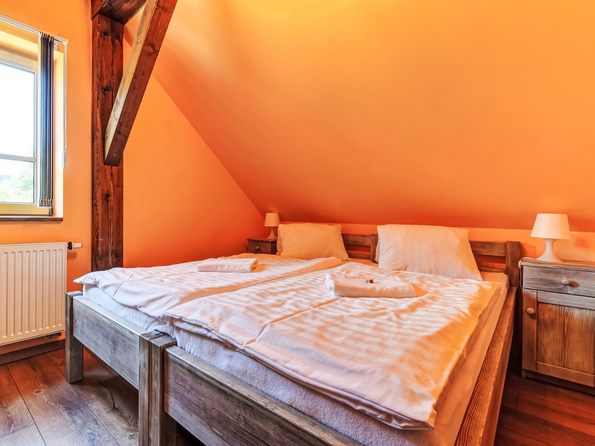 "Zadov", 9-room cottage 300 m2 on 3 levels. Stylish and wooden furniture furnishings: 1 room 13 m2 with 1 double bed. 1 room 15 m2 with 1 double bed. Kitchen-/living room 28 m2 (oven, dishwasher, 4 ceramic glass hob hotplates, kettle, microwave) with 1 sofabed, dining table and TV. Shower/WC. Heating. On the lower ground floor: 1 room 15 m2 with 1 double bed. Exit to the terrace. Kitchen-/living room 26 m2 (oven, dishwasher, 4 ceramic glass hob hotplates, kettle, microwave) with 1 sofabed, Scandinavian wood stove, dining table and TV. Exit to the terrace. Shower/WC. Heating. Upper floor: (spiral staircase), 1 room 17 m2 with 1 double bed. 1 room 12 m2 with 2 beds. 1 small room 10 m2 with 1 double bed. Large kitchen-/living room 38 m2 (oven, dishwasher, 4 ceramic glass hob hotplates, kettle, microwave) with 1 sofabed. Bath/shower/WC. Wooden floors. Facilities: Internet (WiFi, free). Please note: fire extinguisher, no lift.