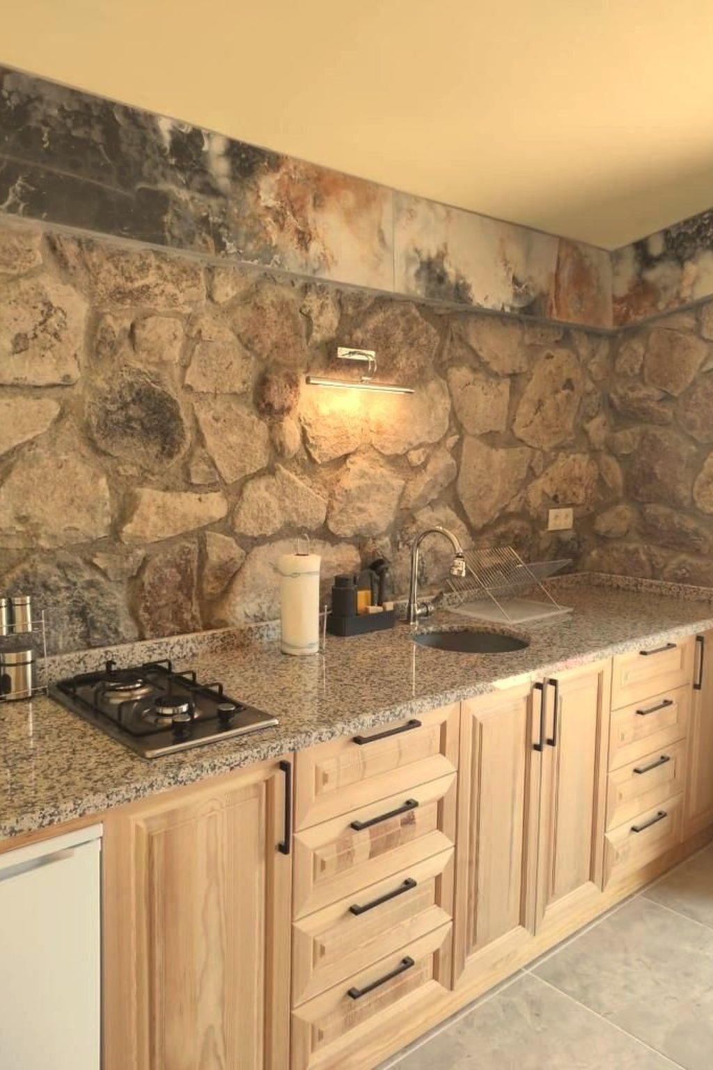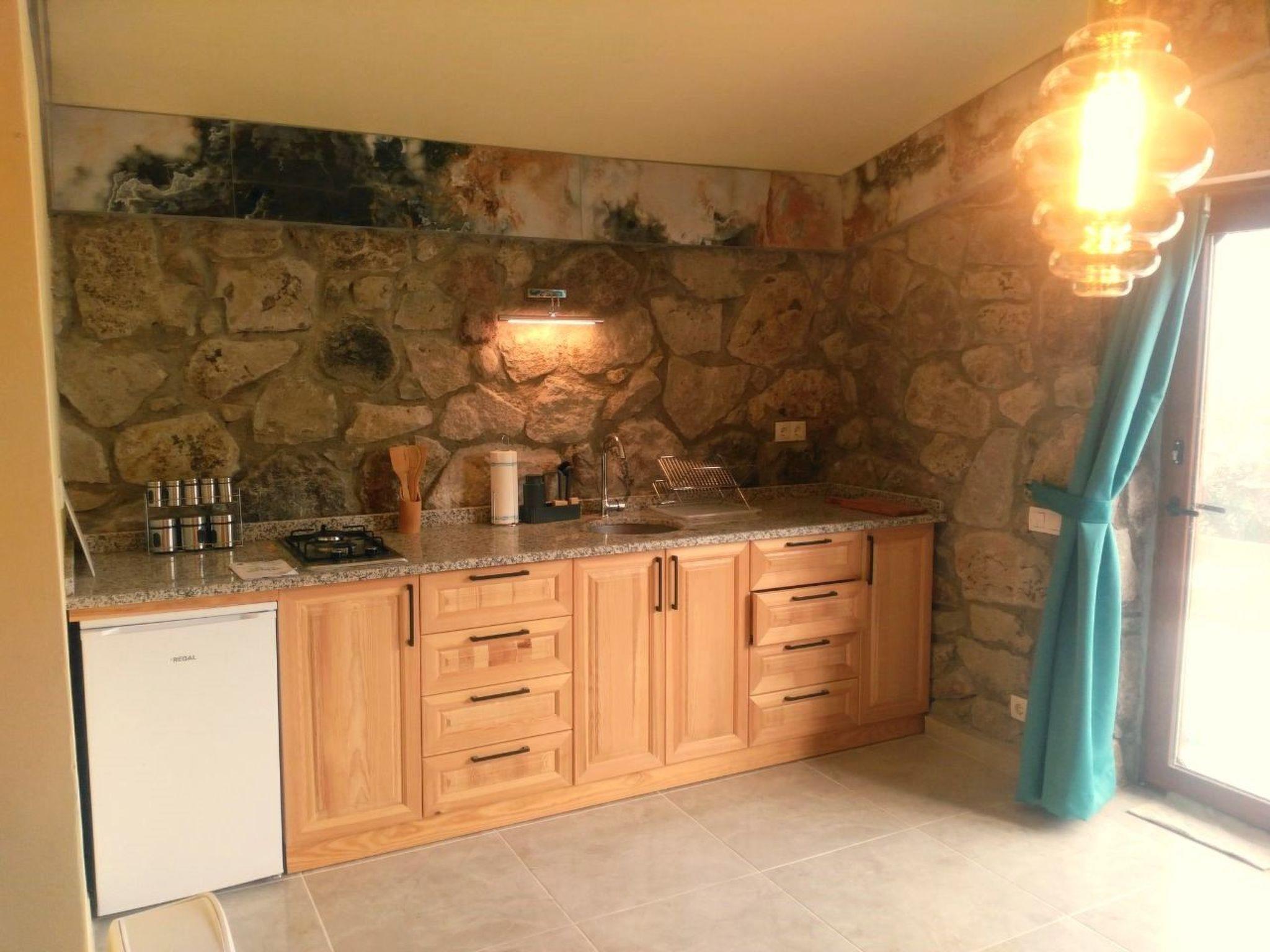 The guest house was newly and elaborately built in 2023. It is located on a gentle slope and could therefore be built into this slope. Except for the front façade made of natural stone, the house lies in the ground. The house therefore has a pleasant climate. The roof is also made of earth and houses a roof garden with a terrace. The architecture is extraordinary (see photos). Some say it is modern and archaic at the same time. It has 2 rooms. Each room has a double bed, a shower with toilet and a beautiful customised kitchen made of solid wood. An antique table and three matching chairs invite you to dine and so on. Each room has the same furnishings. A large light-absorbing curtain guarantees pleasant darkness even in daylight. In the cooler seasons, the rooms are heated with an air heat pump via underfloor heating.