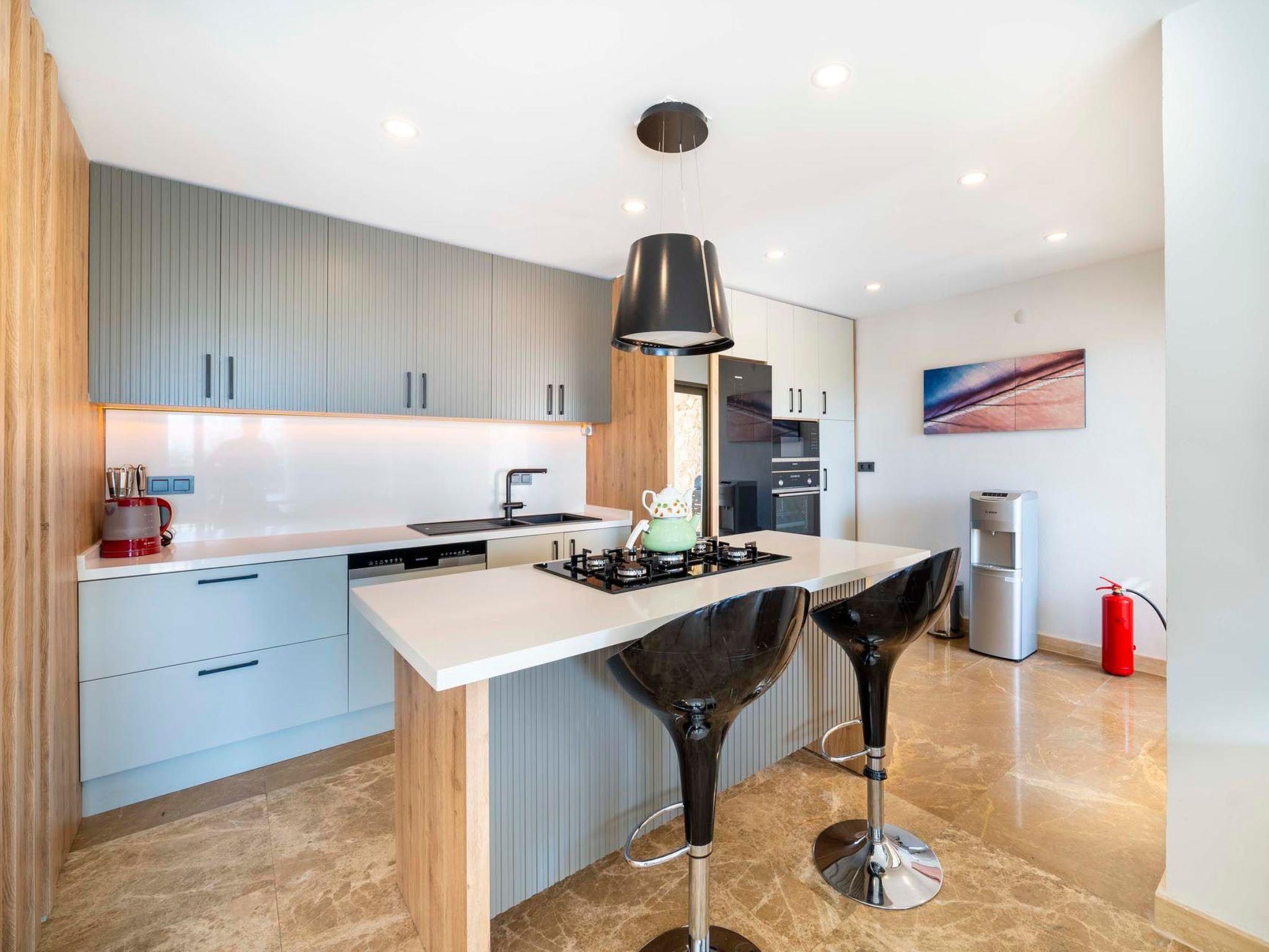 A particular highlight of the villa is the breathtaking infinity pool, which blends seamlessly into the surroundings and offers spectacular views of the sea and the surrounding mountains. The outdoor area also includes a large terrace with comfortable loungers, a shaded seating area and an outdoor dining area, perfect for cosy evenings with a barbecue or a glass of wine.