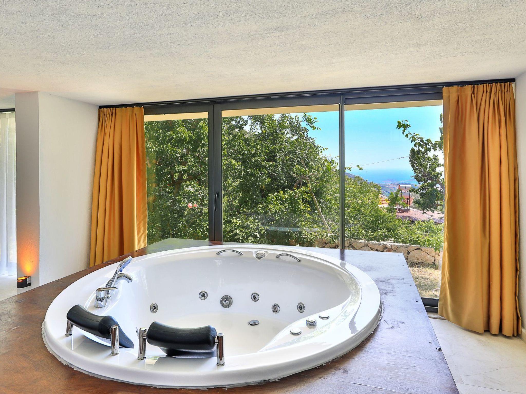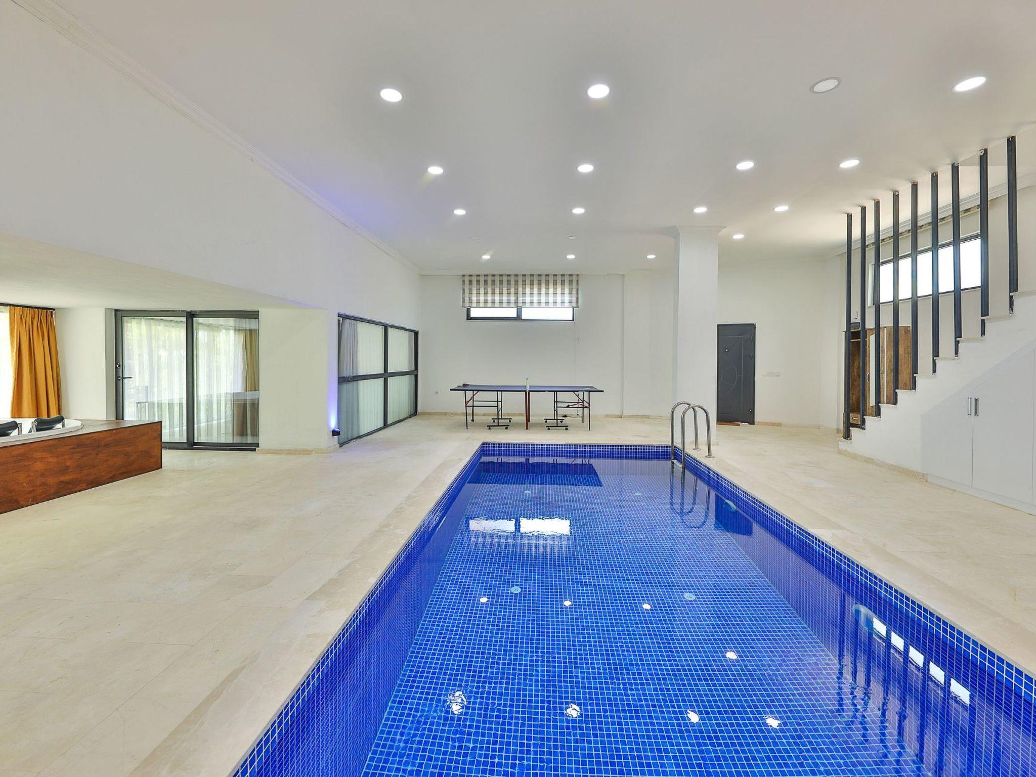 This special villa is located in the quiet neighbourhood of Islamlar in Kalkan, surrounded by nature and with a distant view of the sea. Thanks to its location overlooking the valley, it offers a peaceful holiday atmosphere. With 3 bedrooms, it can accommodate up to 6 people. The secluded, sheltered outdoor area makes it ideal for conservative families and honeymoon couples. The spacious garden features a private pool, sun loungers, a cosy seating area, a barbecue area and a dining table with a view. Inside the stone house-style villa there is also an indoor pool, whirlpool, Turkish bath, sauna and table tennis.