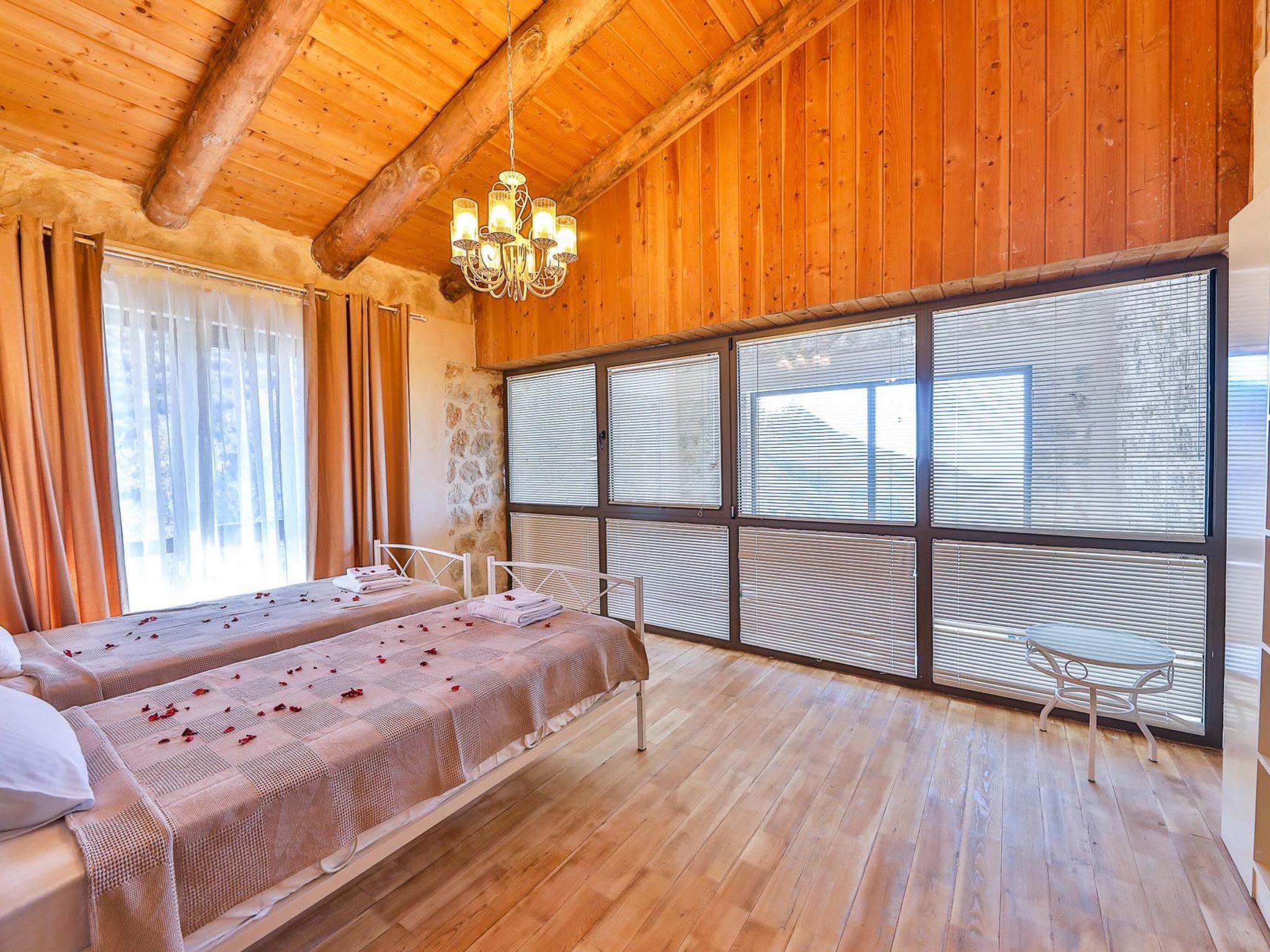 Inside the villa, a cosy living area awaits you, designed with loving attention to detail and comfortable furniture. High ceilings, warm wooden accents and an open fireplace create an inviting atmosphere that will make you feel right at home.
