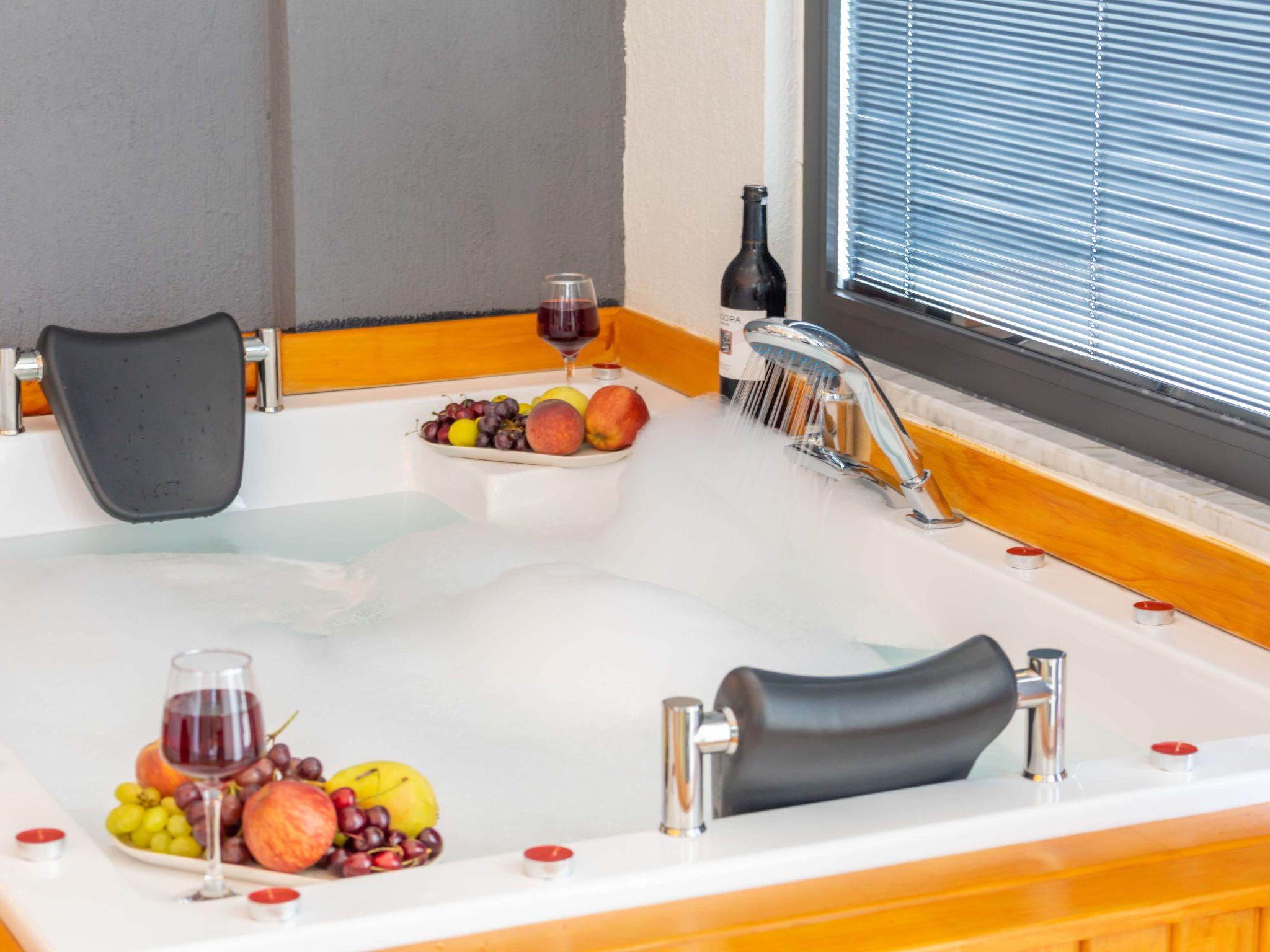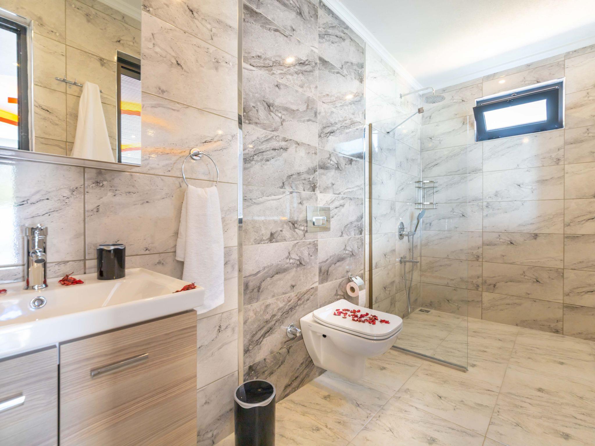 Inside the holiday home, there are two bedrooms and two bathrooms, which are equipped with a shower and a bathtub and can comfortably accommodate up to four guests. Air conditioning, which is available throughout the accommodation, ensures pleasant temperatures at any time of year. For self-catering guests, the kitchen with gas hob, dishwasher and kettle has everything you need to prepare meals with ease. A washing machine is also available for exclusive use, which is particularly practical for longer stays.