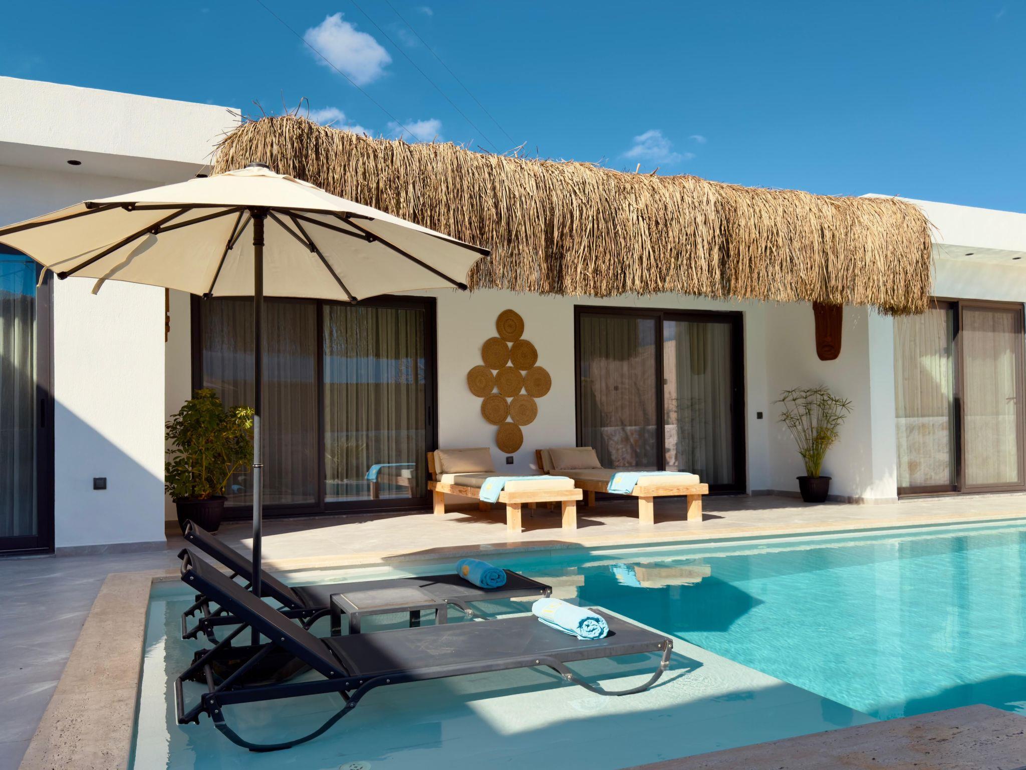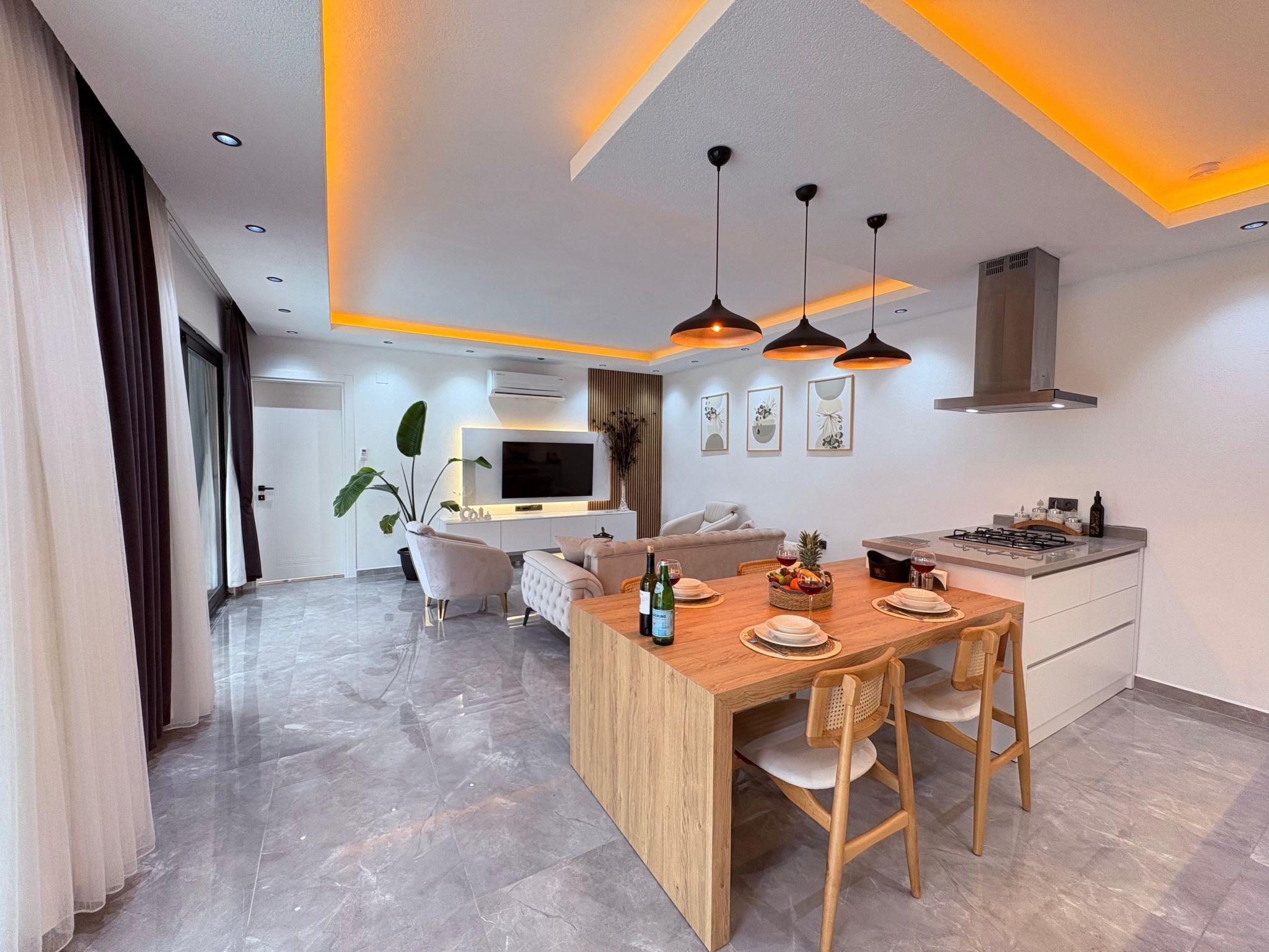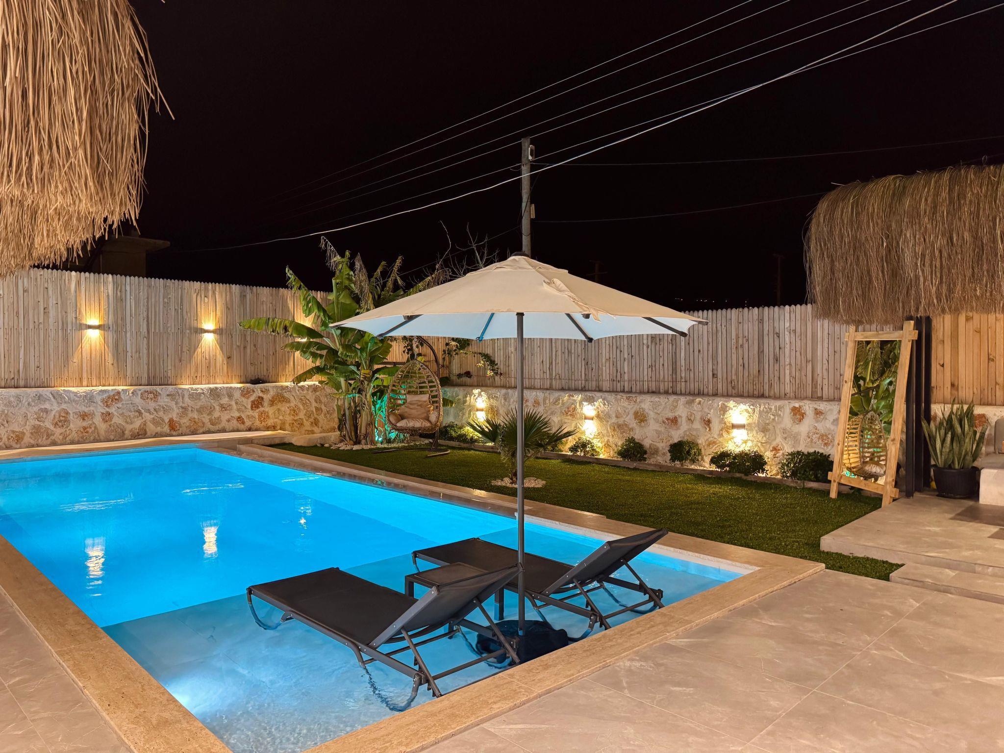 The villa is located in the Kalkan-Patara region and is furnished in a stylish boho design. With 2 bedrooms, it offers space for up to 4 people. Modern elements have been harmoniously combined with natural materials. The master bedroom has a jacuzzi, the pool area is sheltered from view and the outdoor area is stylishly designed - ideal for honeymooning couples or small families looking for peace and privacy. The spacious garden, sun loungers and relaxed atmosphere make the villa the perfect choice for a stylish and comfortable holiday.