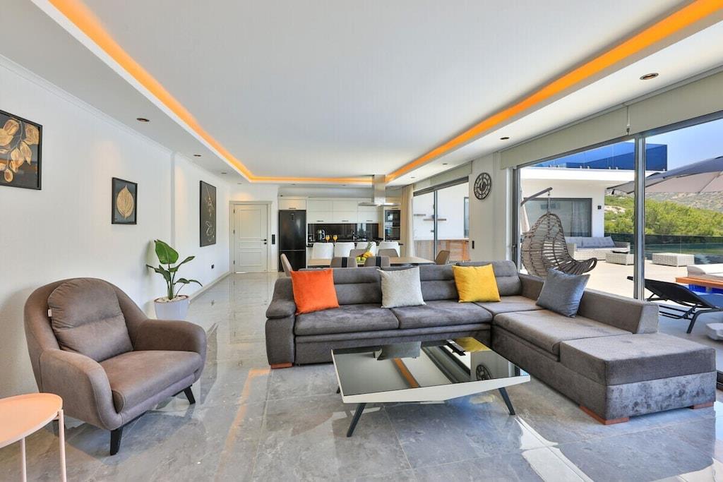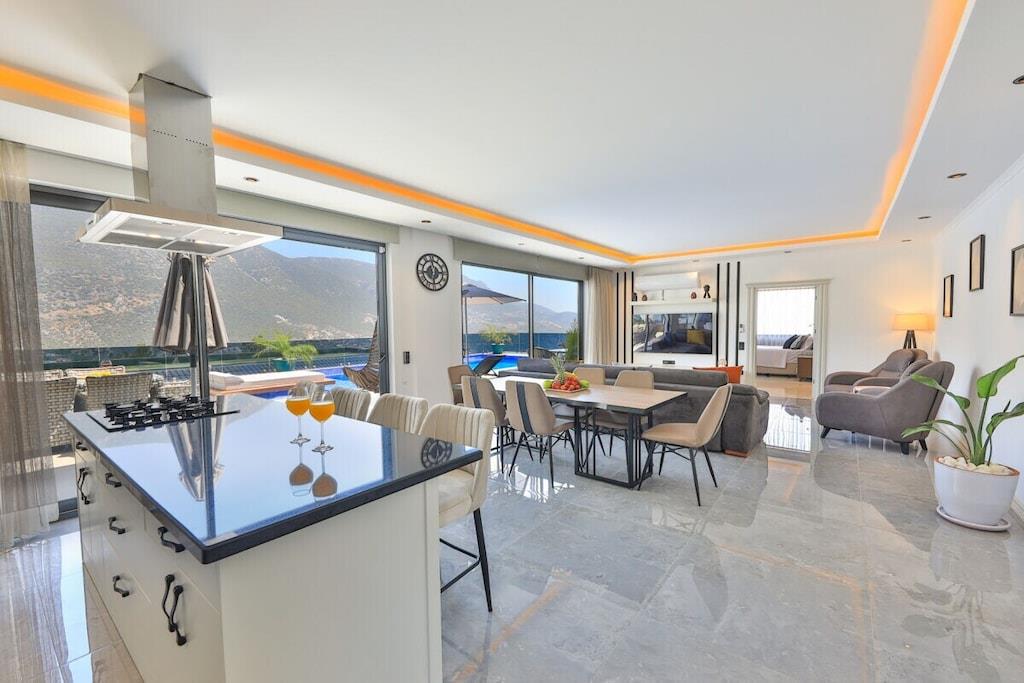 Villa Siro is a modern and spacious villa in Kalkan Incebel that can accommodate up to 4 people. The villa has 2 spacious bedrooms. The living room is modern and spacious, offering plenty of space to relax. From here, you have access to a large terrace, perfect for sharing meals or relaxing with a glass of wine. The villa has a fully equipped kitchen with everything you need for self-catering. There is also a dining table where you can enjoy meals together. Villa Siro offers modern comforts and beautiful views of the surrounding countryside. You will enjoy the spacious and comfortable rooms as well as the beautiful location.