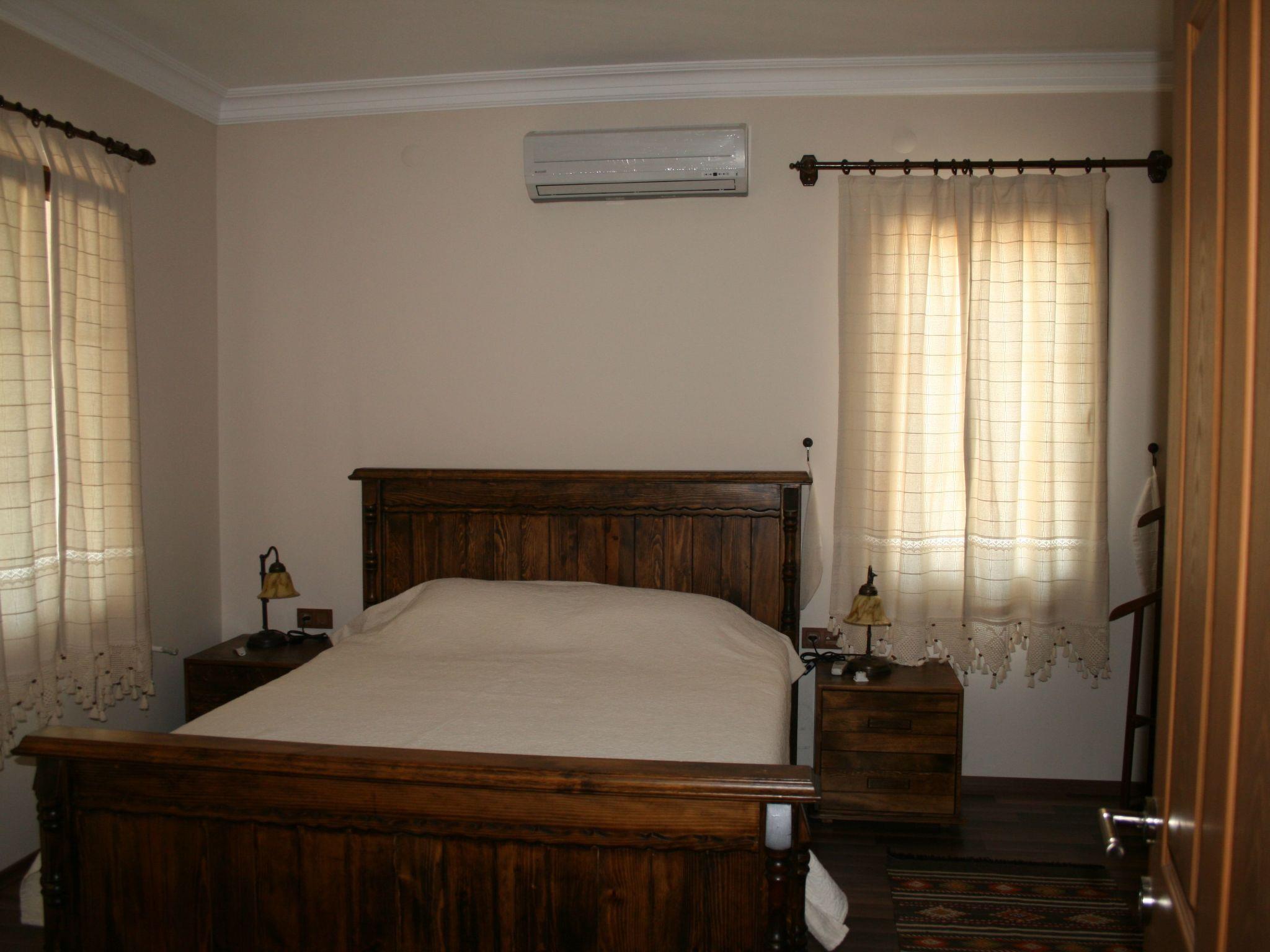 There are two en-suite bedrooms and two twin bedrooms. En-suite rooms have one double bad size width 1.80 m (rustic wood bed) , rustic wood wardrobe, air conditioning with a private bathroom. Twin bedroom have two single bed size width 90 cm (rustic wood ) , rustic wood wardrobe, air conditioning, There is a exterior bathroom each floor .There are two balconies and one closet room upstairs. There is a laundry room downstairs. The ground floor is about 80 m² in size and comprises of the following rooms: A living room with a fireplace, a flat screen TV and a living room with furniture. There is a fully-equipped kitchen with an oven, microwave, coffee machine and a dining area. The ceilings are very high.