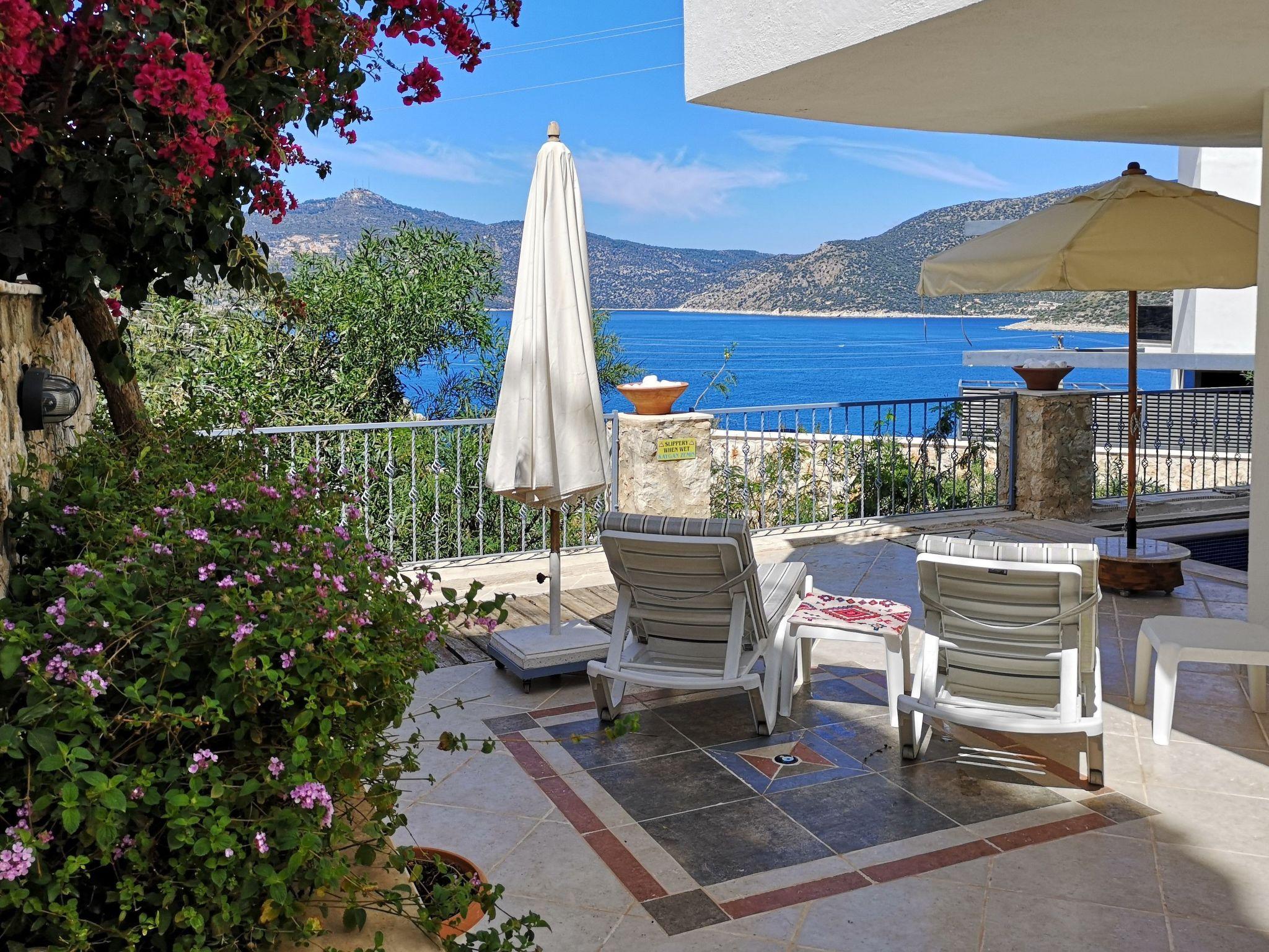 All bedrooms except one twin bedroom have generous balconies. The penthouse bedroom has its own roof terrace with fabulous views over the bay and across to Kalkan. The pool area has a lovely large stone topped table and chairs, and a stone built barbecue, ideal for outdoor dining under the stars. The views are truly wonderful, blue sea and sky, and mountains in the distance. You even have a choice of two terraces: One by the pool and one with a shady area complete with sofas and table. On this level you can still see the sea, and there is a table tennis table for the energetic. This is a lovely evening drinks area.