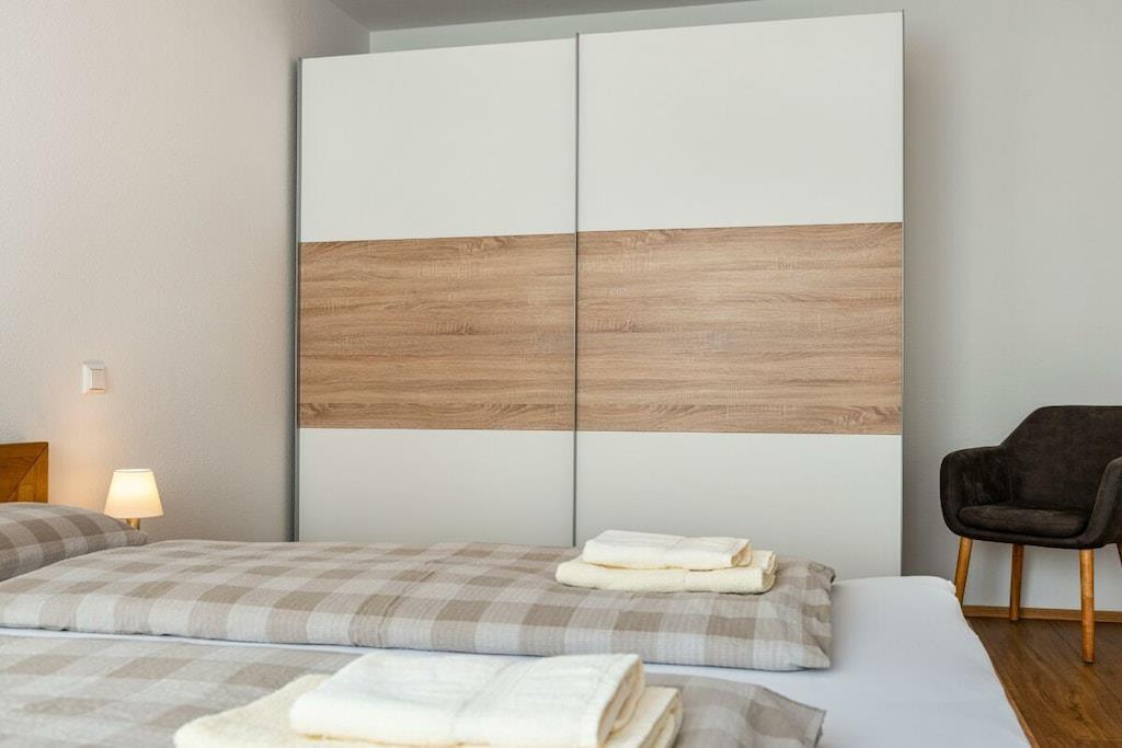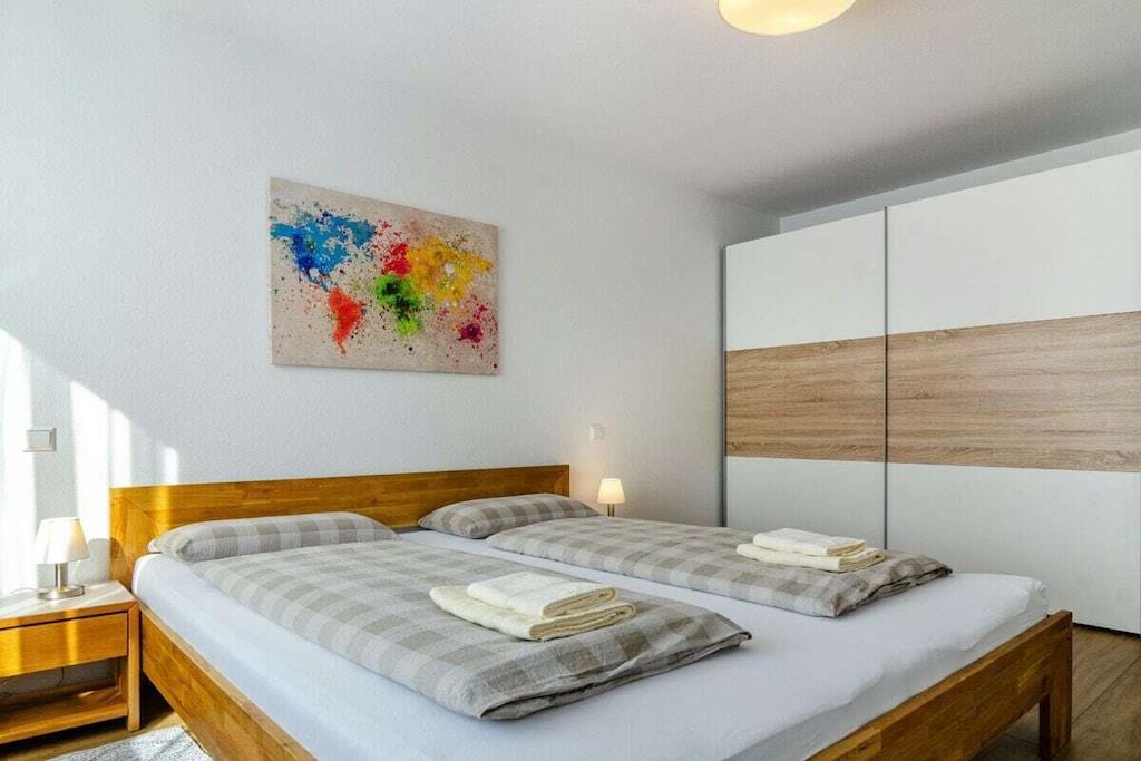 Your holiday apartment in Überlingen on Lake Constance. The 2.5-room apartment ALEX F****/DTV, located on the first floor of a modern apartment building, is fully equipped and offers everything you need for a perfect stay in Überlingen. A large south-facing balcony/terrace, elevator, underground parking, bicycle storage, and free Wi-Fi are all included. Ideal for two people. The apartment features a spacious living room with a dining area, a fully equipped kitchen, and a south-facing balcony/terrace. There is a separate bedroom with a double bed and TV, a bathroom with shower and toilet, a hairdryer, underground parking, and bicycle storage. A baby cot and highchair are available upon request. Maximum occupancy is two adults and one child up to two years old in a baby cot or sleeping in the parents' bed.