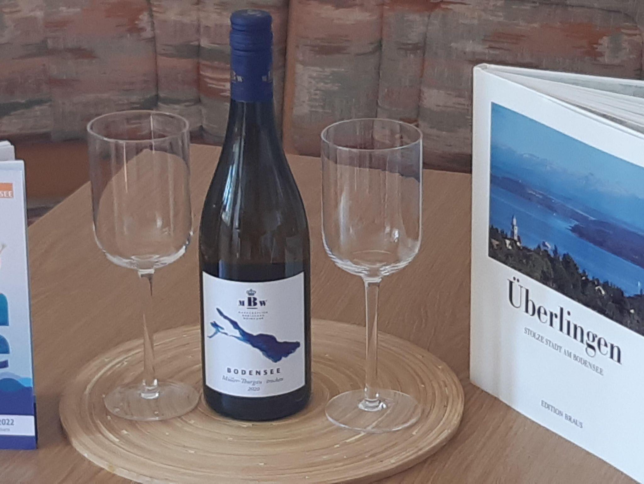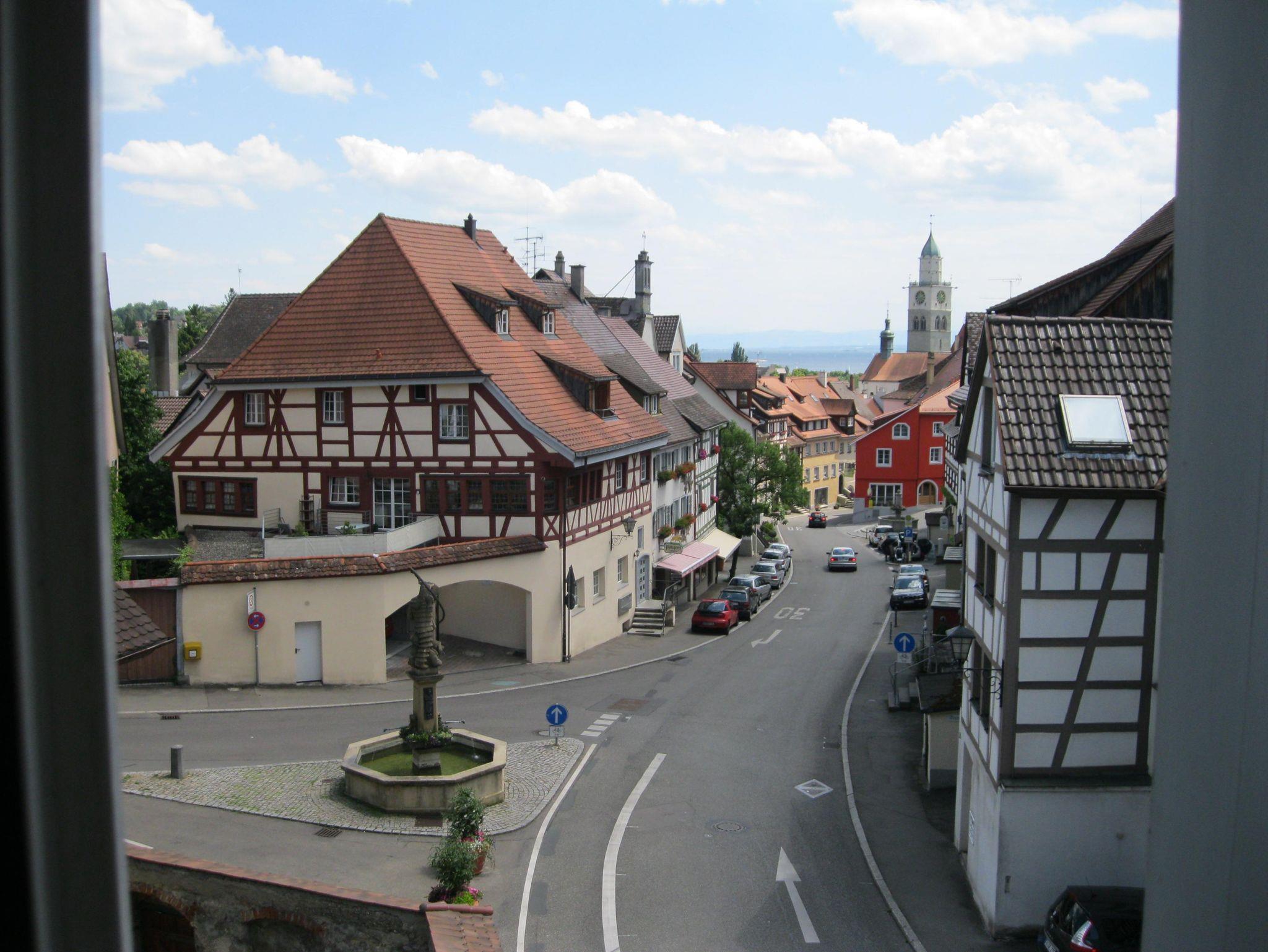 Inmitten anderer Fachwerkhäuser haben wir den Blick über die Altstdt zum See und den Alpen. Wir sehen die Fähre nach Konstanz sowie die Insel Mainau vom Fenster aus.