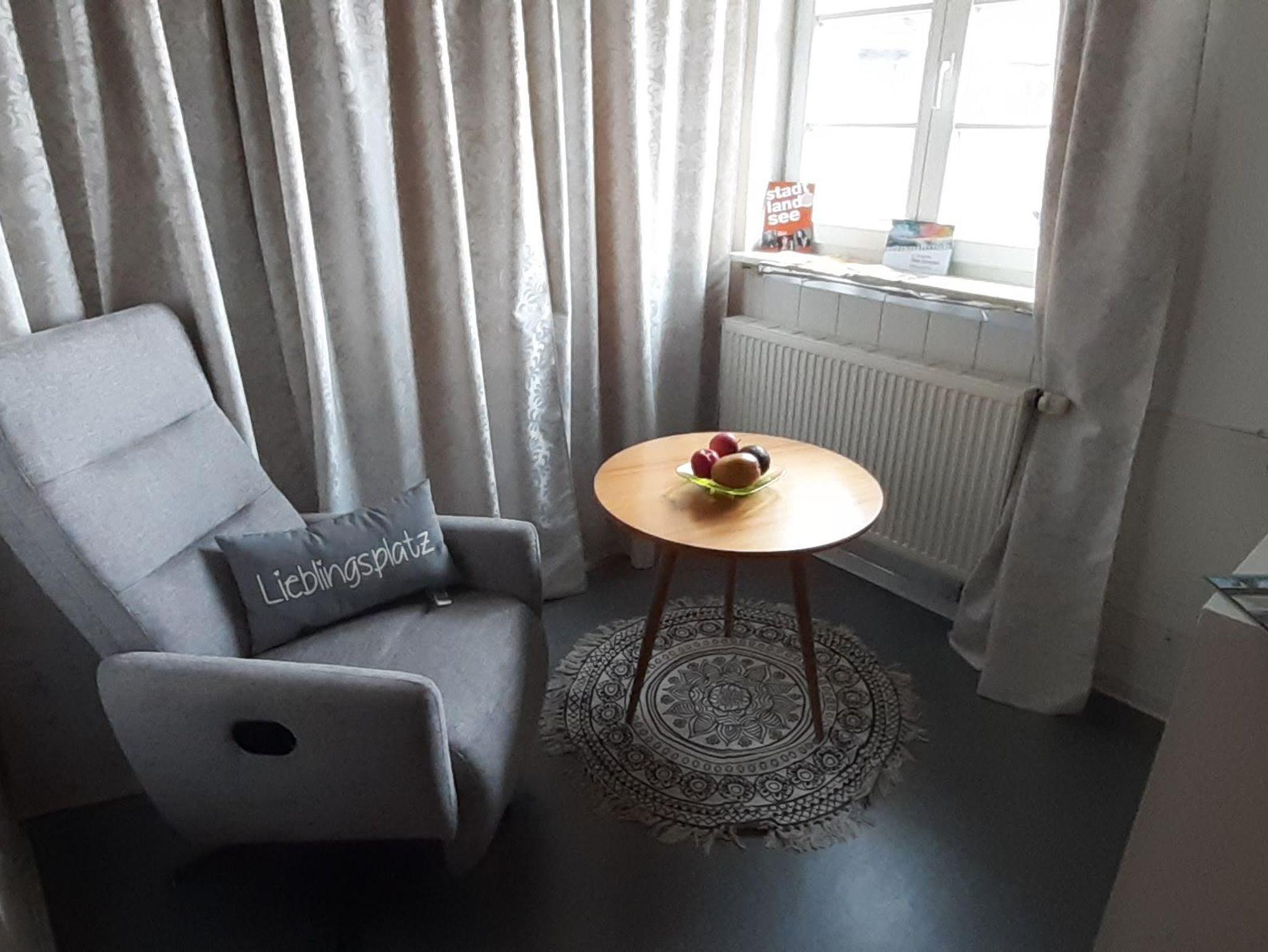 Unser Haus ist durch eine Außentreppe erreichbar. Über das innere Treppenhaus kommen Sie in die Wohnung im 2. Stock. Es erwartet Sie eine Diele mit Garderobe und einen Leseraum, der einen bequemen Lesesessl sowie einen Fernseher und Infomaterial über den Urlaubsort enthält. Auf gleicher Ebene ist eine voll ausgestattete Wohnküche und ein Badezimmer mit WC. Das Schlafzimmer ist dann noch eine Etage höher - von hier haben sie einen tollen Überblick über die Stadt, den See, bis zum Säntis.