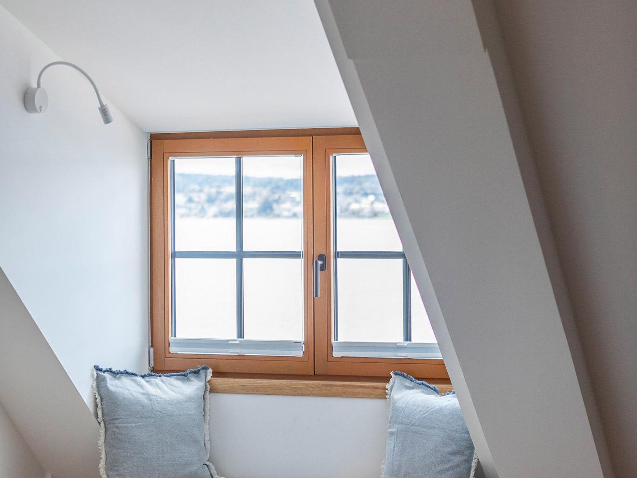 Doppelbett, größeres, rollstuhlgerechtes Bad mit WC und Dusche, kleine Küchenzeile mit Herd, Wasserkocher, Toaster und Kaffee-Pad-Maschine; Geschirr und Kochutensilien; Geschirrspülmaschine, Kühlschrank und Mikrowelle; Bettwäsche und Handtücher; Smart-TV, Tisch mit zwei Stühlen, Schrank, gemütliches Lesefenster mit Sitzbank in der Dachgaube; hell, mit Bodensee- und Alpenblick. Haustiere sind nicht erlaubt.