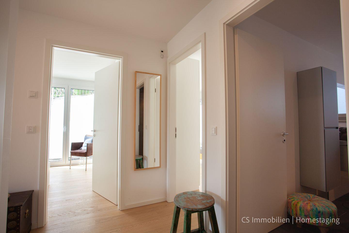 Sie erreichen die Wohnung bequem über den Tiefgarageneingang, von dem aus Sie direkt mit dem Aufzug in die Wohnung gelangen können (bitte die 2. Etage wählen). Beim Betreten der Wohnung erwartet Sie ein Flur mit großzügigem Garderobenschrank und Ganzkörperspiegel.