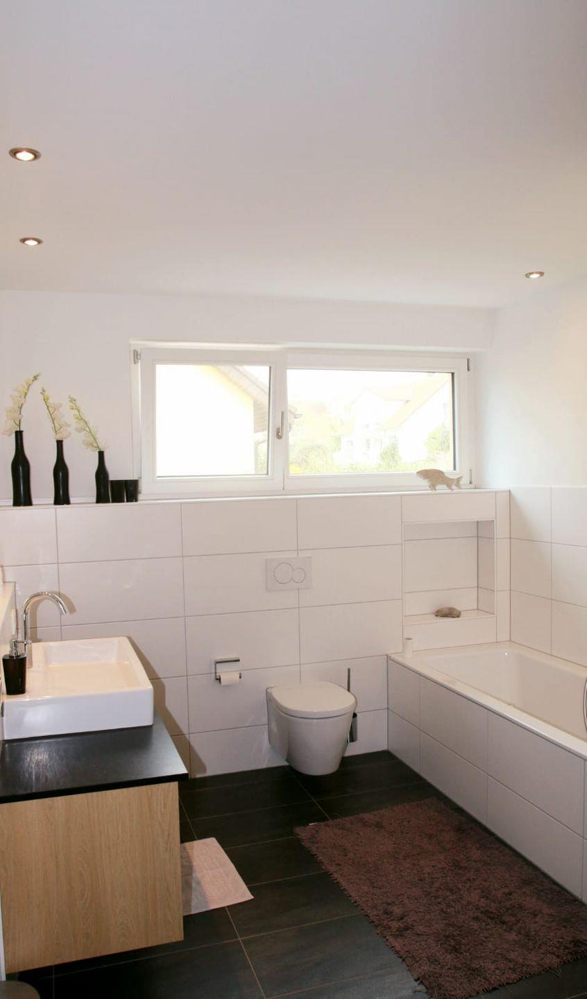 Im modernen Naturstein-Badezimmer finden Sie eine großzügige, bodenebene Regendusche, eine entspannende Badewanne, einen beleuchteten Waschtisch mit Ablagefläche sowie ein WC. Ein zusätzliches, separates Gäste-WC erhöht den Komfort.