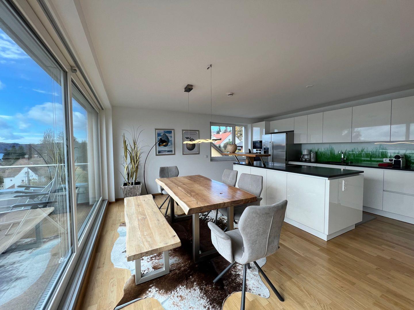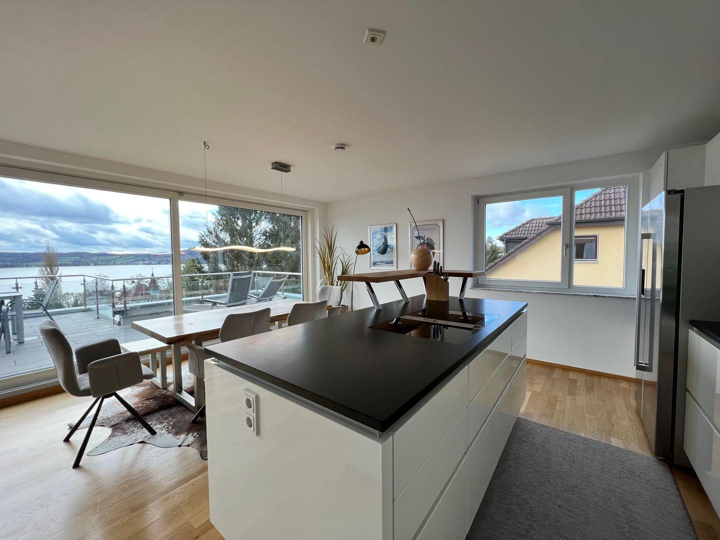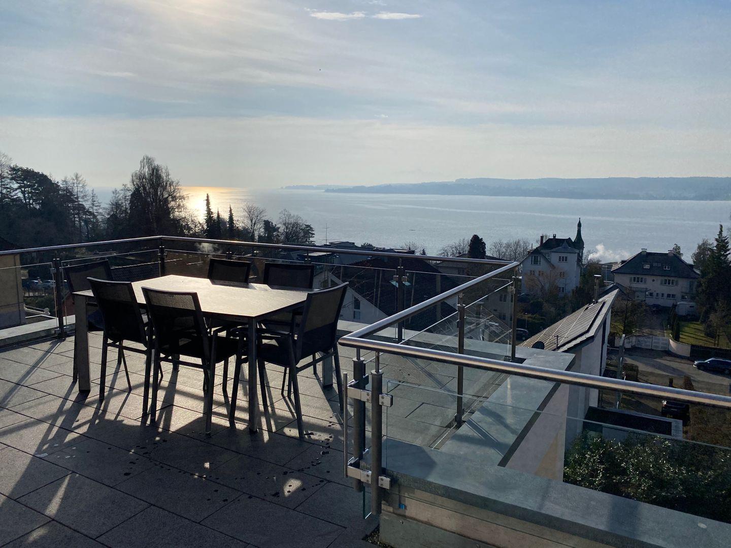 Skyline präsentiert eine elegante Design-Ausstattung auf zwei Ebenen. Hochwertige Materialien und moderne Möbel schaffen ein exklusives Wohnerlebnis. Die großzügige Dachterrasse bietet einen traumhaften Blick auf den Bodensee. Modernes Outdoor-Mobiliar lädt zu geselligen Abenden im Freien ein.