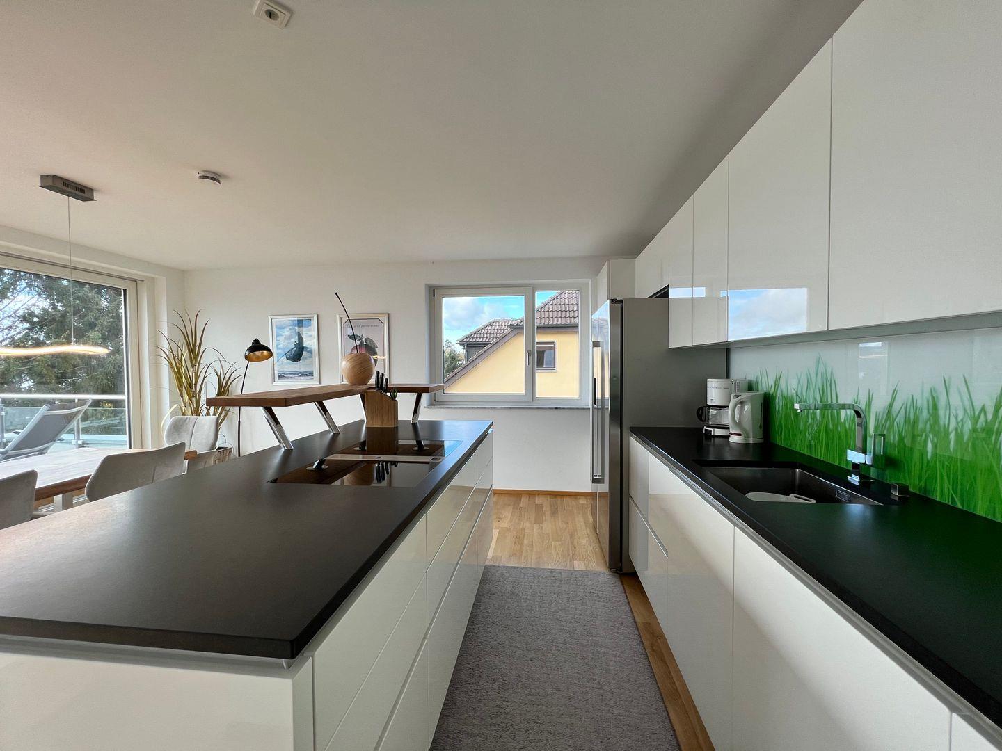 Die offen gestaltete Küche verfügt über einen modernen Induktionsherd, einen geräumigen Kühlschrank, eine Spülmaschine und eine vollständige Kochausstattung. Die großzügige Kücheninsel ermöglicht ein geselliges Kocherlebnis.