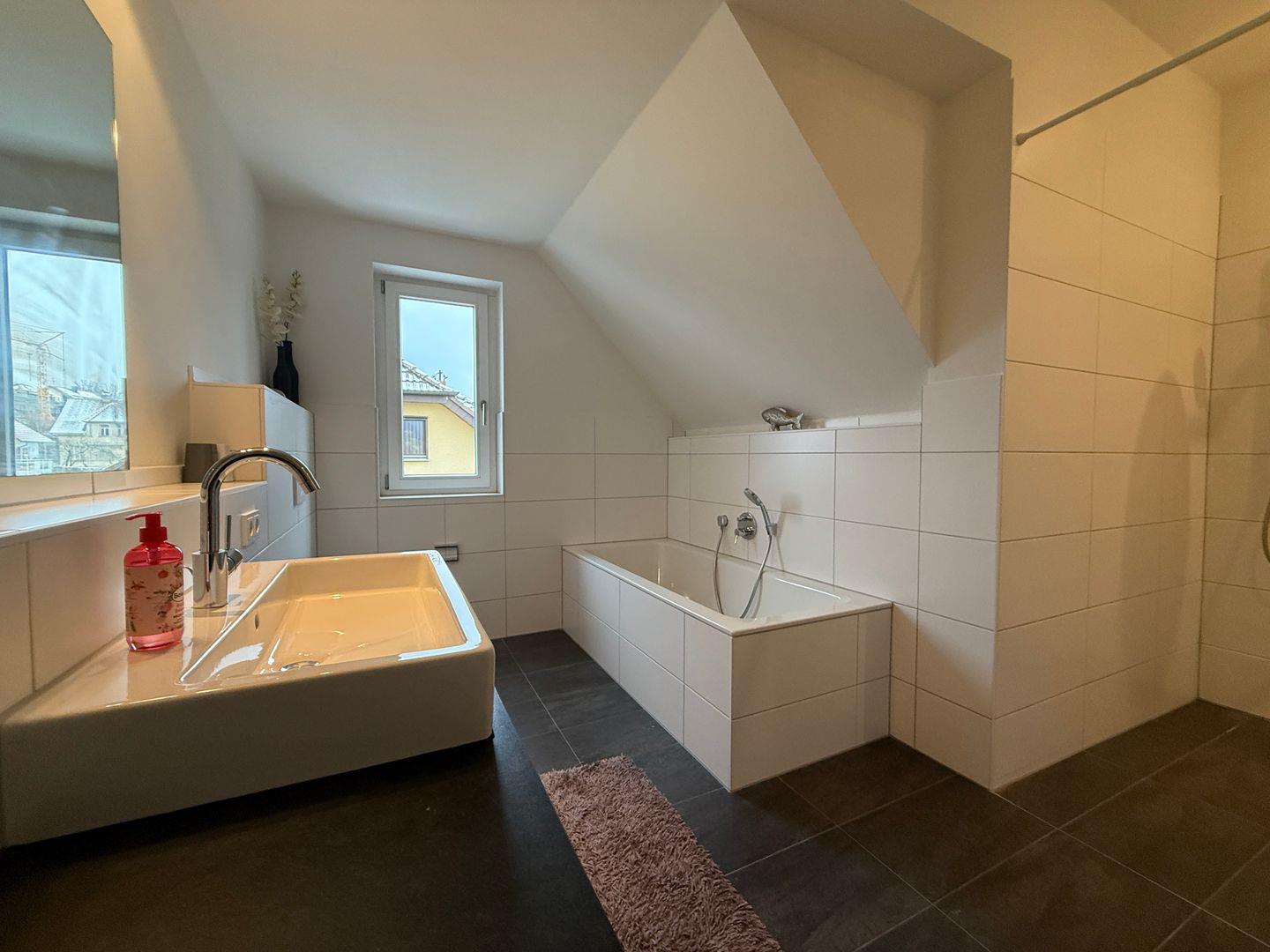 Im modernen Naturstein-Badezimmer finden Sie eine großzügige, bodenebene Regendusche, eine entspannende Badewanne, einen beleuchteten Waschtisch mit Ablagefläche sowie ein WC. Ein zusätzliches, separates Gäste-WC erhöht den Komfort.