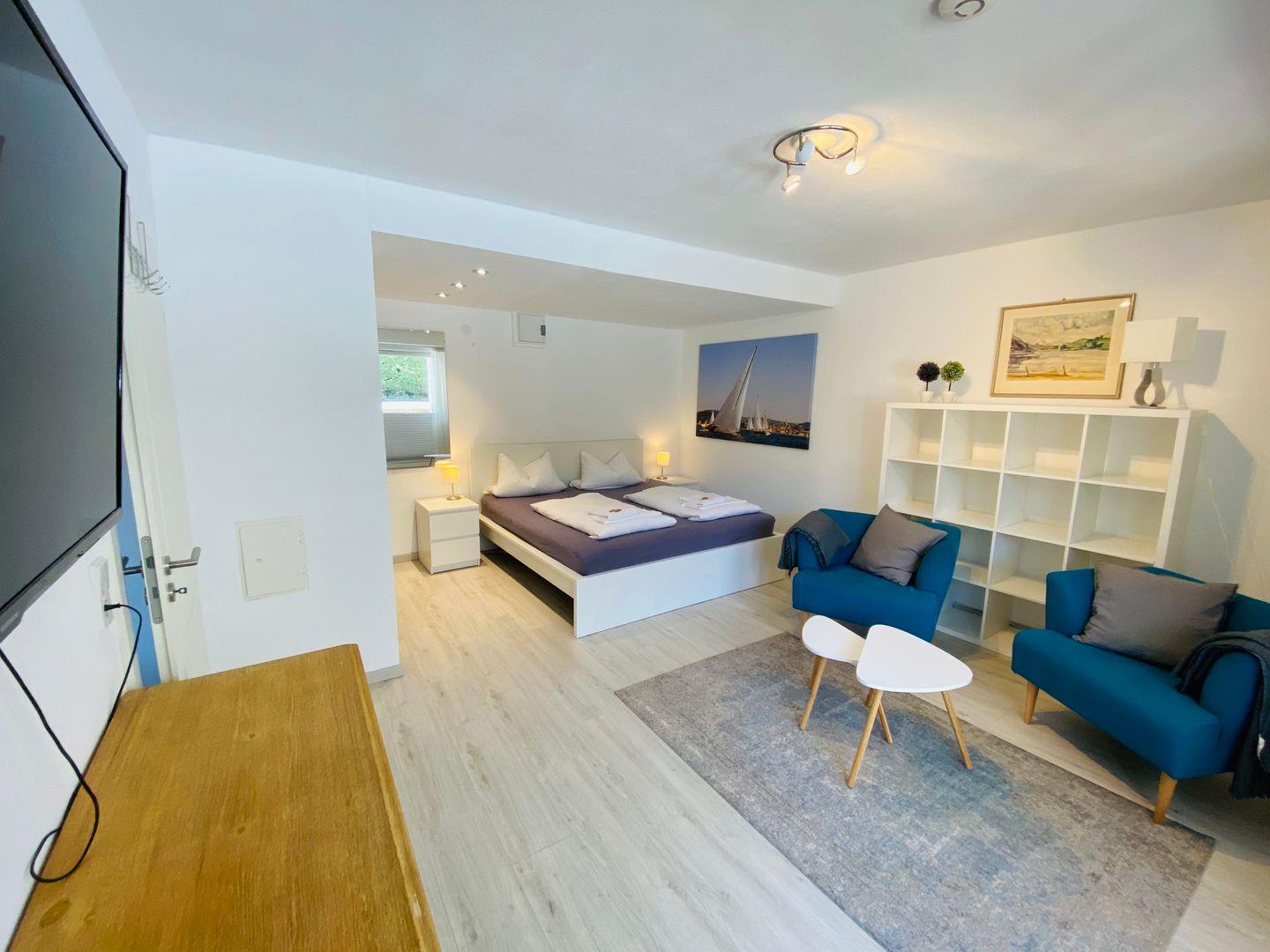 Die moderne Ferienwohnung bietet mit 45 Quadratmetern Platz für 2-3 Personen. Der großzügige Wohnbereich beeindruckt mit einer offenen Gestaltung, ausgestattet mit einer ausziehbaren Couch als zusätzliche Schlafmöglichkeit, einem einladenden Essplatz und einer modernen Küchenzeile. Die Wohnung besticht durch eine lichtdurchflutete Einrichtung, die eine angenehme Atmosphäre schafft und den modernen Charakter unterstreicht.