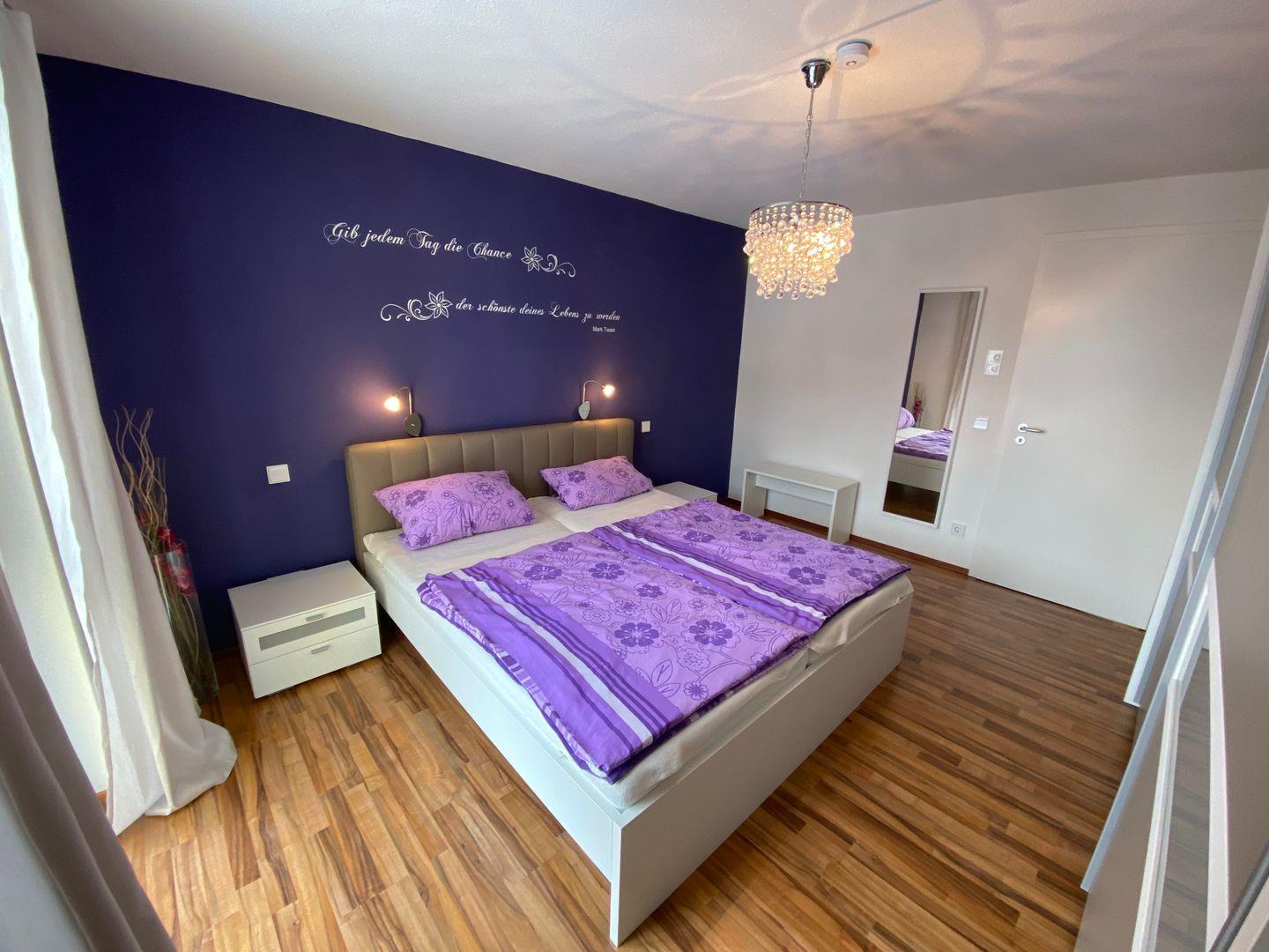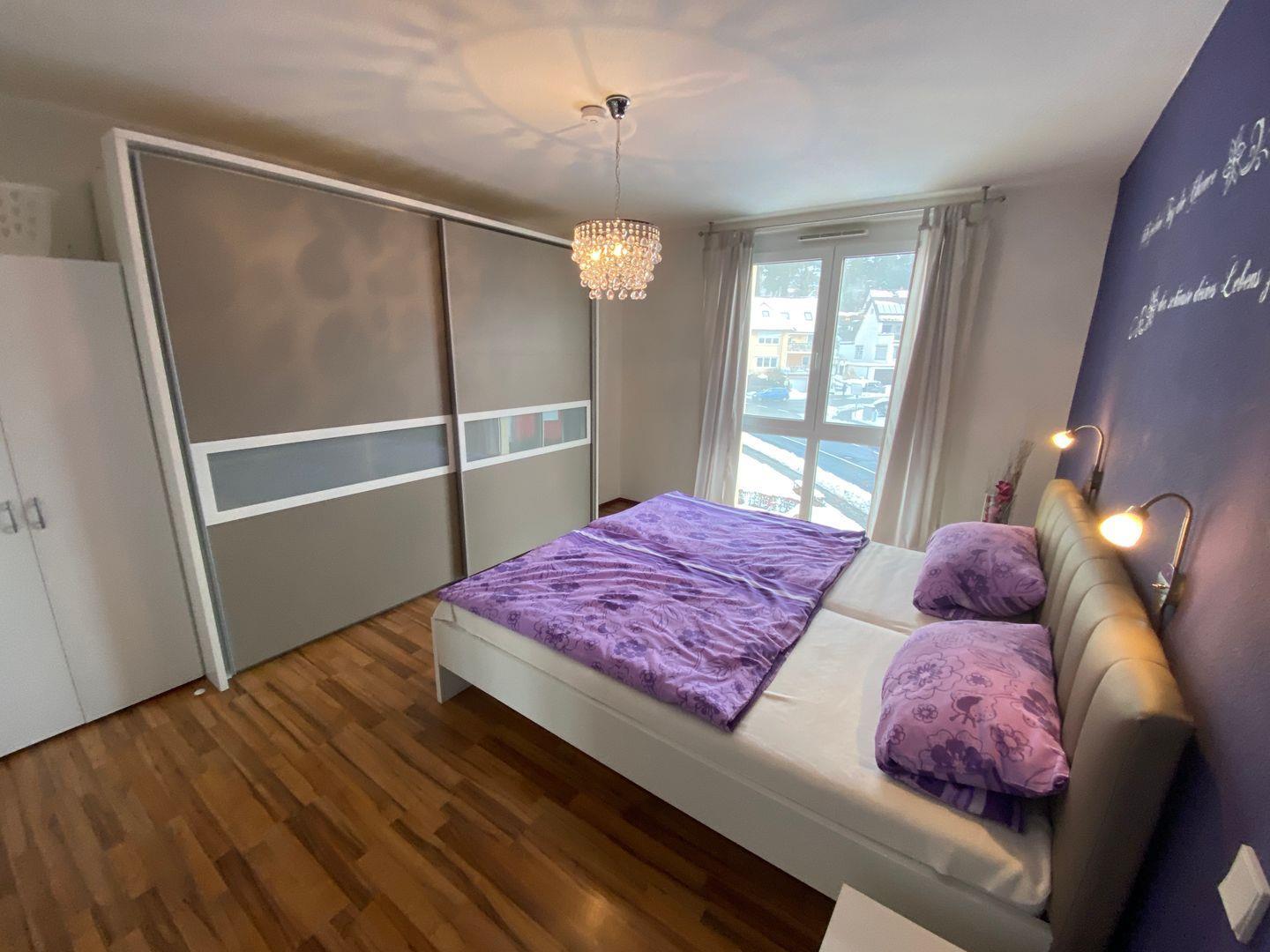 Das Schlafzimmer verfügt über ein komfortables Doppelbett und einen großzügigen Kleiderschrank, der ausreichend Stauraum bietet. Das Badezimmer präsentiert sich in modernem Design und ist mit einer Dusche, WC und Waschbecken ausgestattet.