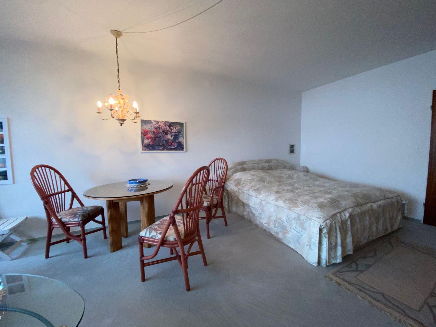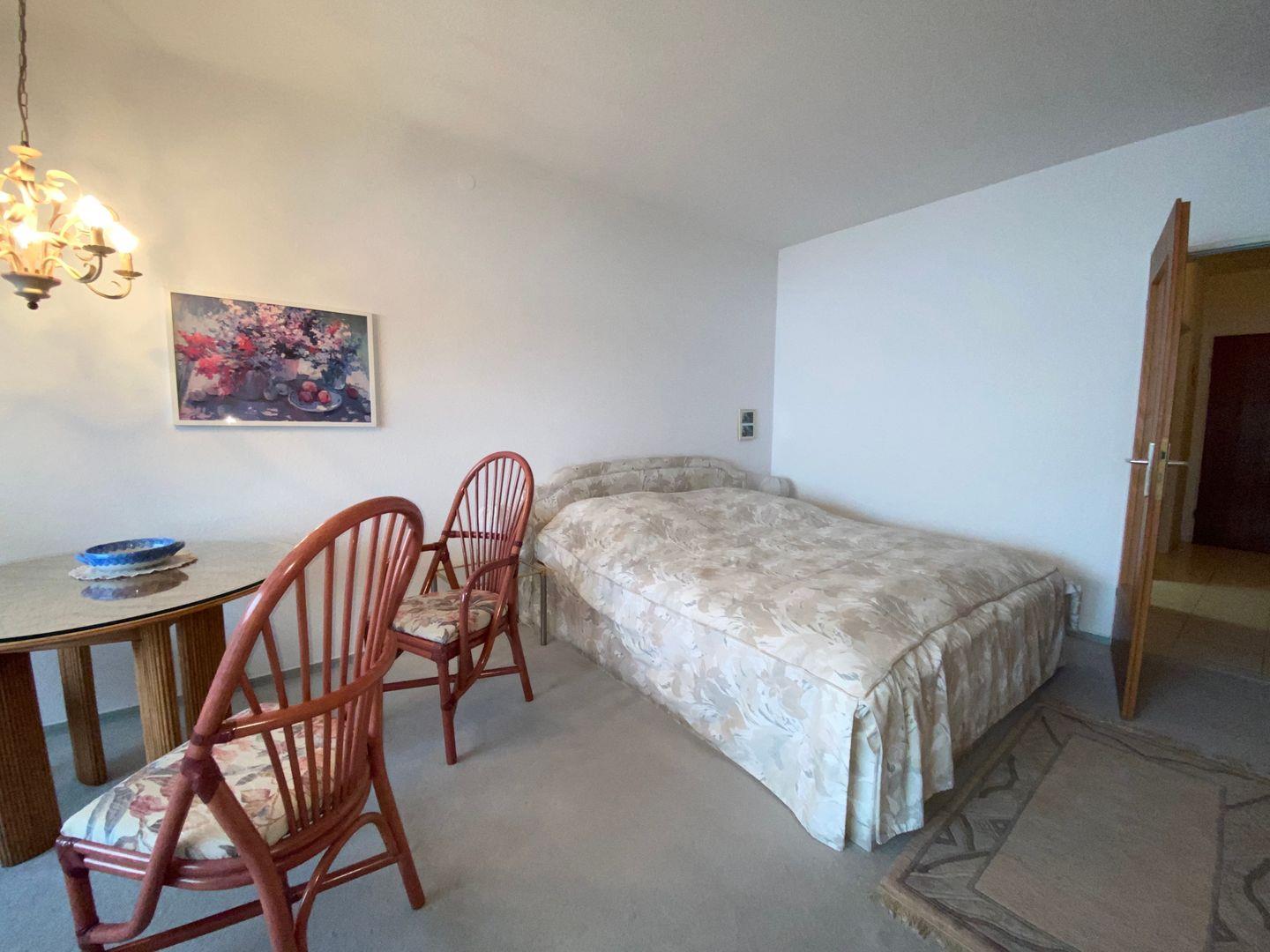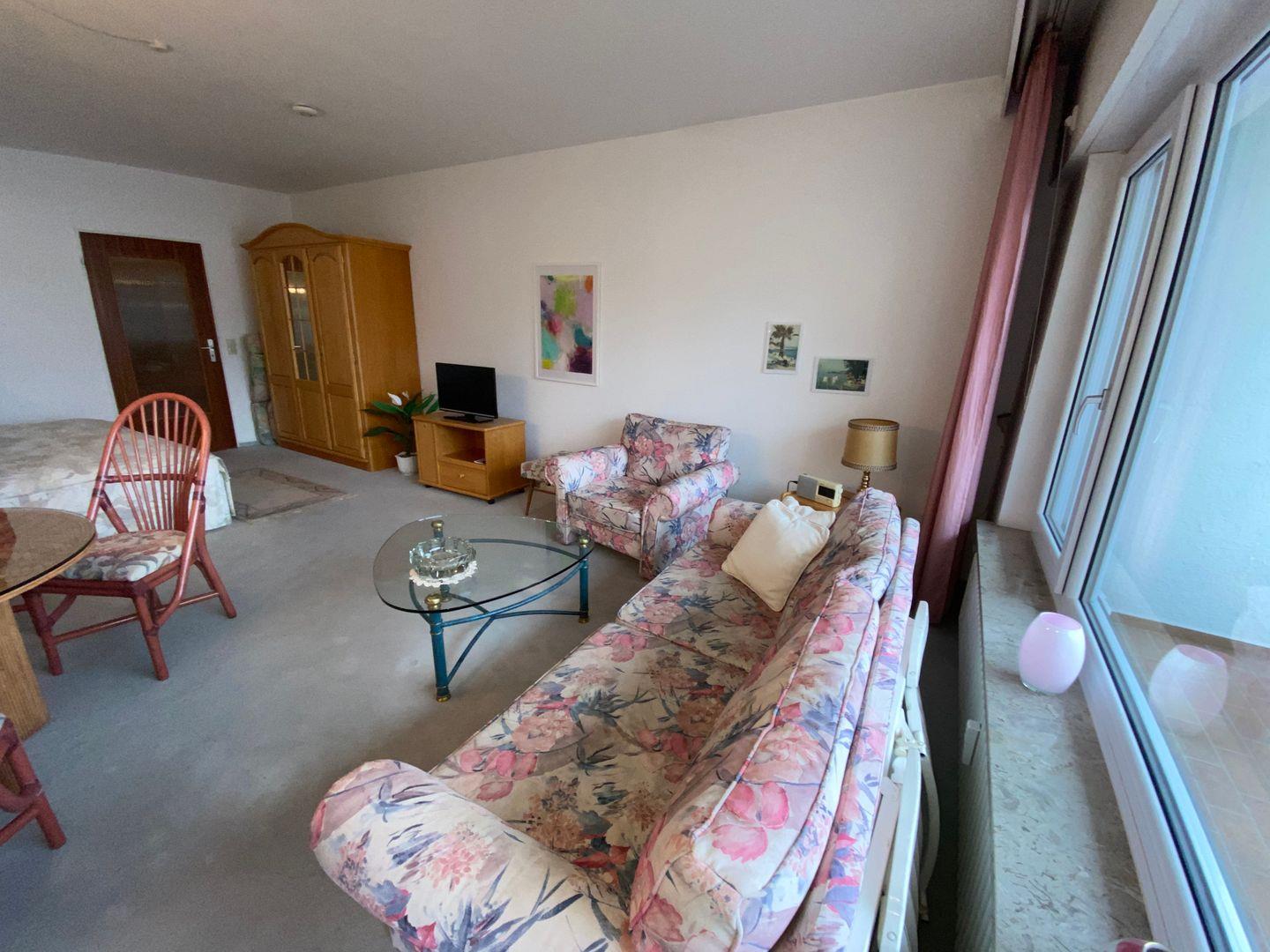 Mit einer Fläche von 50 Quadratmetern bietet die Ferienwohnung ausreichend Platz für Ihr Wohlbefinden. Der großzügige Wohn- und Schlafbereich beeindruckt durch ein komfortables Doppelbett, einen runden Esstisch für bis zu vier Personen sowie gemütliche Sitzmöglichkeiten mit einem Sofa und einem Sessel. Die großen Fensterfronten durchfluten die Ferienwohnung mit Tageslicht und verleihen ihr eine offene und einladende Atmosphäre. Vom Wohn- und Schlafbereich aus gelangen Sie auf den großzügigen Balkon.