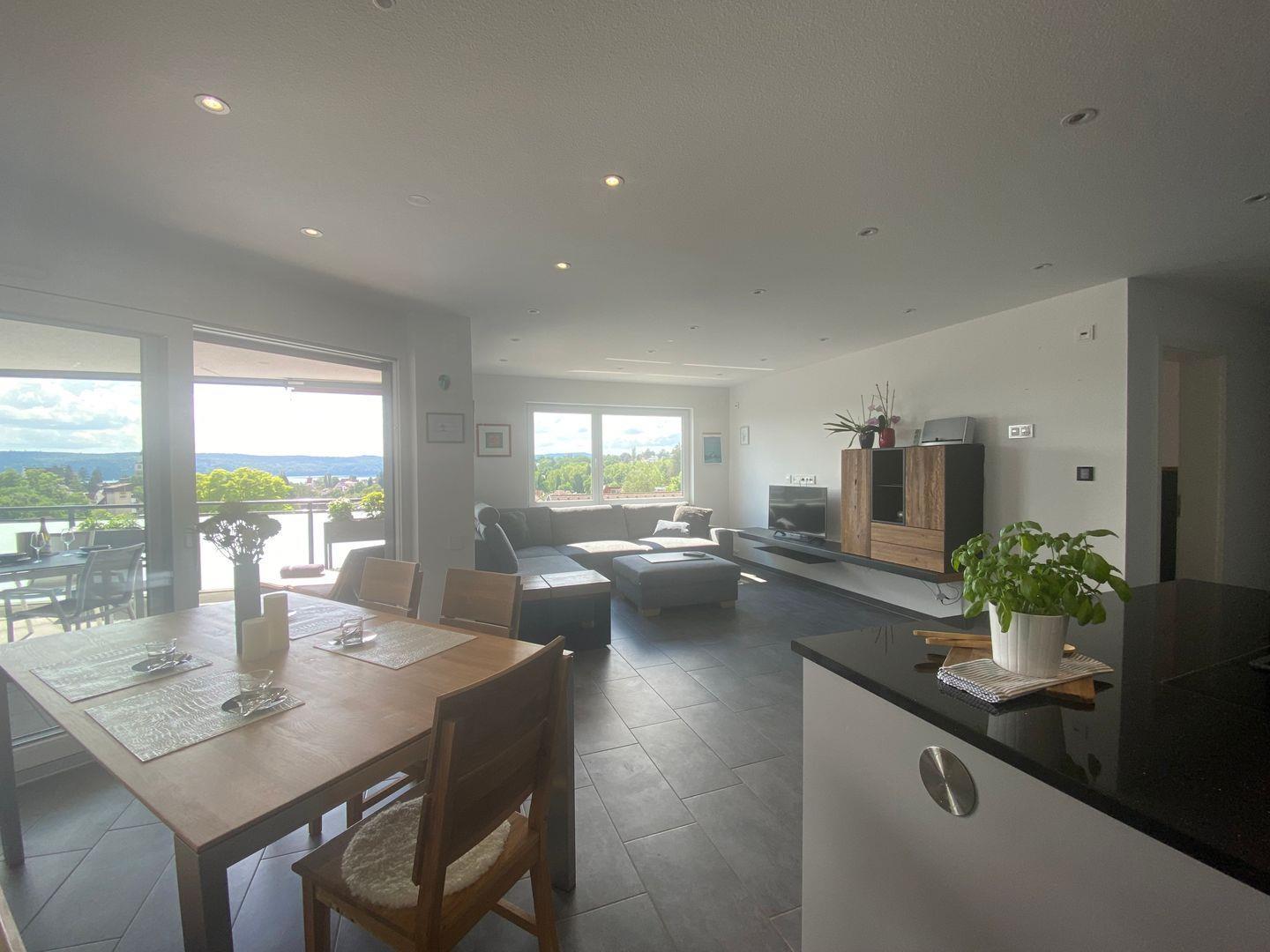 Das offene, große Wohnzimmer mit Essbereich bietet eine hochmoderne, komplett ausgestattete Wohnküche. Besonders hervorzuheben ist auch der großzügige Südwest-Westbalkon mit einem wunderschönen Blick über die Altstadt von Überlingen und den Bodensee. Die besonders hochwertige Küche bietet eine Vollausstattung an qualitätsvollen Geschirr/Gläsern, Besteck und Töpfen/Pfannen von ausgewählten Markenherstellern. Außerdem bietet die Küche Herd, Backofen, Geschirrspüler, Wasserkocher, Toaster und Kühlschrank mit Gefrierfach von namenhaften Markenherstellern. Für Kaffeeliebhaber steht eine qualitätsvolle Nespresso Kaffeemaschine mit Kapseln oder eine Kaffeemaschine für Filterkaffee bereit.